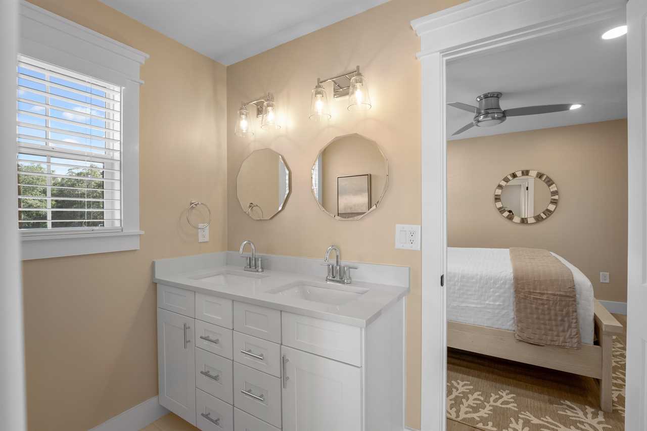 Head upstairs to the third floor, where the remaining bedrooms are located. Bedroom 2 offers a calming coastal retreat with a Queen bed, private en-suite with double vanity and walk-in shower, plus access to its own screened-in porch deck. Bedroom 3 has a Queen bed and Bedroom 4 features a King bed. Both share a Jack-and-Jill style bathroom with a double vanity and a tub/shower combination.