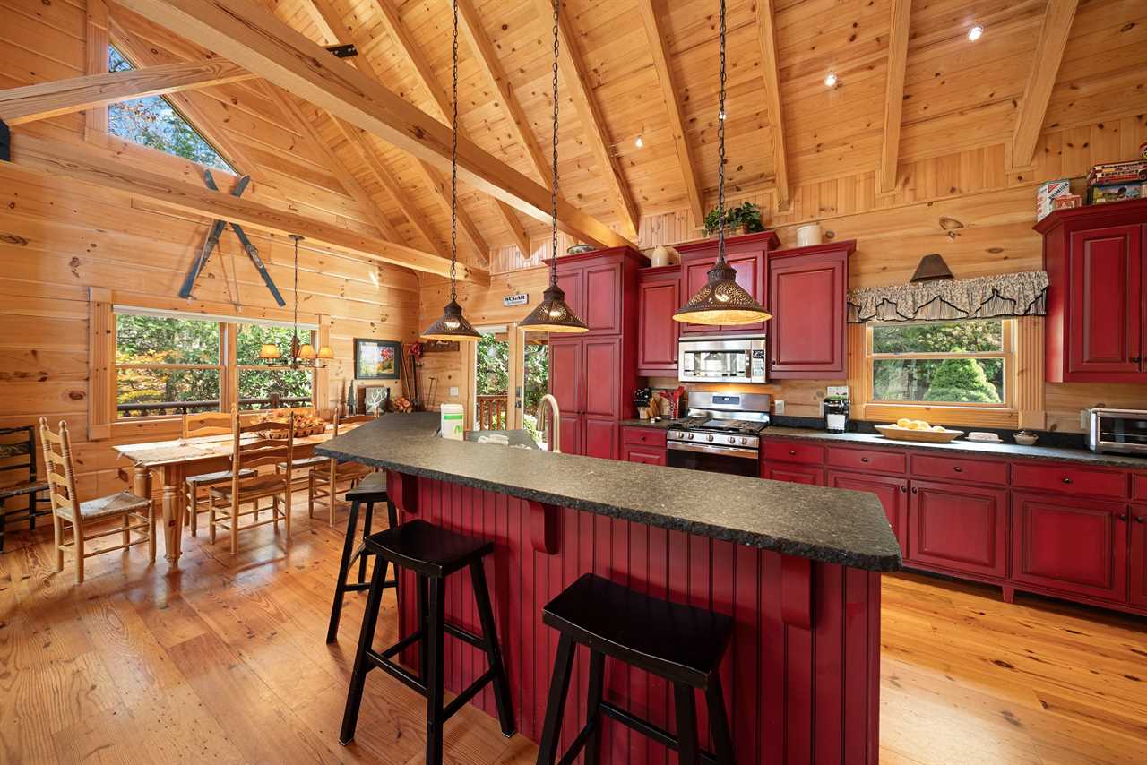 Sugars Cozy Cabin is a beautifully crafted log cabin with an open-concept main floor. The great room features vaulted ceilings with exposed beams, warm wood walls, and a stacked stone fireplace that creates a cozy focal point. Sink into the leather sofa and relax by the gas fireplace after a day on the slopes or exploring the High Country.