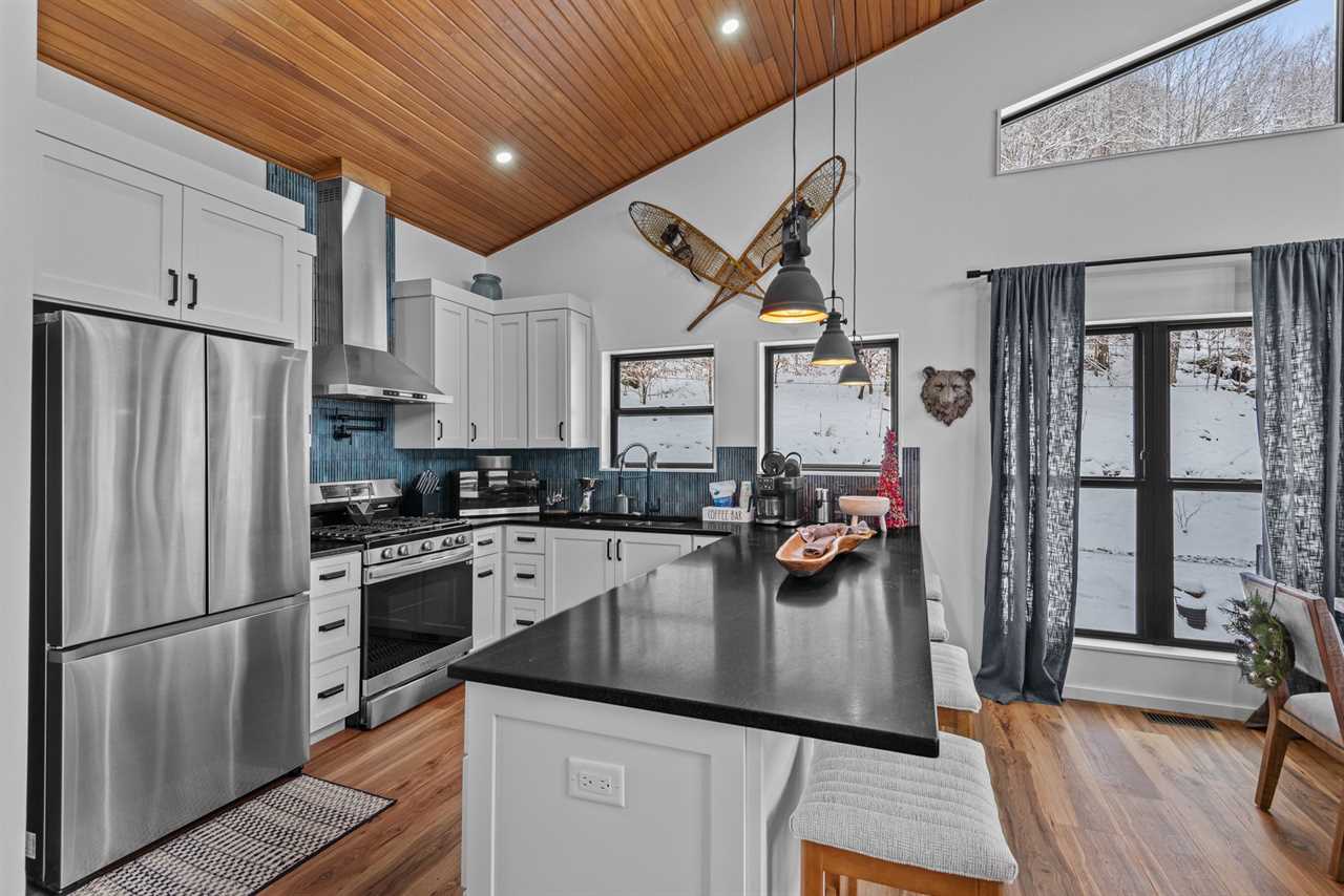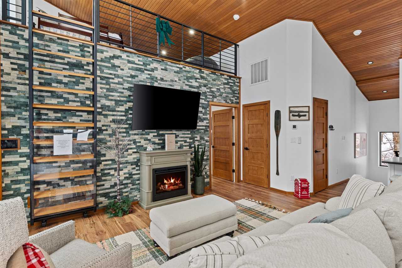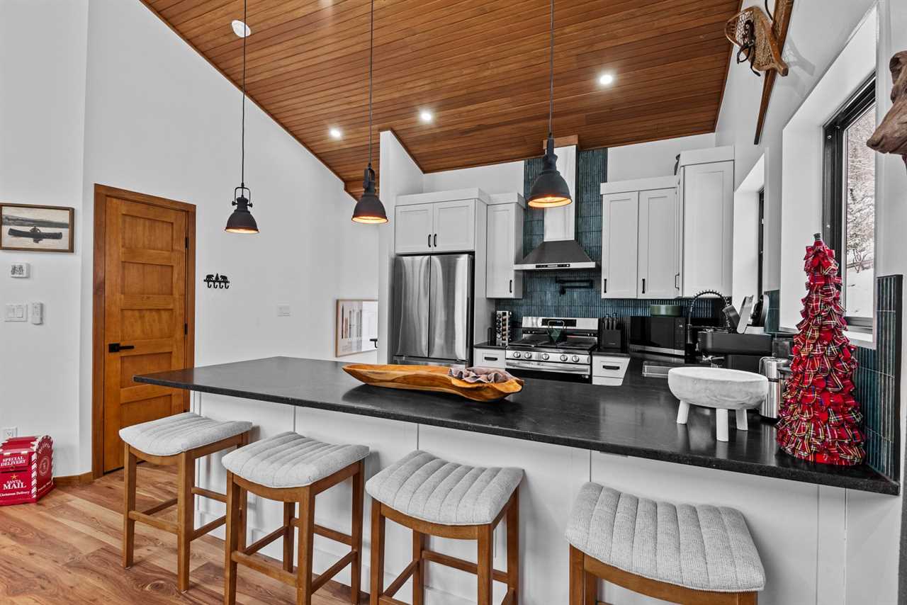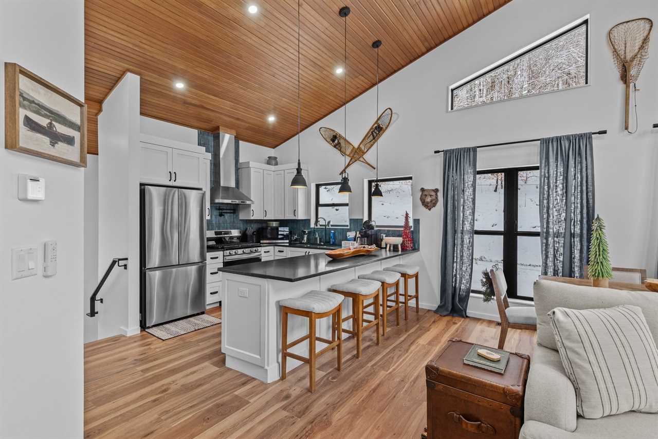 Step into an open-concept main level with vaulted tongue-and-groove ceilings and an abundance of natural light. The fully stocked kitchen features stainless steel appliances, quartz countertops, and ample workspace for preparing everything from casual breakfasts to family feasts. Enjoy meals together at the dining table for six, with additional seating for four at the nearby bar.