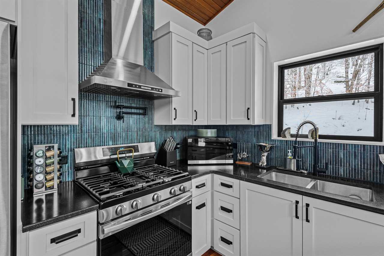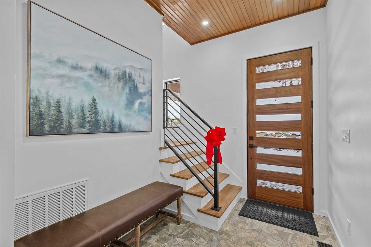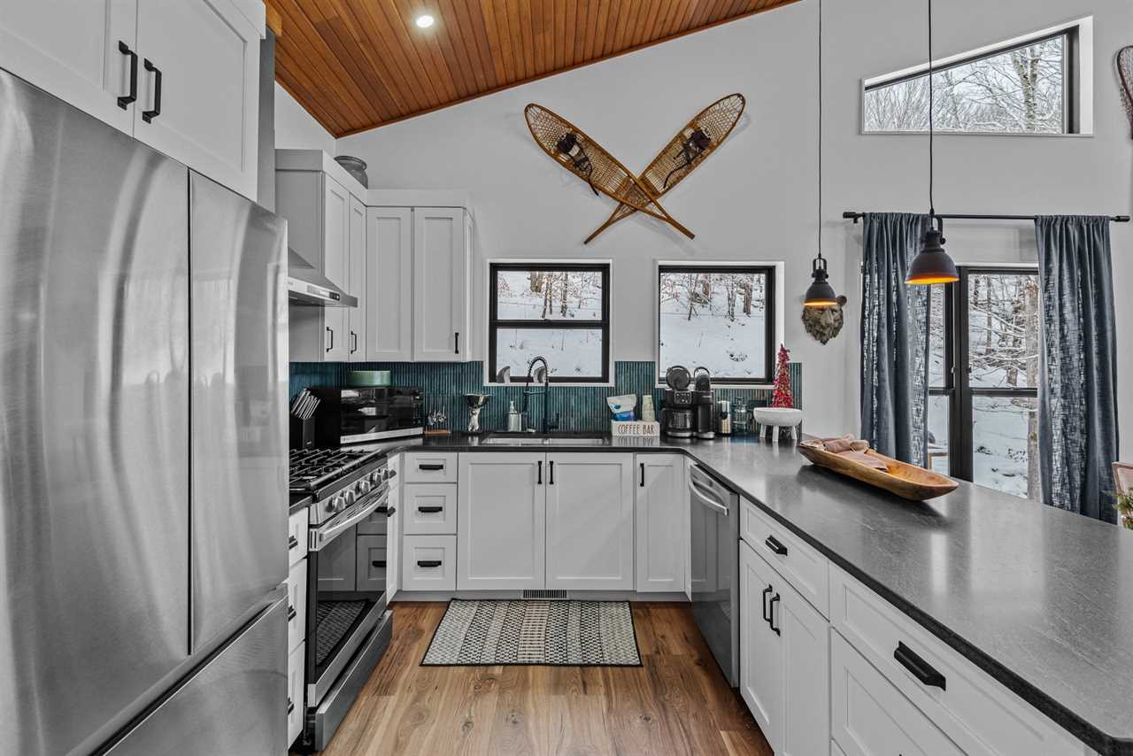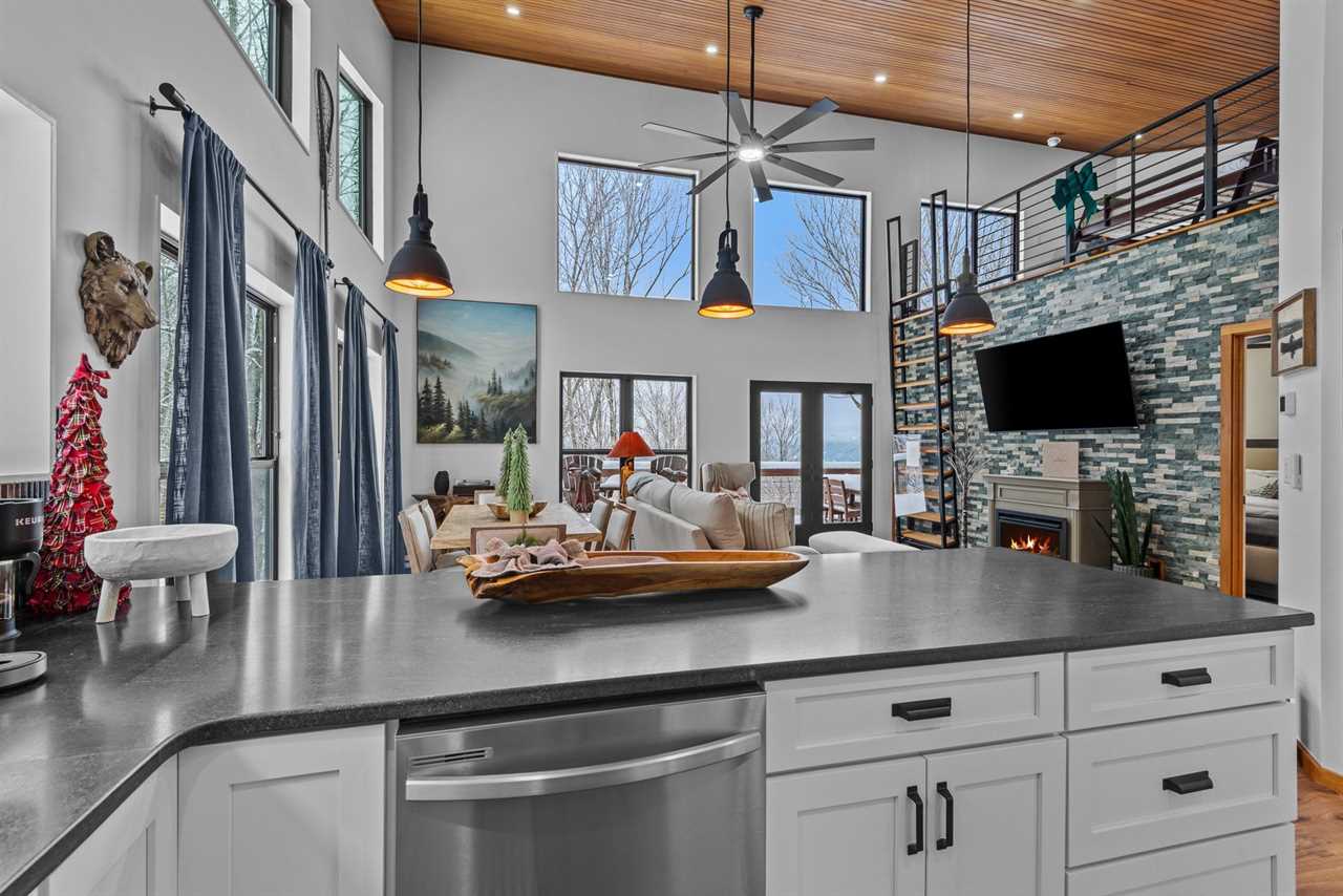 Step into an open-concept main level with vaulted tongue-and-groove ceilings and an abundance of natural light. The fully stocked kitchen features stainless steel appliances, quartz countertops, and ample workspace for preparing everything from casual breakfasts to family feasts. Enjoy meals together at the dining table for six, with additional seating for four at the nearby bar.