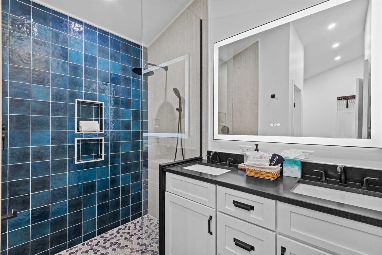 The ensuite bathroom continues the spa-inspired feel, offering a beautifully tiled shower and a quartz double vanity.