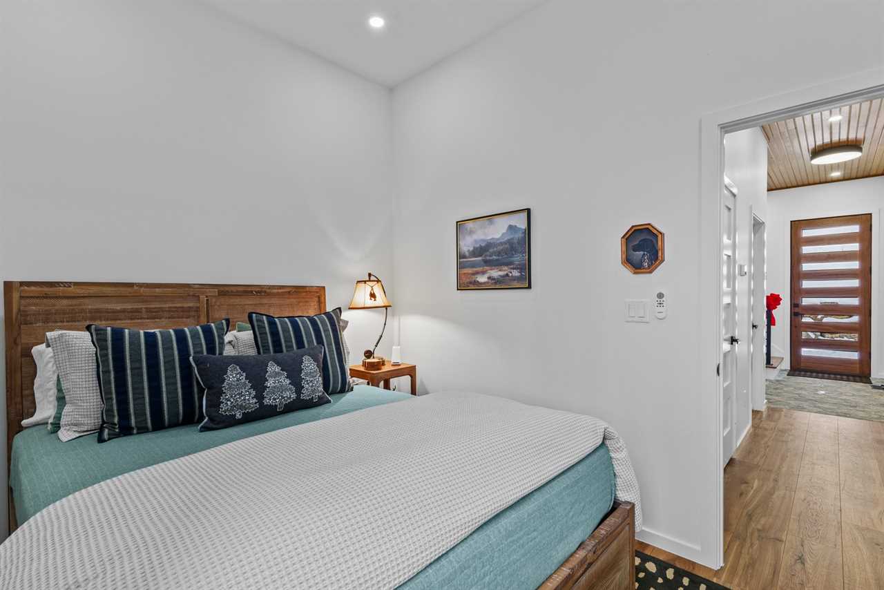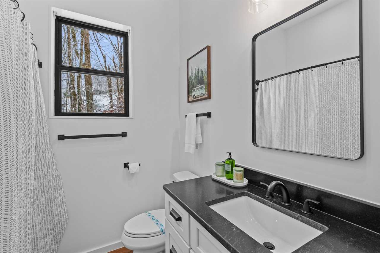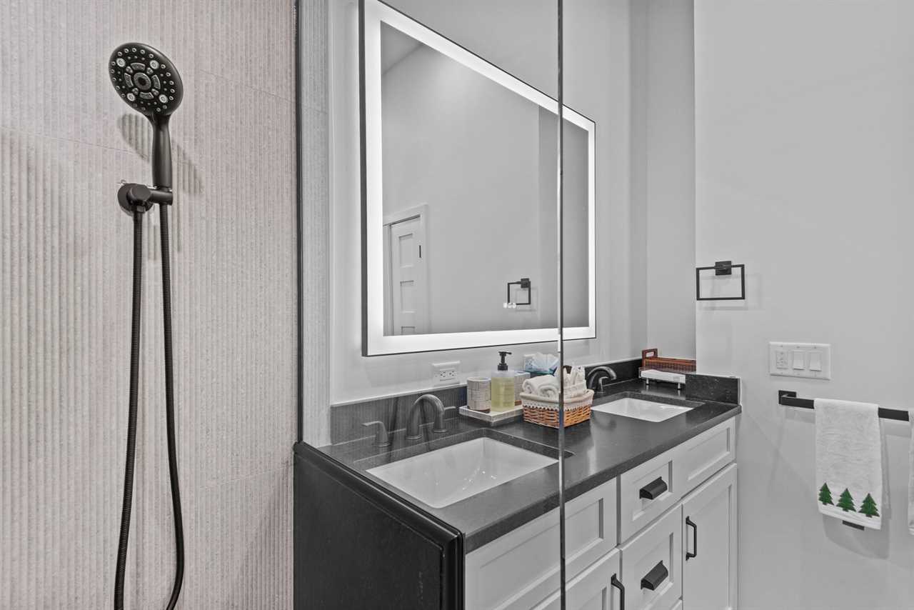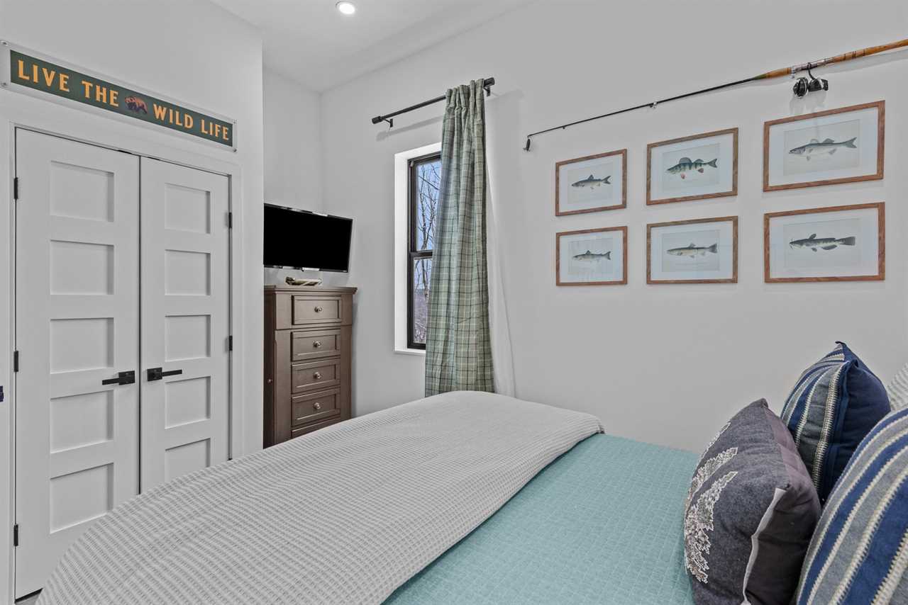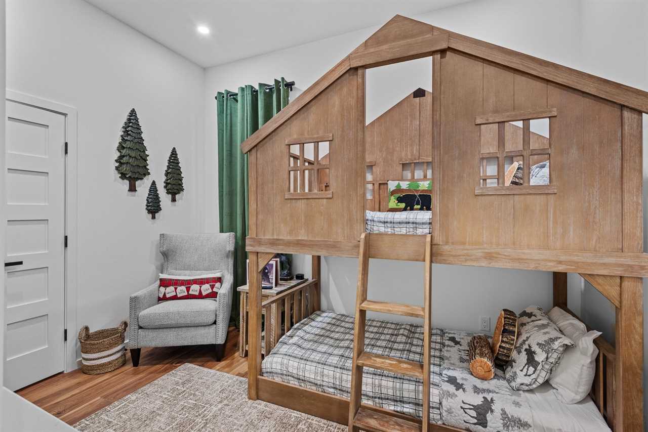 Downstairs, you'll find a beautifully decorated queen bedroom along with a playful bunk room featuring a full-over-full cabin-themed bunk bed. The bunk room is stocked with charming books and fun touches that little ones will love. Each room includes a private TV, and a shared full bathroom is conveniently located nearby, offering a quartz vanity and a shower-tub combo.