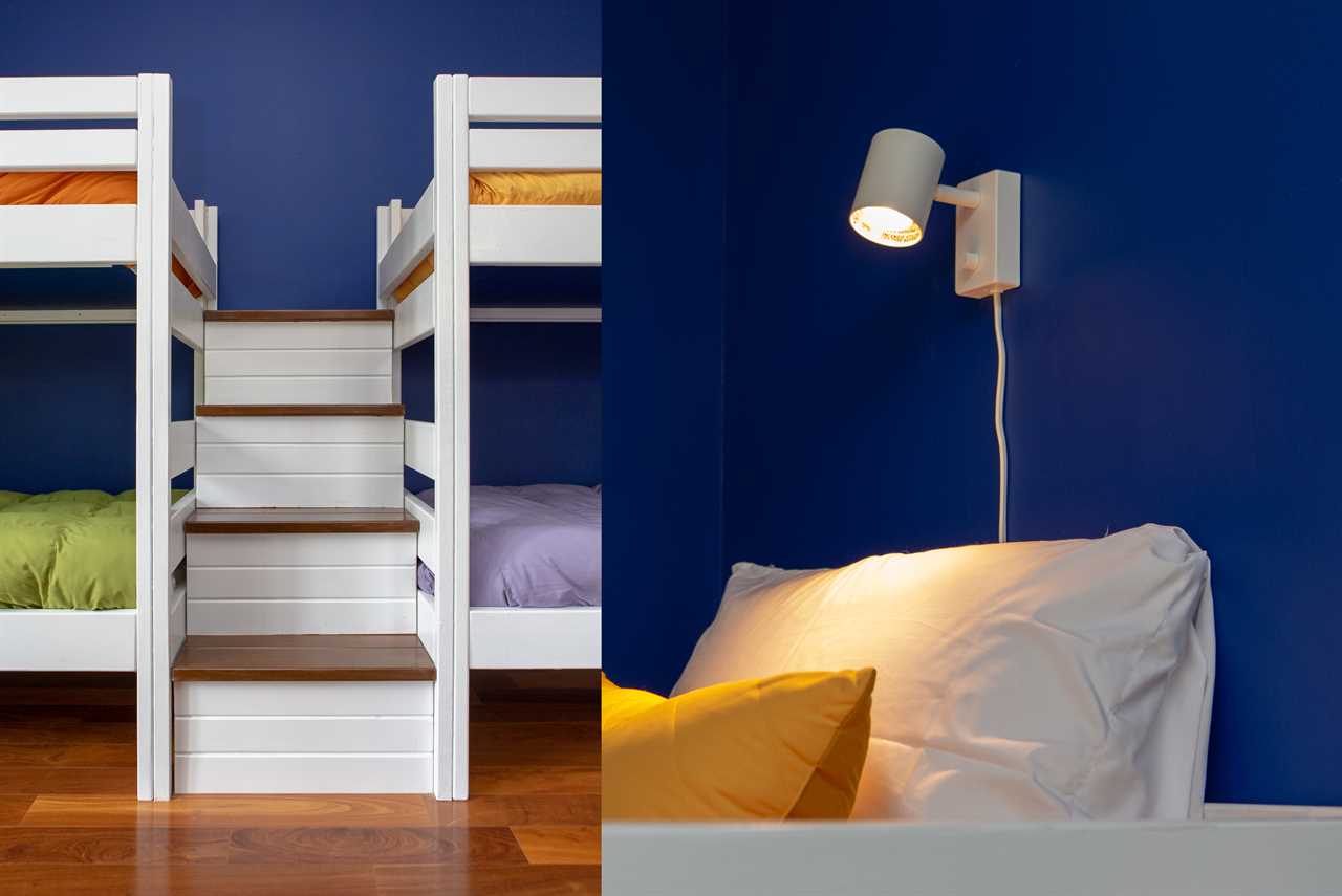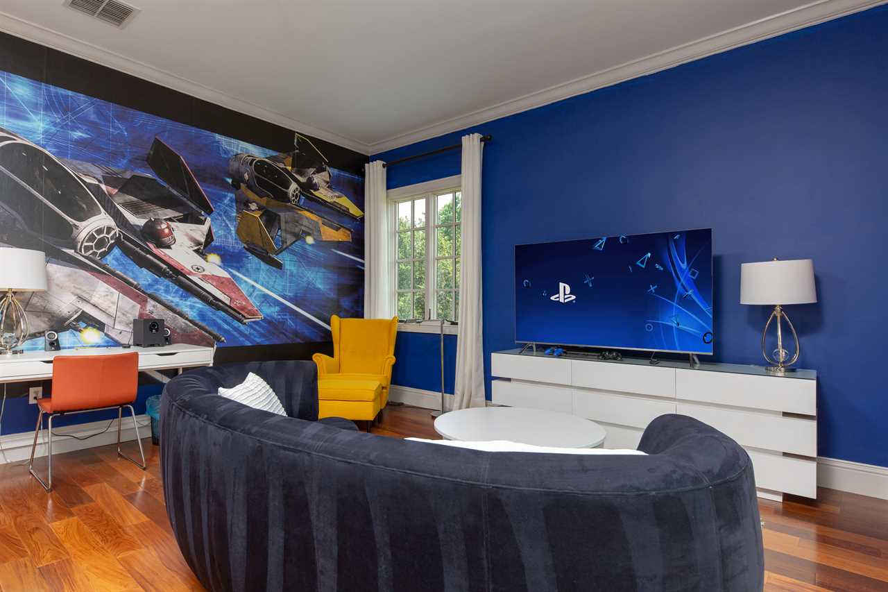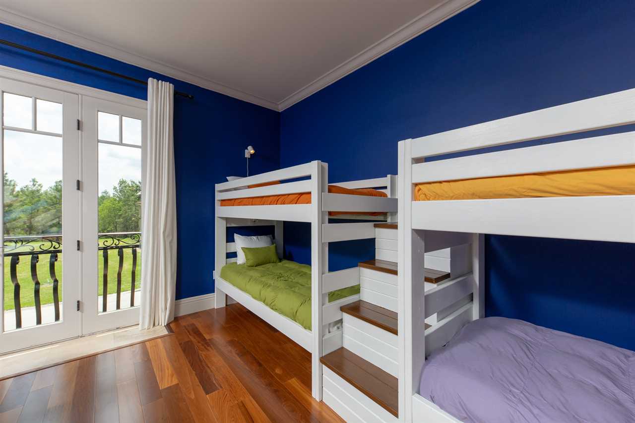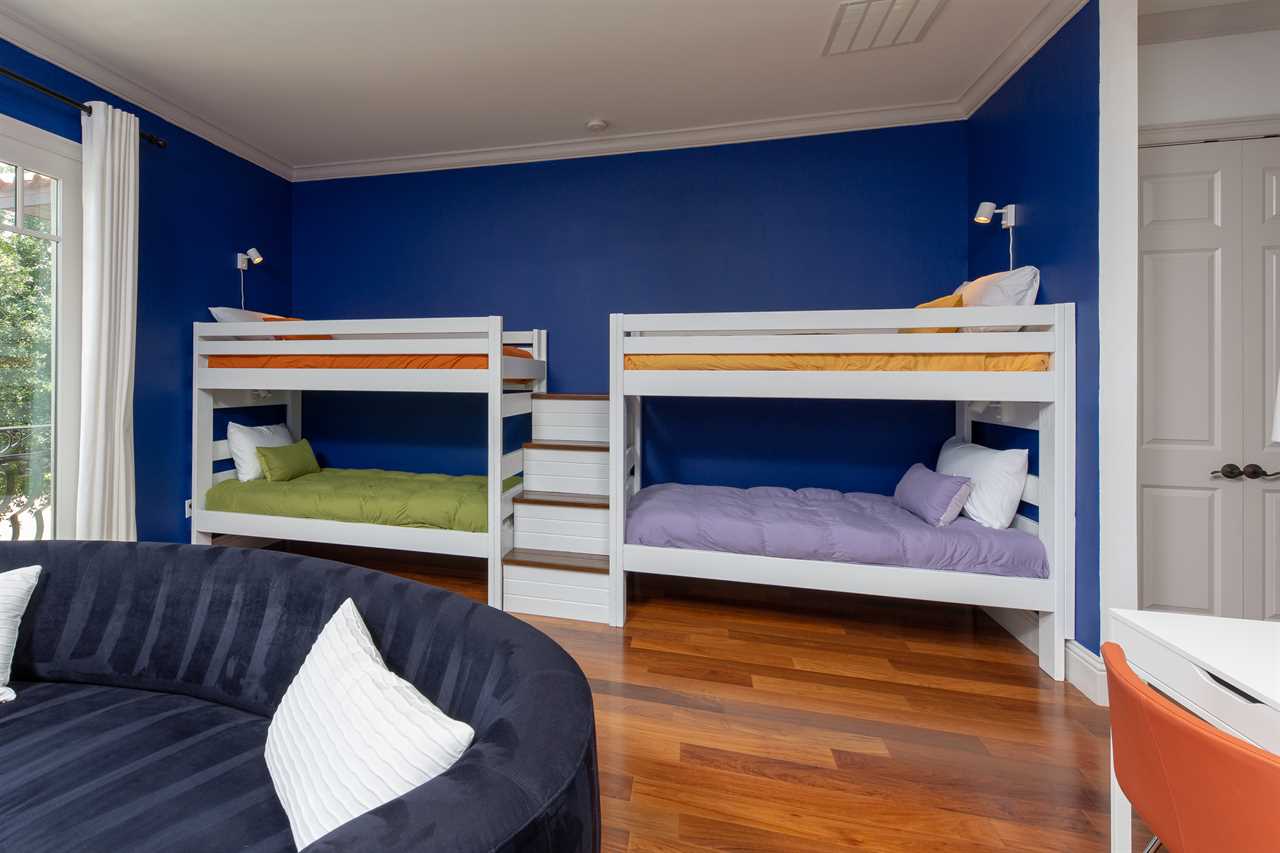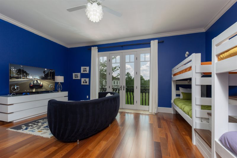 Upstairs you find another generously sized master bedroom with a King bed, a SMART TV, and ensuite bathroom. Another upstairs bedroom is beautifully furnished with a queen bed, SMART TV, and provides access through the French doors to the balcony overlooking the pool and conservation area beyond. Rounding out the bedrooms is a dormitory-sized bunk bedroom that sleeps six. Two of the bunk beds are extra long for the fully grown but young at heart. The room has a fabulous, blue suede sofa perfect for enjoying the 65-inch SMART TV and for playing video games on the Playstation PS4 console.