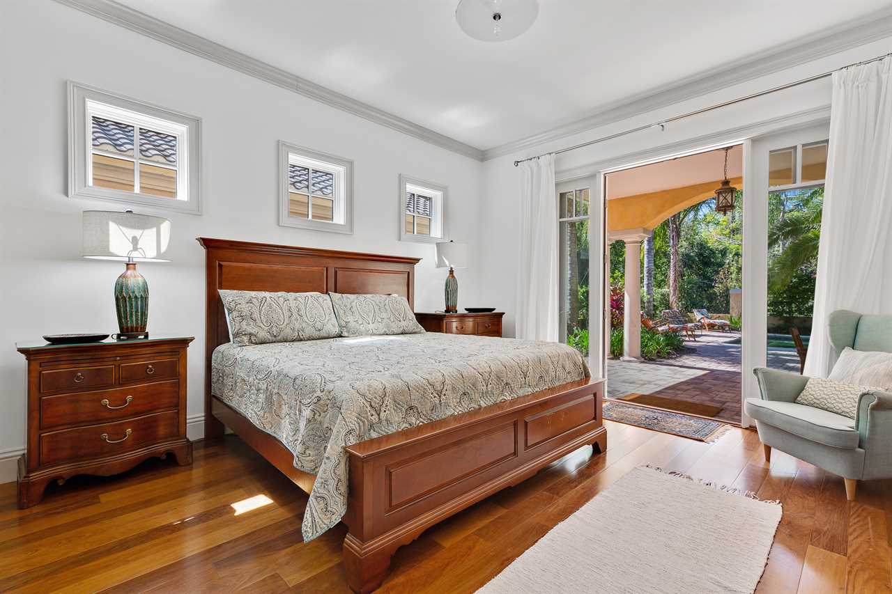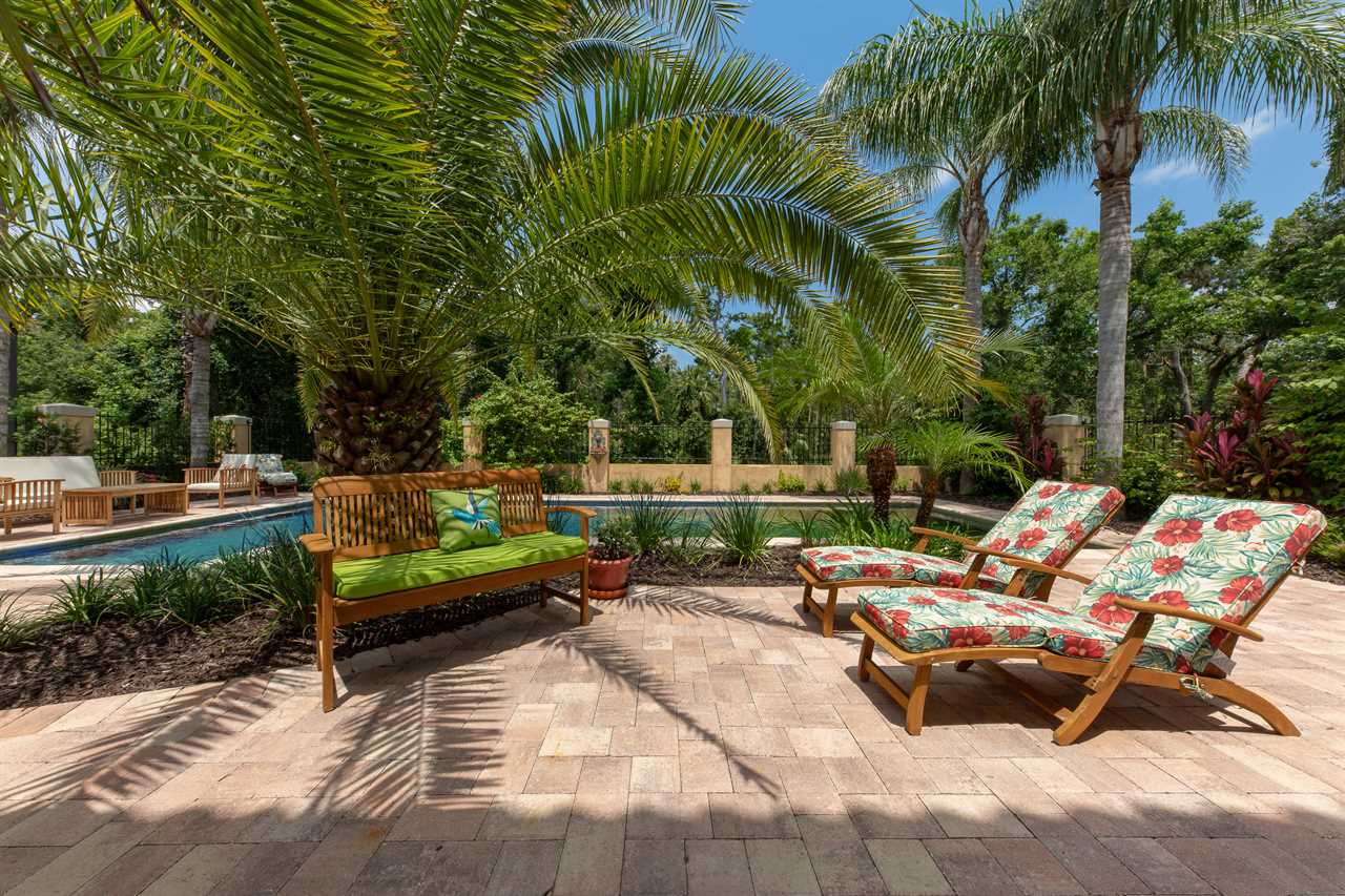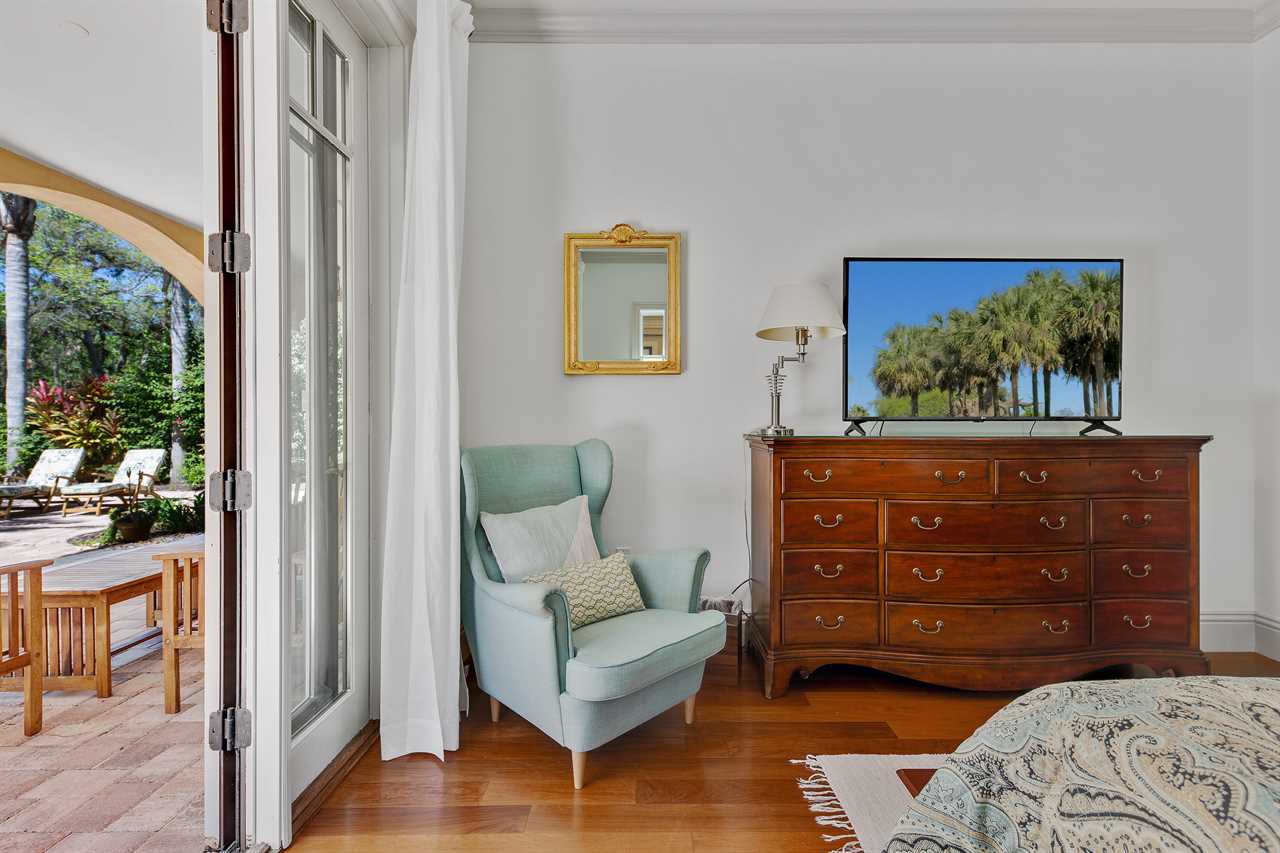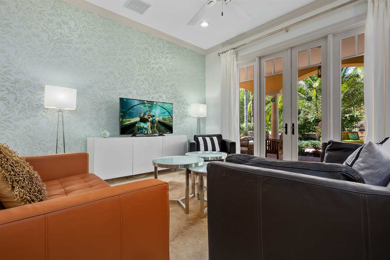 The view through the French doors to the garden and the oasis pool beyond opens up as you enter the great room and the kitchen downstairs. A dining table seating eight and island bar seating for four more ensure that everyone can eat together. The kitchen is fully equipped with a high-end gas cook-top and professional, high-efficiency, silent exhaust system driven by an outside fan motor. A wall oven, a quiet dishwasher, a spacious fridge/freezer, and a microwave drawer round out this well-equipped kitchen. Comfortable seating area with a cluster of movable coffee tables and a SMART TV invite you to stay and relax after dinner with your family and friends. Step outside to enjoy dining at a table seating six, conversations at the patio sofa and chairs, and lounging around the pool in the teak steamer chairs surrounded by Florida's tropical nature.