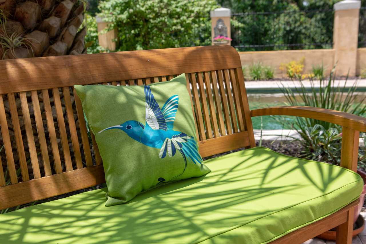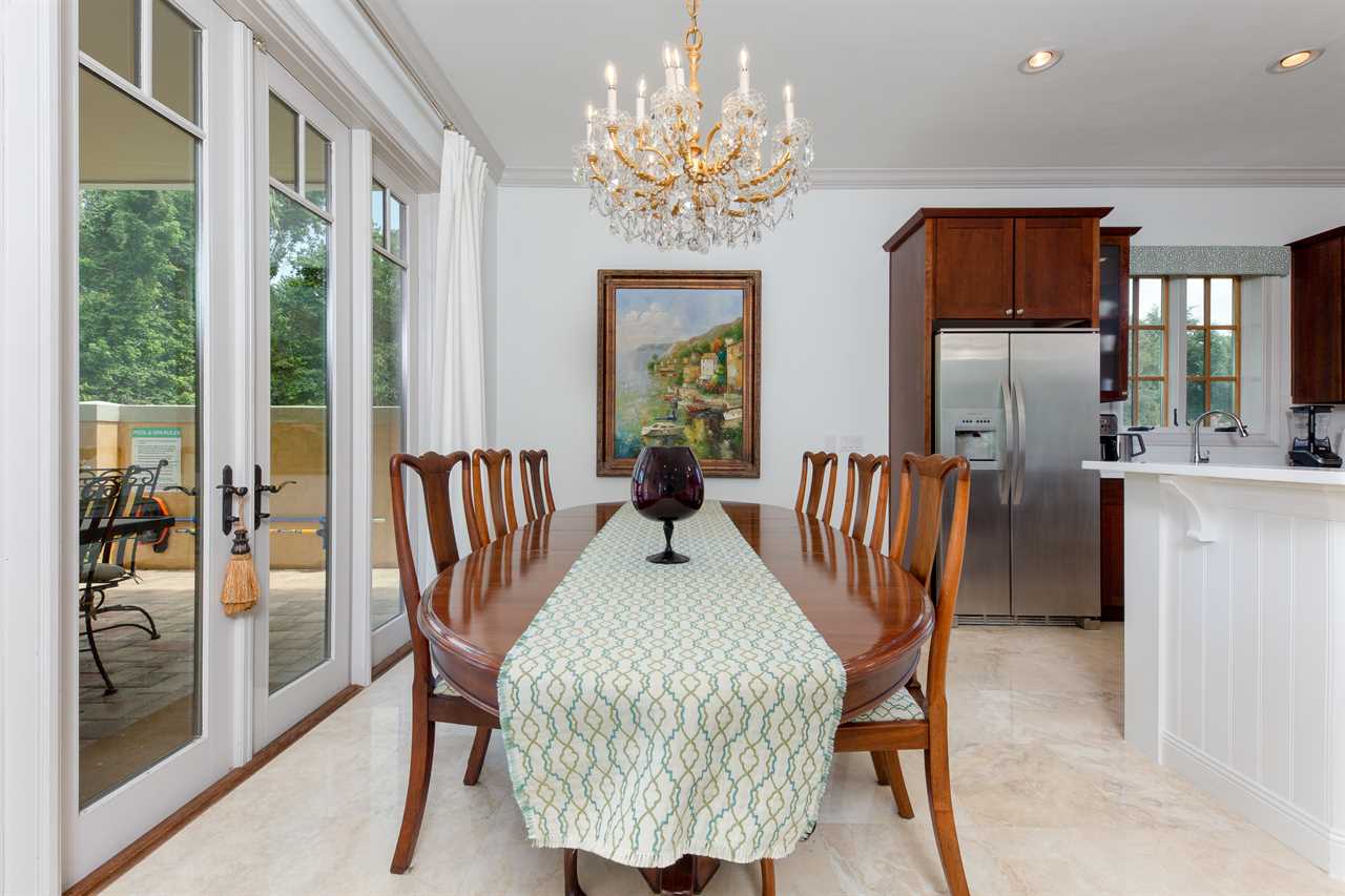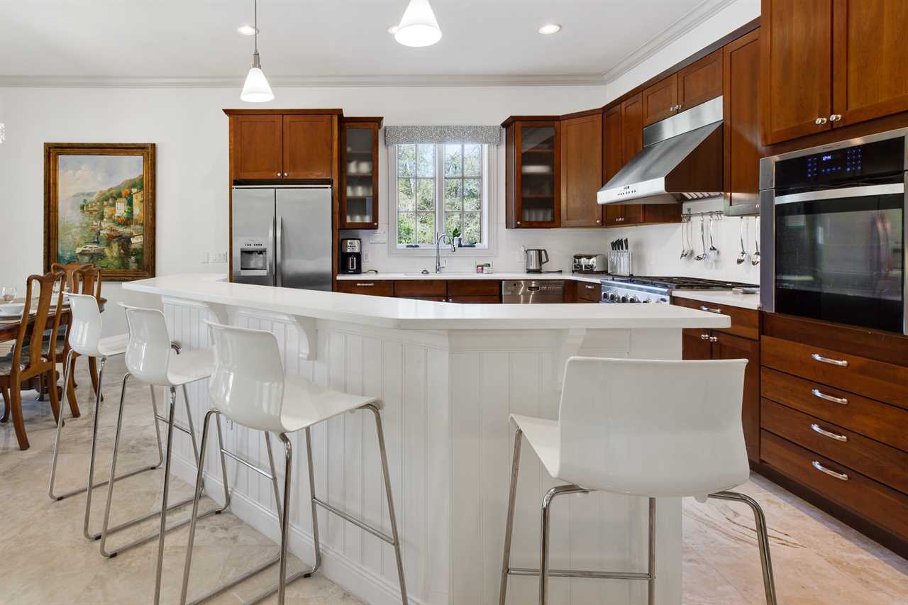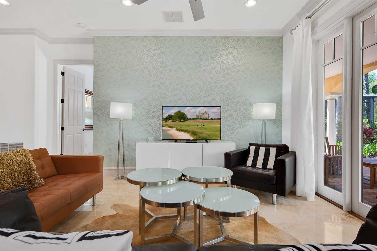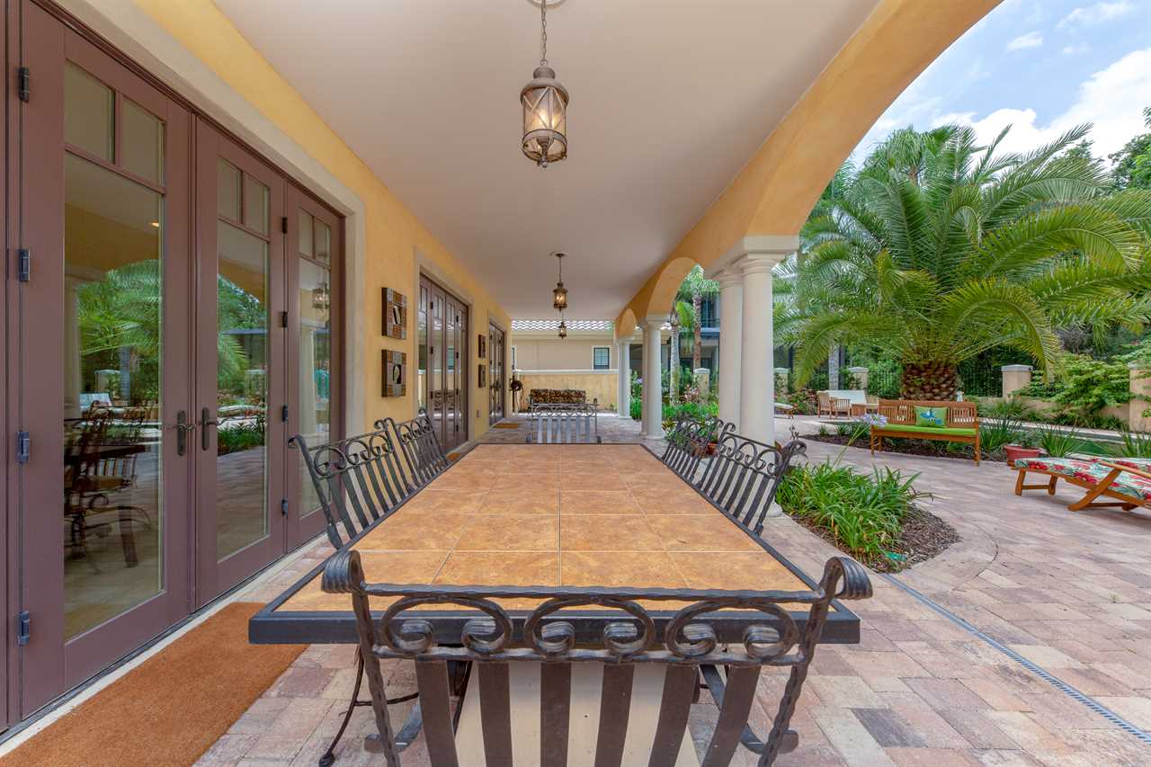 The view through the French doors to the garden and the oasis pool beyond opens up as you enter the great room and the kitchen downstairs. A dining table seating eight and island bar seating for four more ensure that everyone can eat together. The kitchen is fully equipped with a high-end gas cook-top and professional, high-efficiency, silent exhaust system driven by an outside fan motor. A wall oven, a quiet dishwasher, a spacious fridge/freezer, and a microwave drawer round out this well-equipped kitchen. Comfortable seating area with a cluster of movable coffee tables and a SMART TV invite you to stay and relax after dinner with your family and friends. Step outside to enjoy dining at a table seating six, conversations at the patio sofa and chairs, and lounging around the pool in the teak steamer chairs surrounded by Florida's tropical nature.