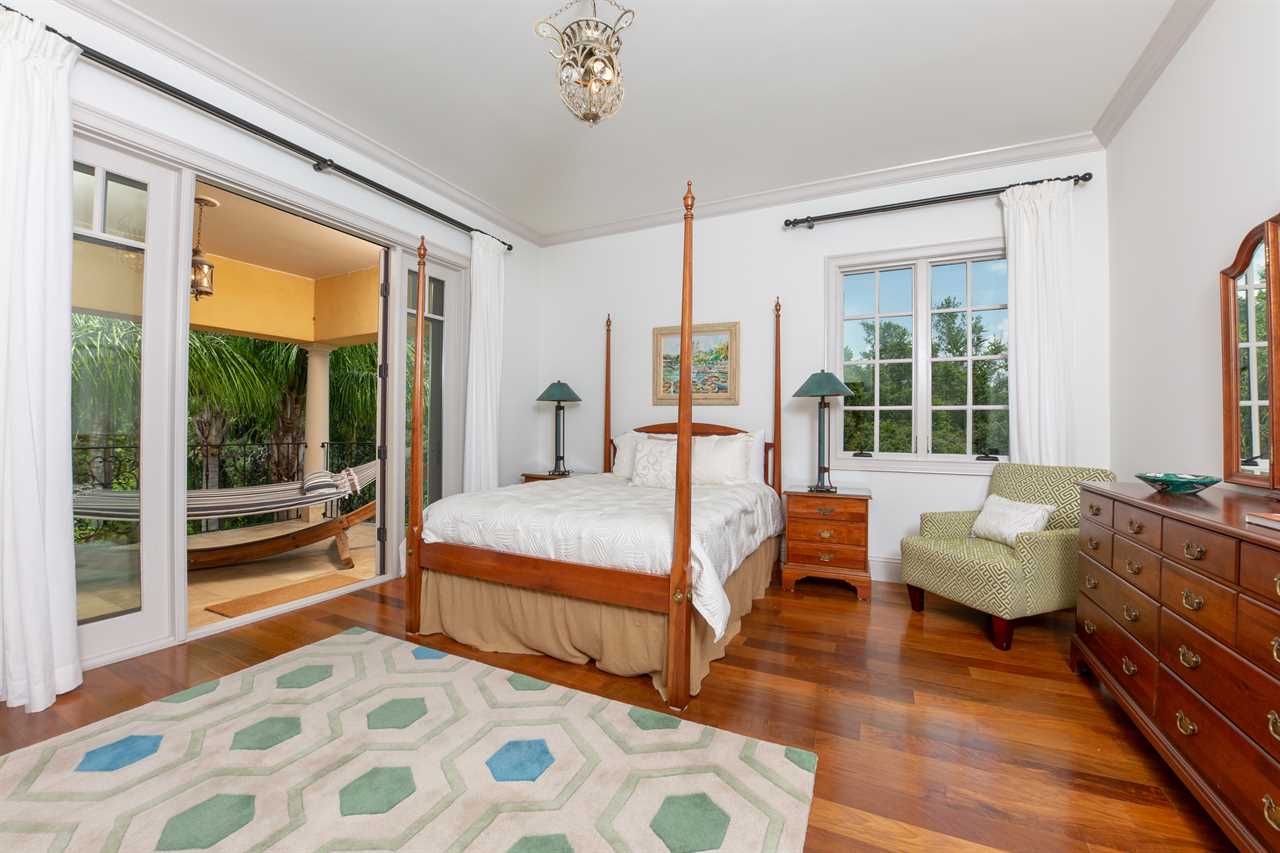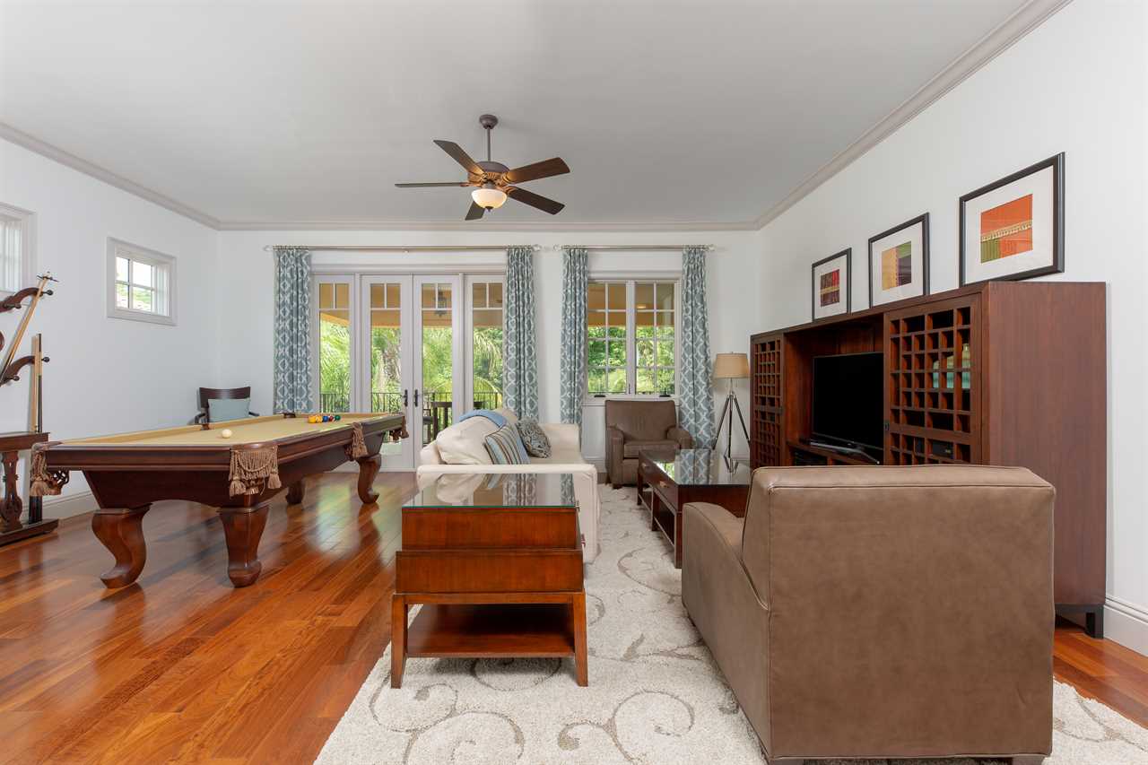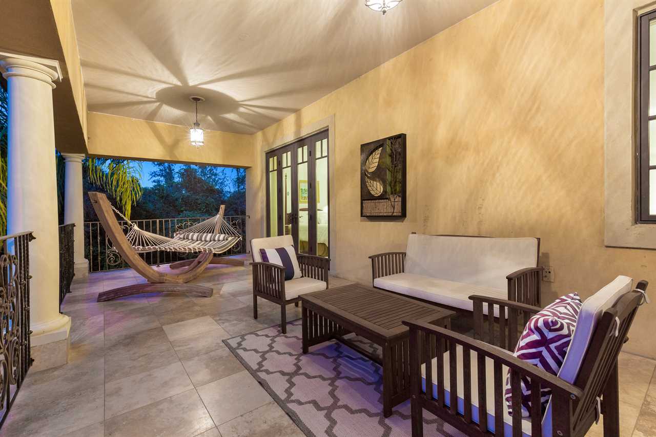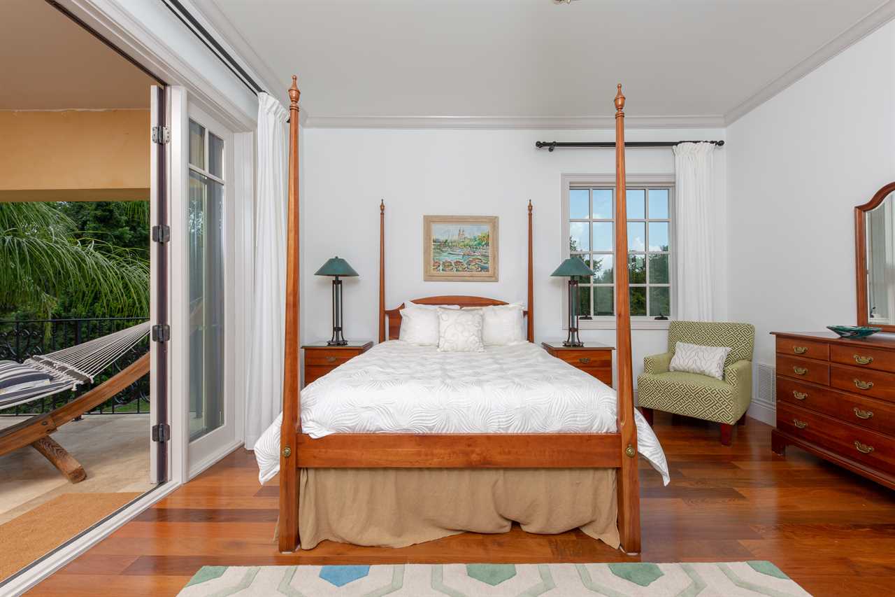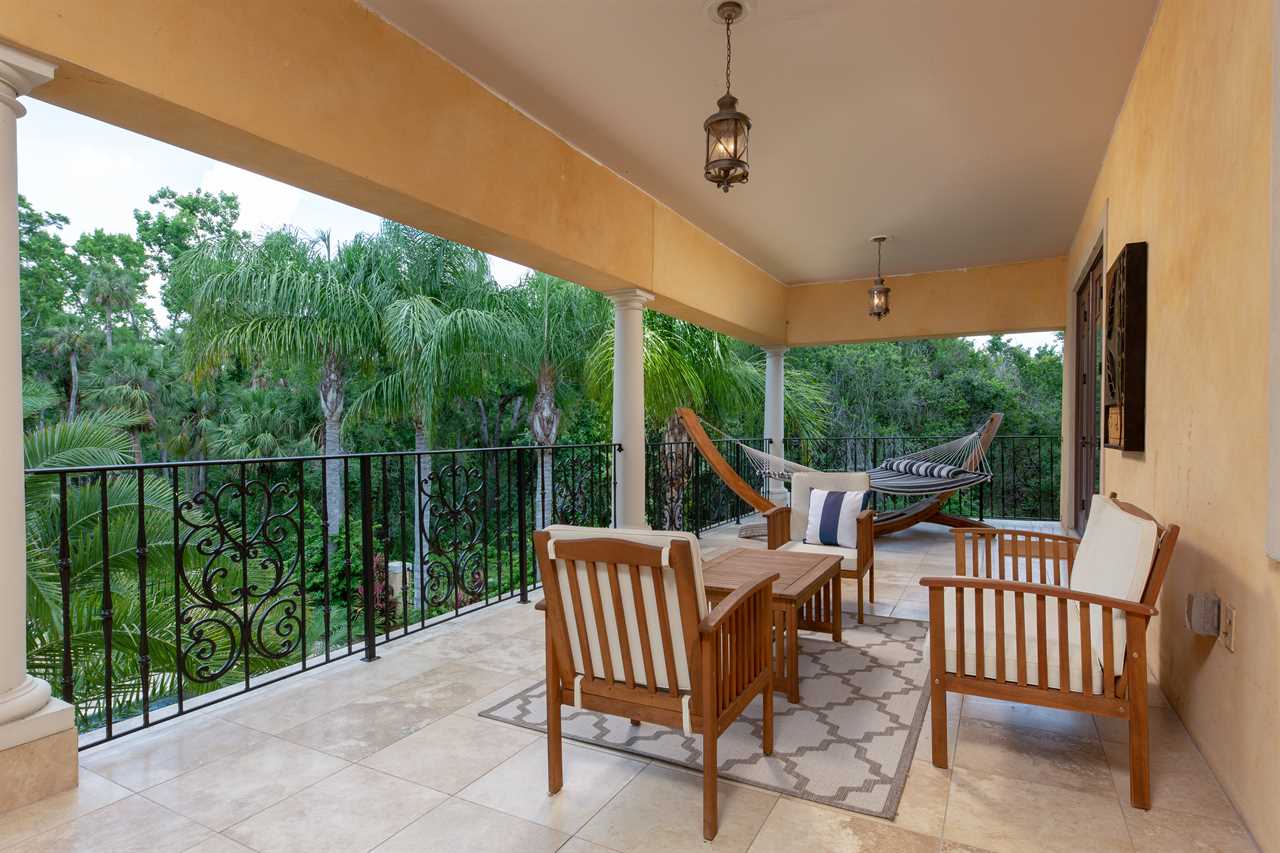 The living room upstairs provides another comfortable sitting area with a SMART TV and stereo equipment to enhance the movies' soundtrack. Adjacent is a mahogany, slate-bed pool table. A set of French doors lets everyone 'spill-out' to the house-width, 12-ft deep balcony where there is more space to enjoy the outdoors; a bar table for four and a sitting area for four. A hammock beckons beyond.