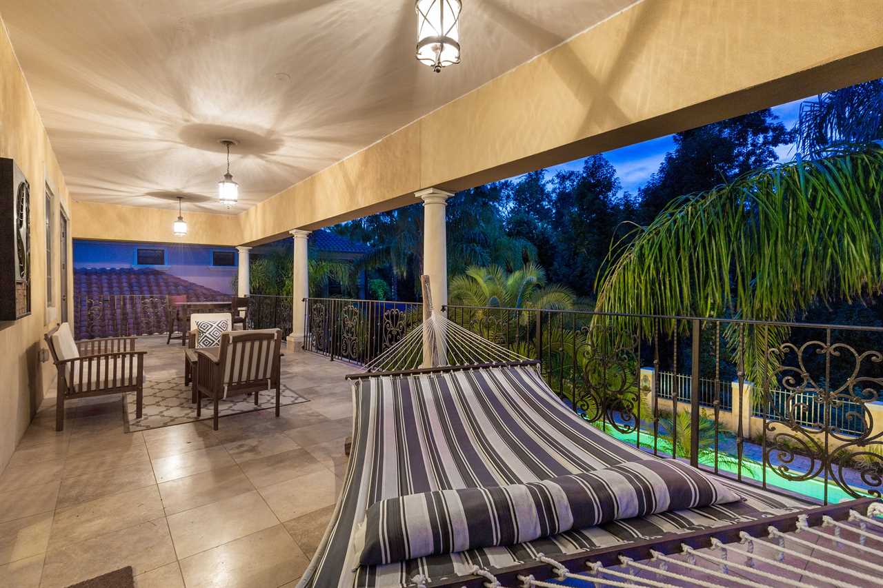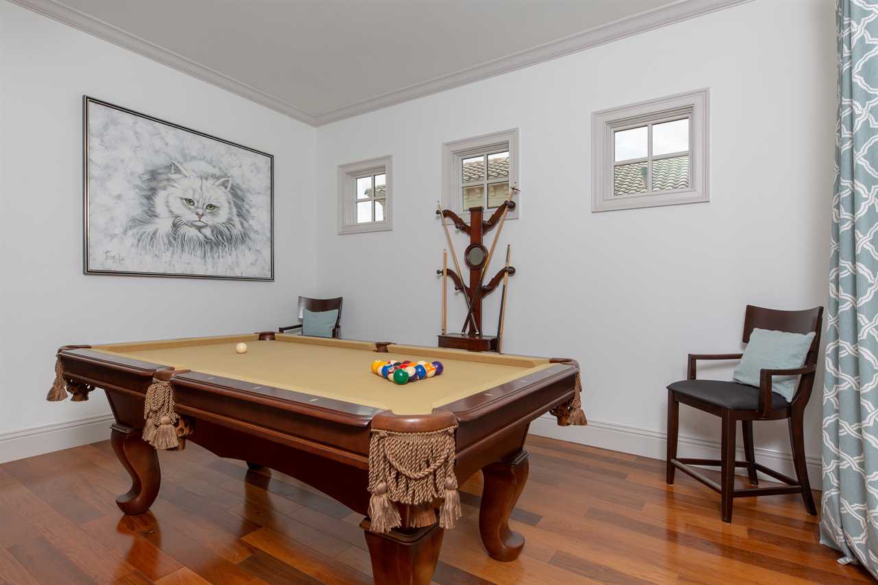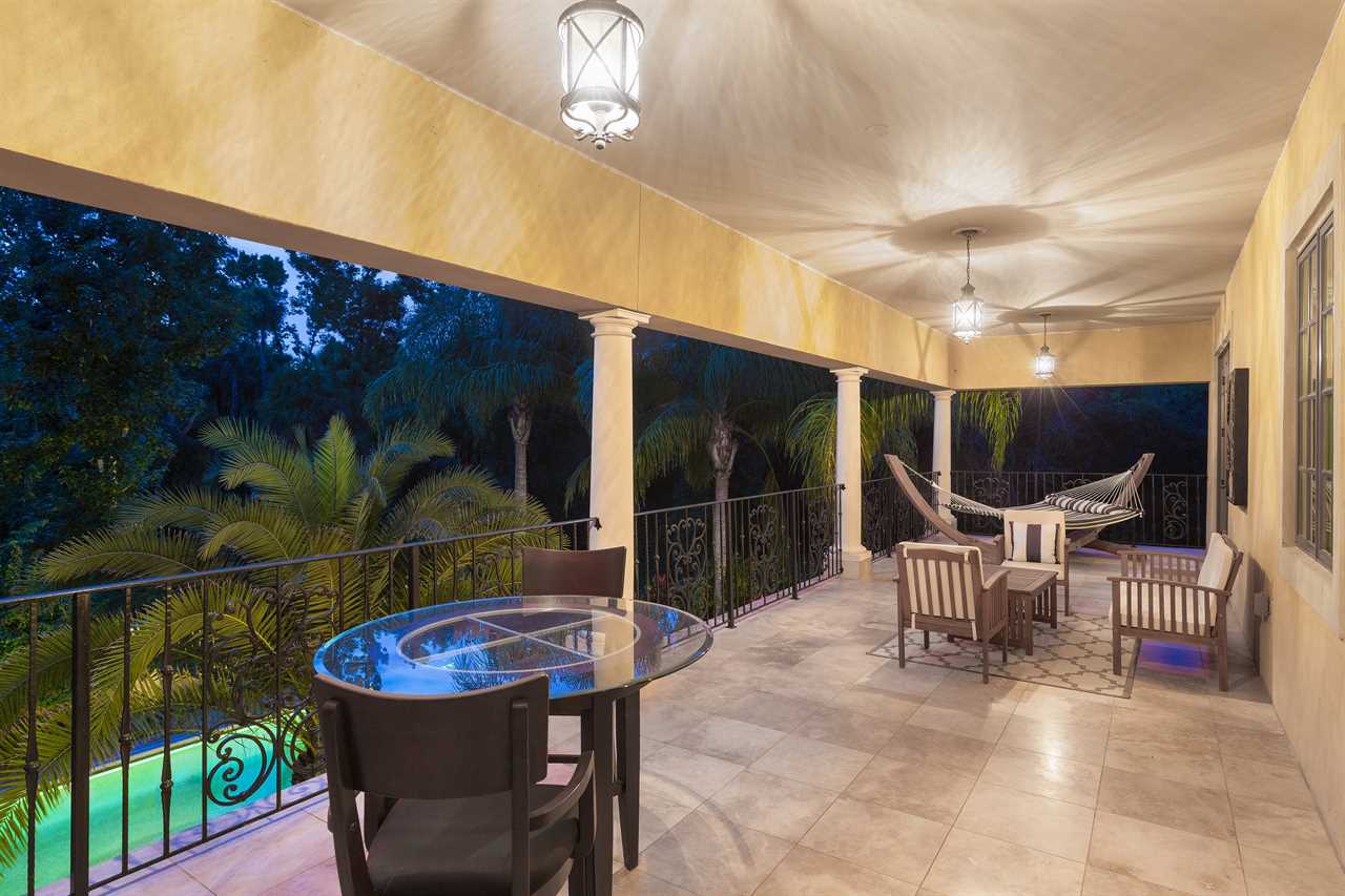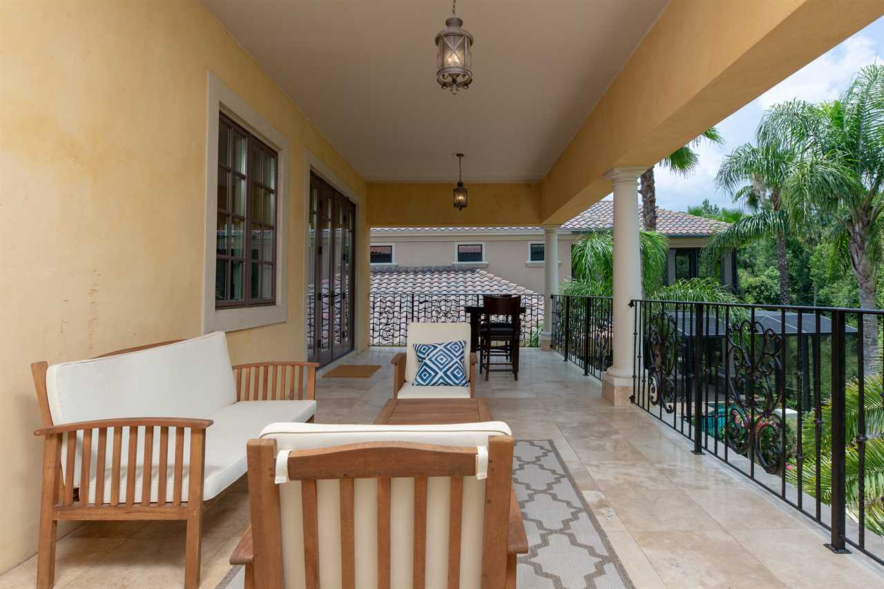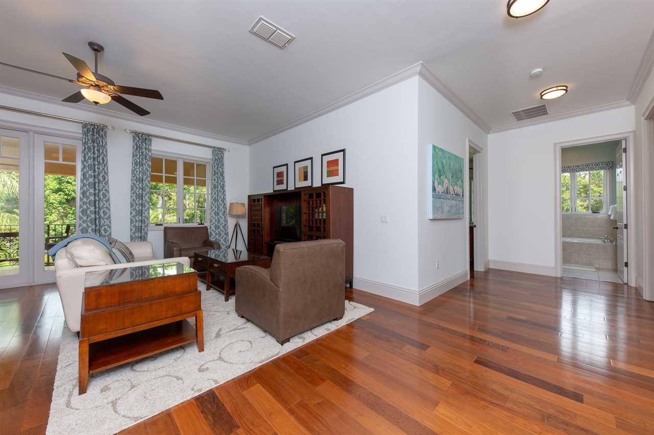 The living room upstairs provides another comfortable sitting area with a SMART TV and stereo equipment to enhance the movies' soundtrack. Adjacent is a mahogany, slate-bed pool table. A set of French doors lets everyone 'spill-out' to the house-width, 12-ft deep balcony where there is more space to enjoy the outdoors; a bar table for four and a sitting area for four. A hammock beckons beyond.