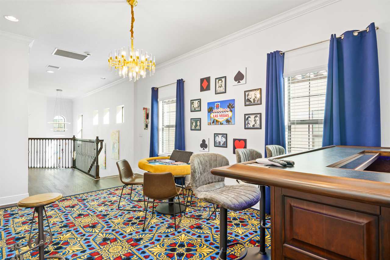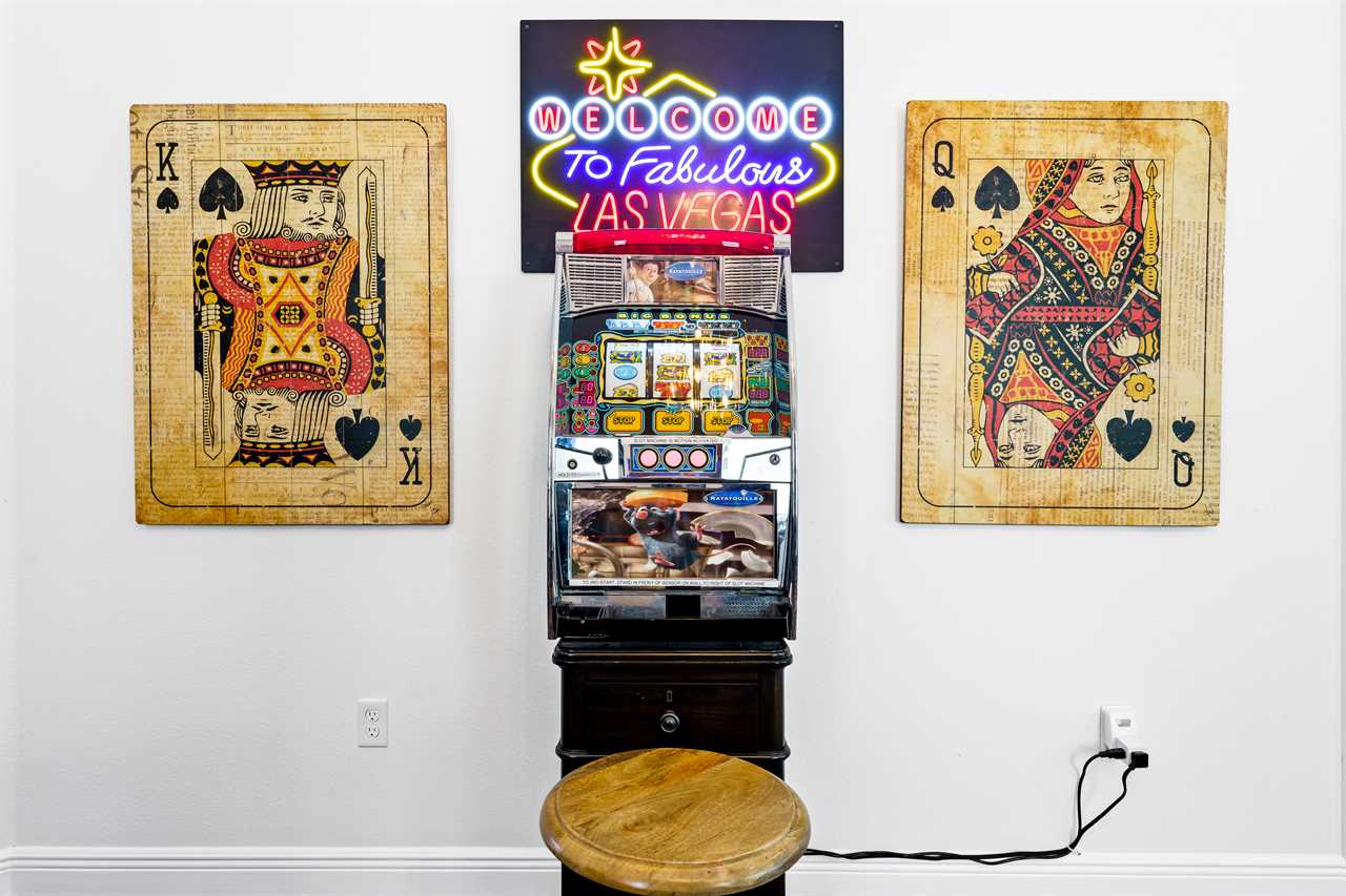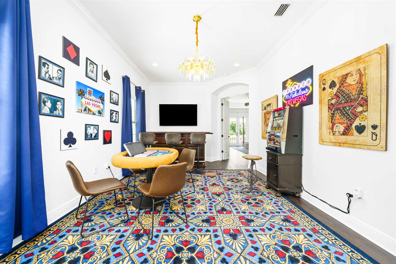 The Magical Estate is a 5 bedroom (all en-suite), 3,200 sq foot treasure that features countless activities for all ages! The private pool/spa and spacious pool deck include plenty of lounge chairs and countless games and activities. This includes pool basketball, cornhole, and larger-than-life ConnectFour! The outdoor kitchen and oversized dining/seating include an outdoor TV, the on-site Las Vegas-themed casino, and a lounge for adults featuring poker and token-based slots. the state-of-the-art arcade and game room, the next-level wizard, and superhero-themed rooms including 3 different commercial playground quality slides, and an unparalleled pop art collection that fills the walls, are just a few of the features that set this home apart! There's even an on-site laundry room with brand-new machines for your convenience.