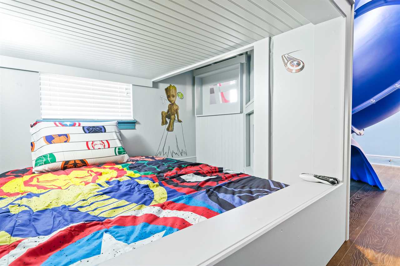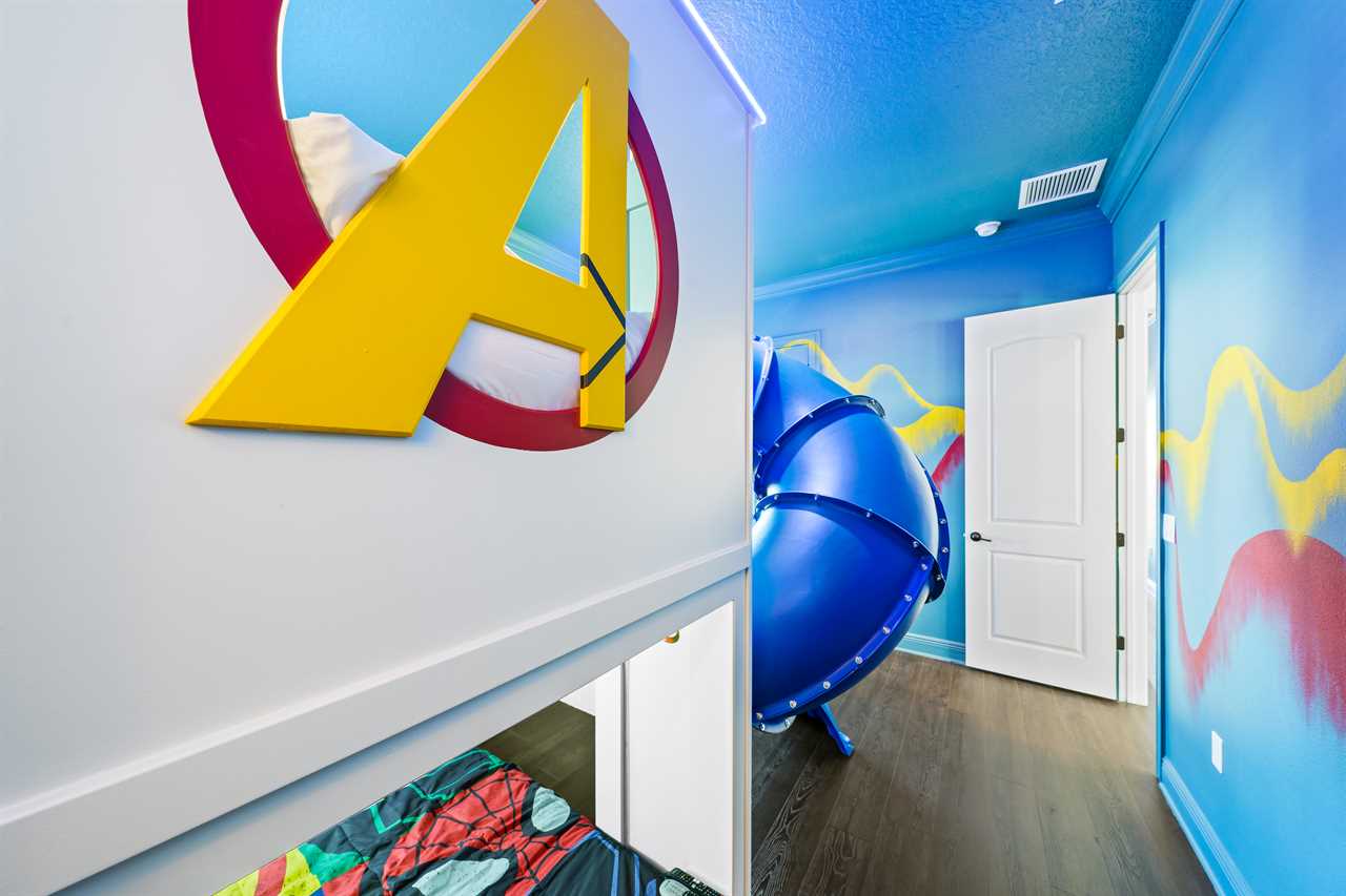 The large Master bedroom includes an oversized soaking tub and overlooks the crystal-clear swimming pool, as well as a nature preserve from its private balcony; the Hollywood-themed room brings comfort, class, and glamour to the most discerning of guests. The edgy character room includes luxury design and contemporary vibes infused with unique pop-art interpretations of the world's most famous mouse; the superhero room includes custom-built bunk beds, a tube slide, mind-blowing wall murals, and an authentic 7-foot tall superhero statue; and the wizard room includes a custom-build castle bunk-bed set-up, double slides out of the top bunks, epic wall murals, custom lighting and more!