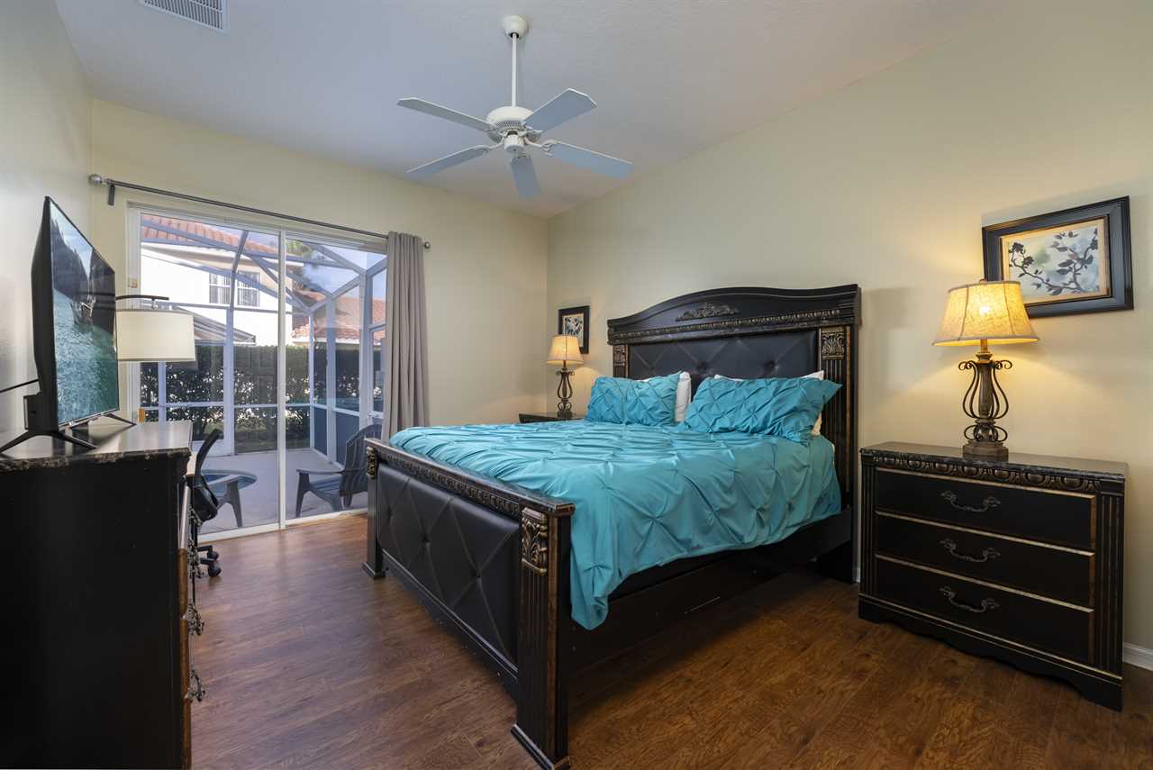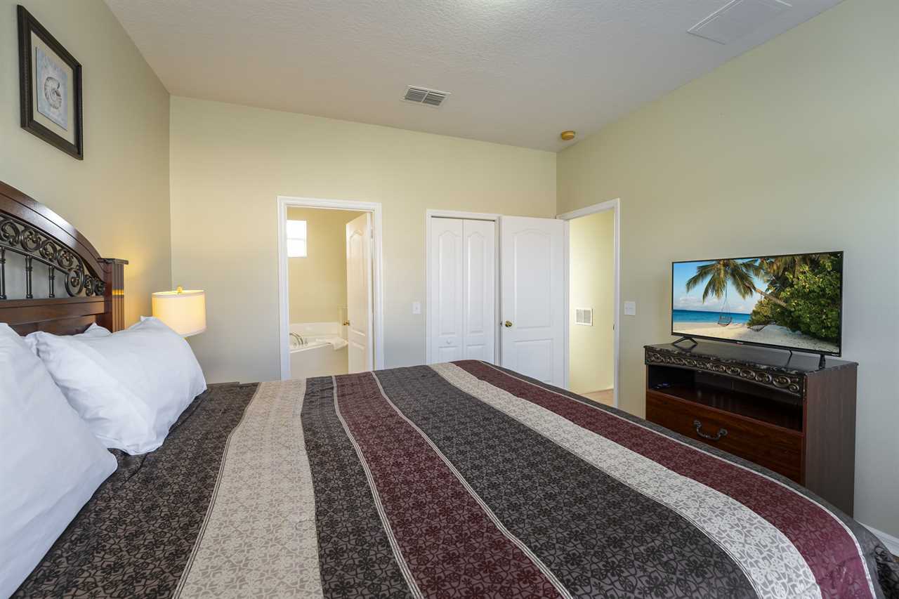 Bedroom 1 – Downstairs Master: King Bed | Smart TV | En-suite Bath | Pool Access