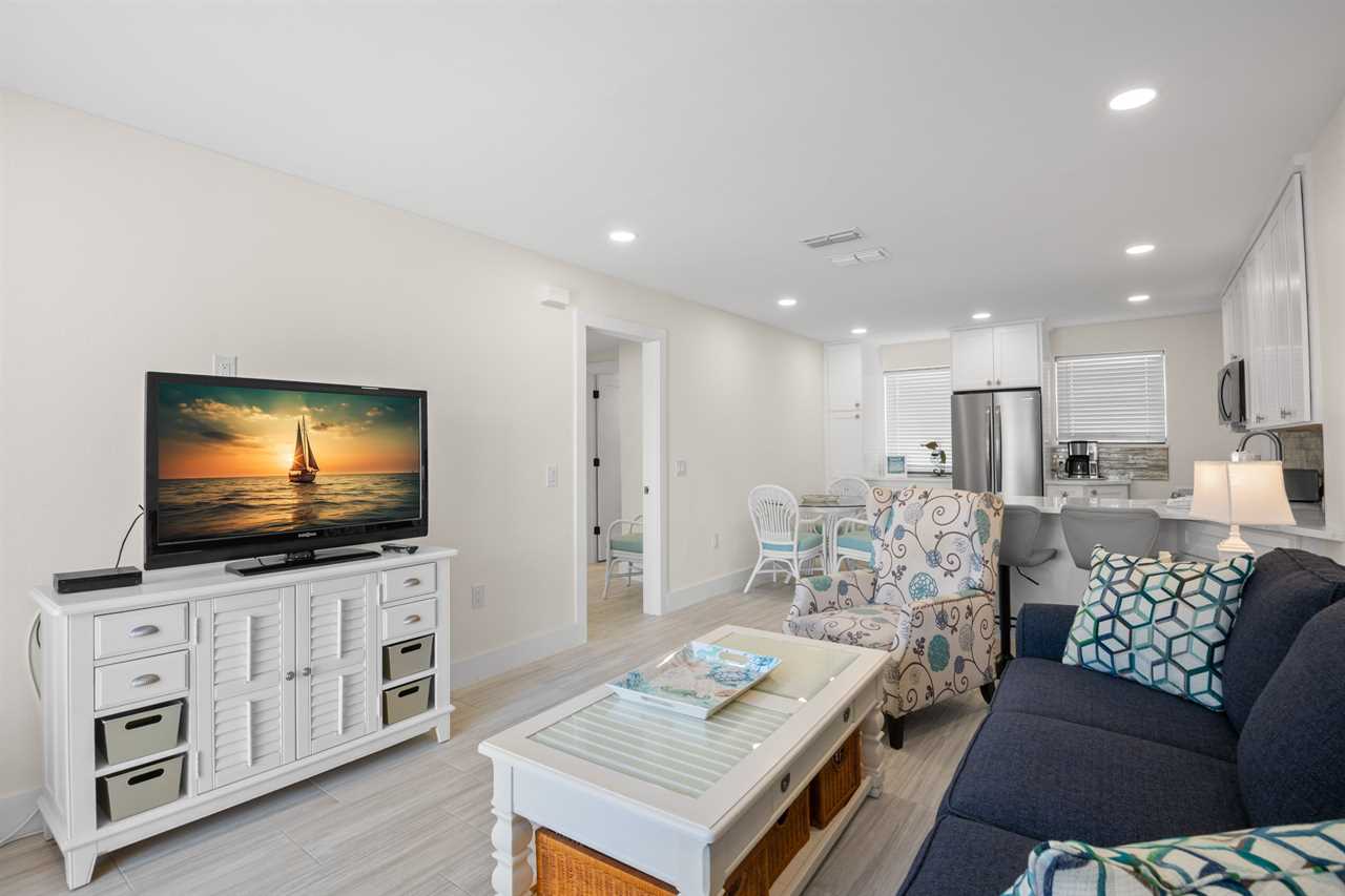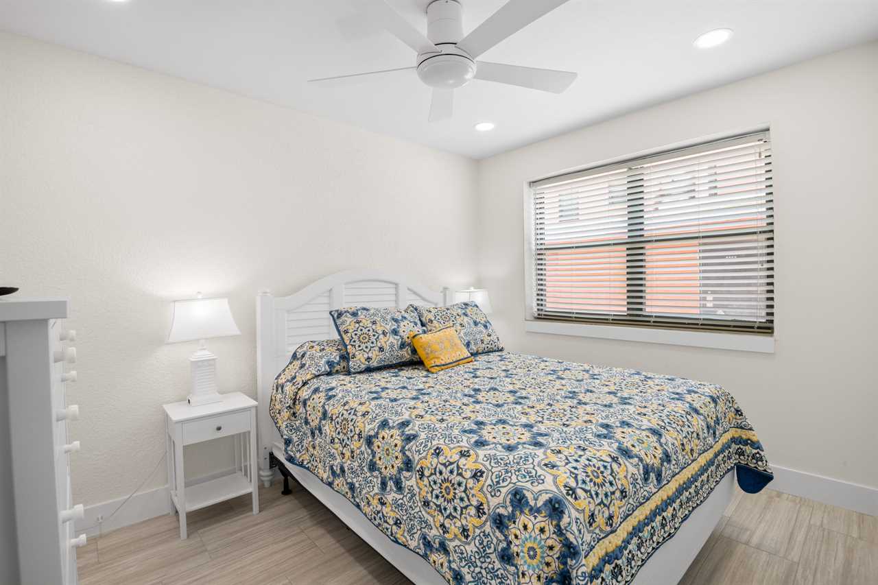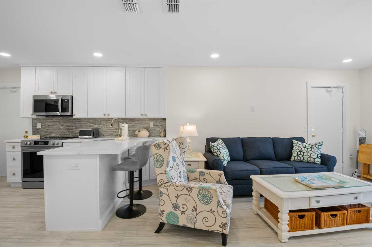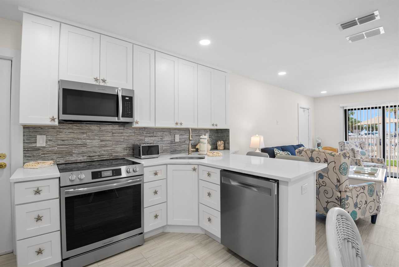This ground-floor unit #1101 features a queen bed in the master bedroom, two full-sized beds in the second bedroom, and a sleeper sofa in the living room β sleeping up to six guests. With a full kitchen (stove, oven, refrigerator, microwave, dishwasher and all the cooking basics), dining and living areas, cable TV, complimentary Wi-Fi, and neatly updated dΓ©cor, you'll feel right at home. The recent renovation has refreshed the space with modern finishes and comfortable furnishings, giving the unit a bright, fresh, coastal vibe.