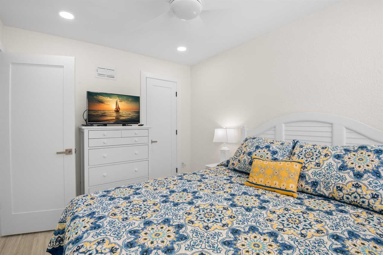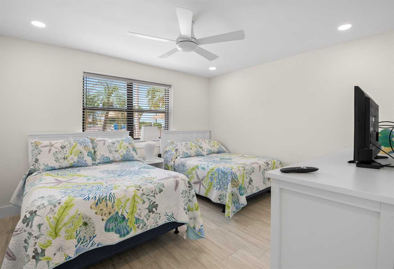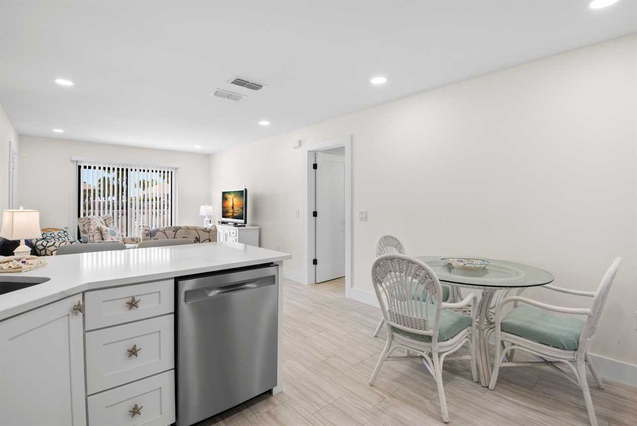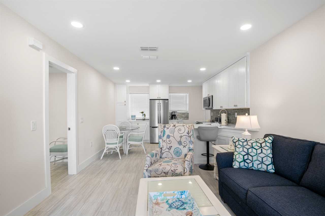This ground-floor unit #1101 features a queen bed in the master bedroom, two full-sized beds in the second bedroom, and a sleeper sofa in the living room β sleeping up to six guests. With a full kitchen (stove, oven, refrigerator, microwave, dishwasher and all the cooking basics), dining and living areas, cable TV, complimentary Wi-Fi, and neatly updated dΓ©cor, you'll feel right at home. The recent renovation has refreshed the space with modern finishes and comfortable furnishings, giving the unit a bright, fresh, coastal vibe.