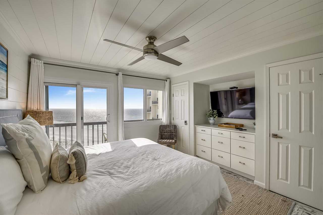As you make your way upstairs, you'll find the sleeping area. The front bedroom has a set of twin beds and spacious closet. In the hallway, there is a full bathroom with shower. The master bedroom has a king bed, spacious closet, and balcony with Gulf View. There is also a full size master bathroom with tub/shower combo.