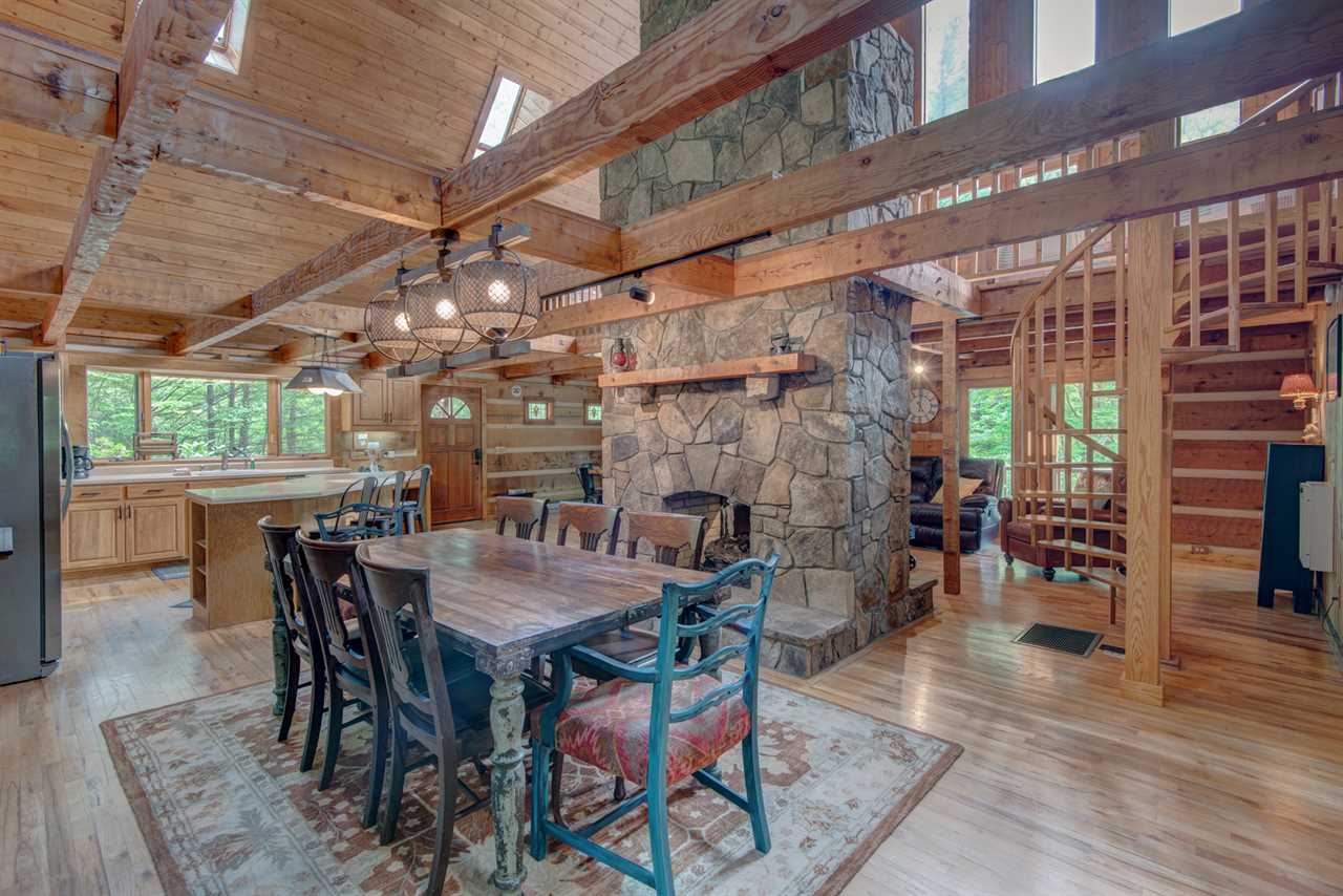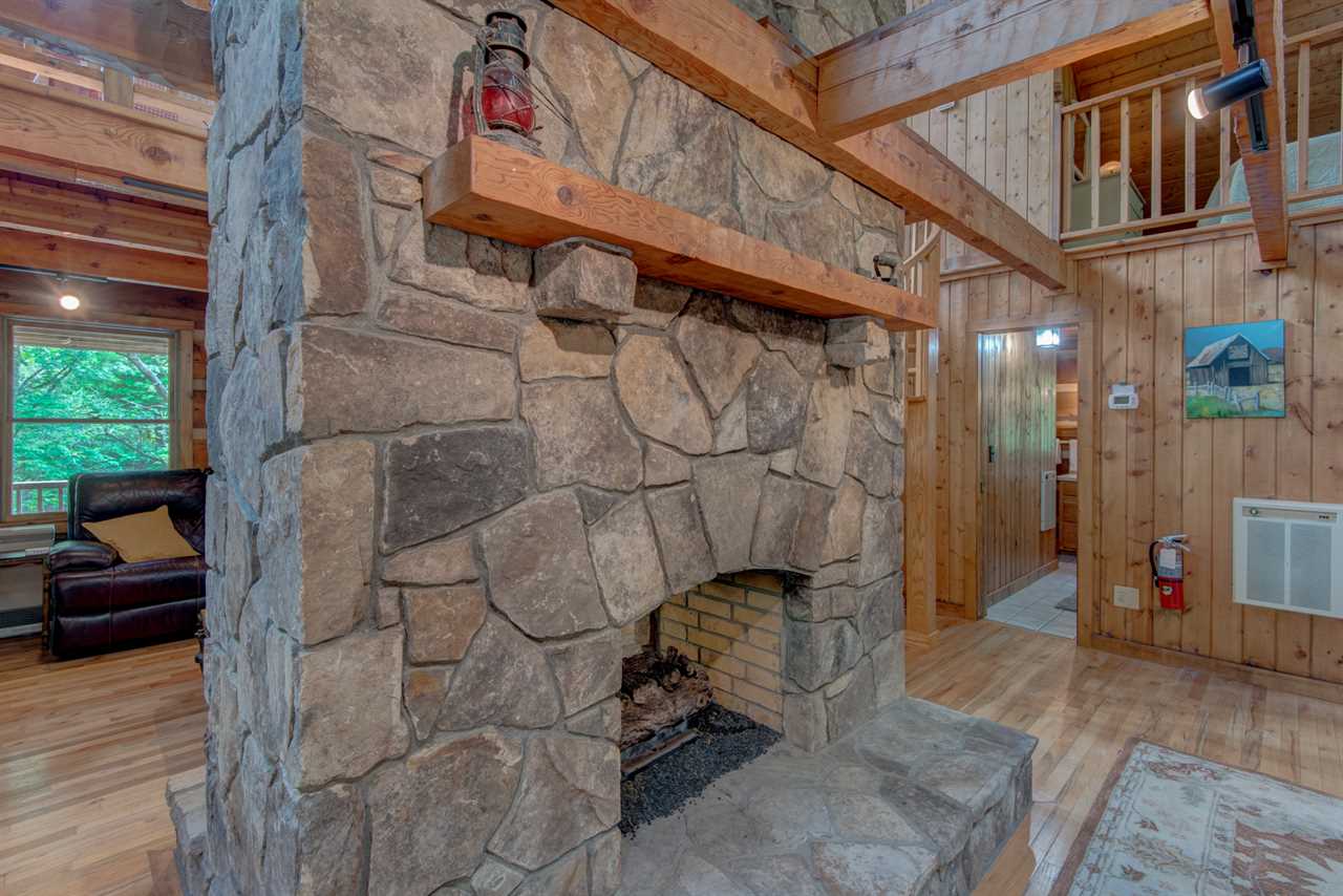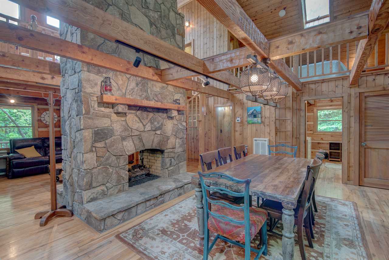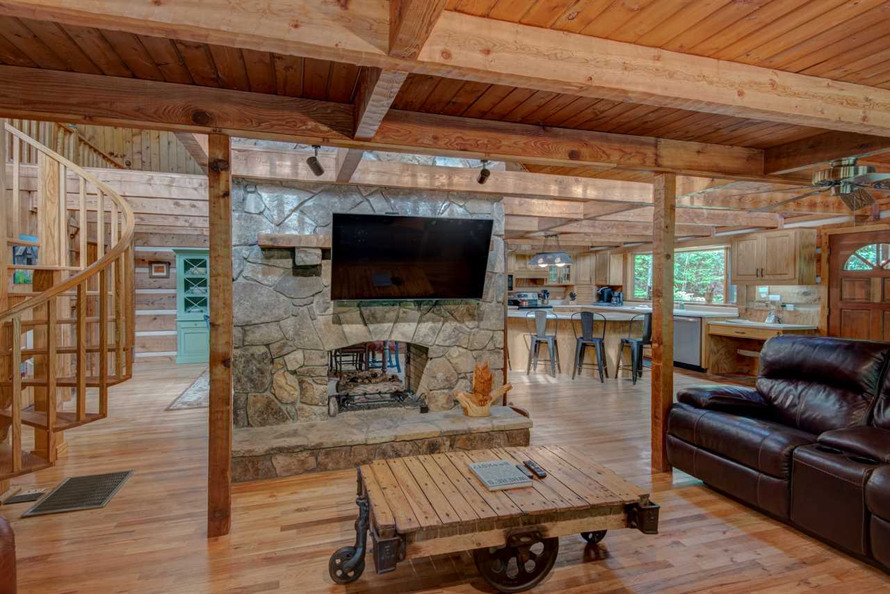 The great room is centered around a double-sided two-story stone gas log fireplace. On one side, you'll find a cozy area with a game/puzzle table and additional den seating with a TV above the fireplace. The well-stocked kitchen and dining table are on the other side of the fireplace.