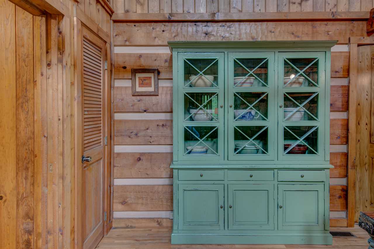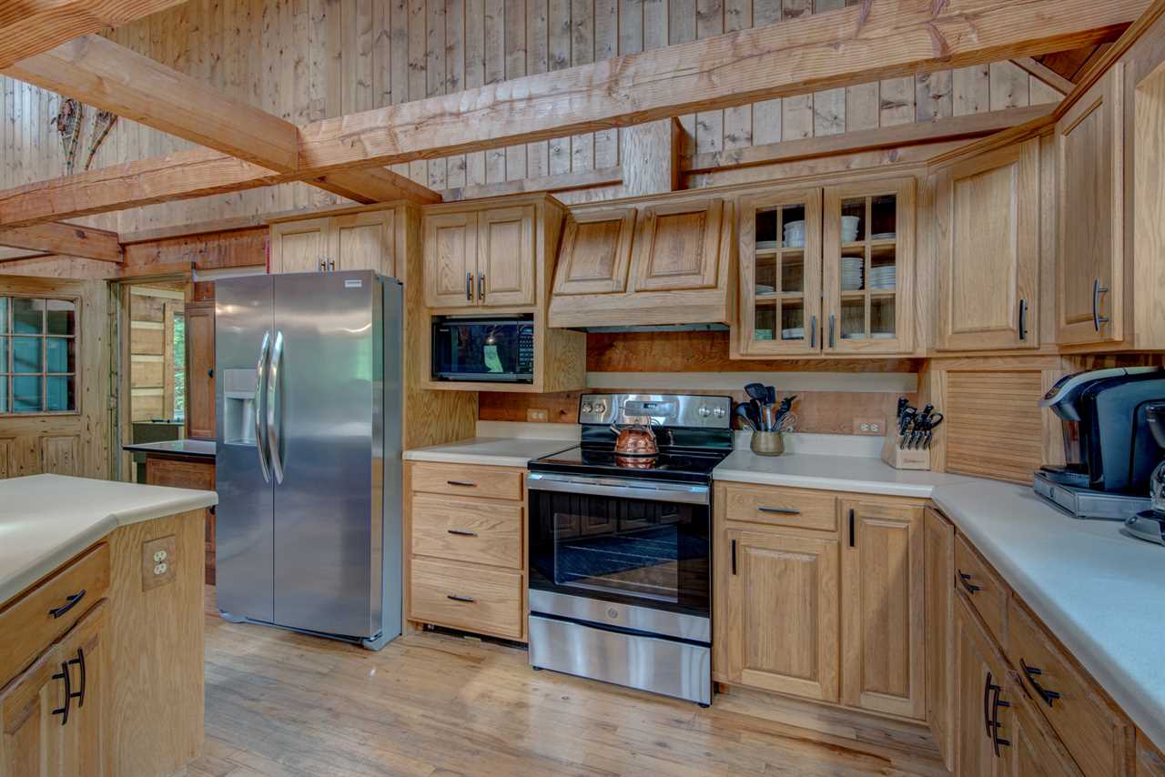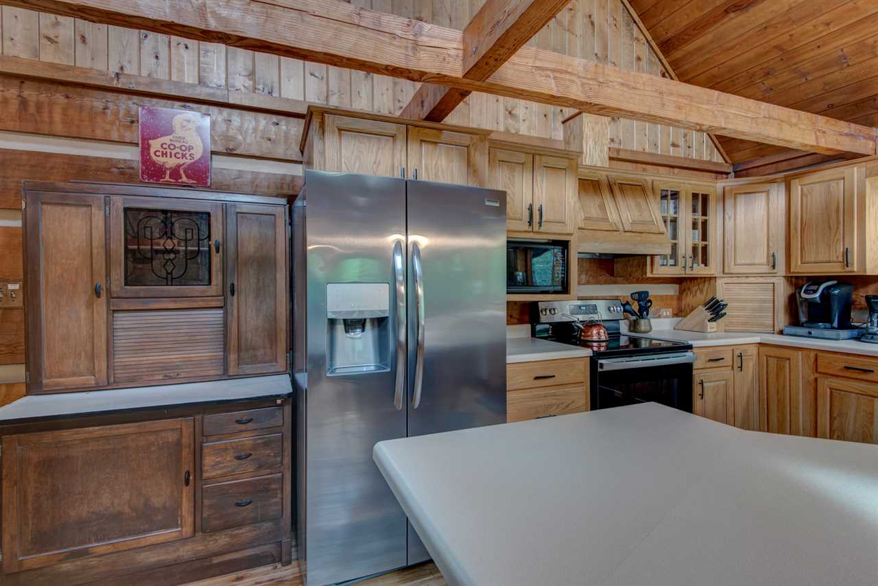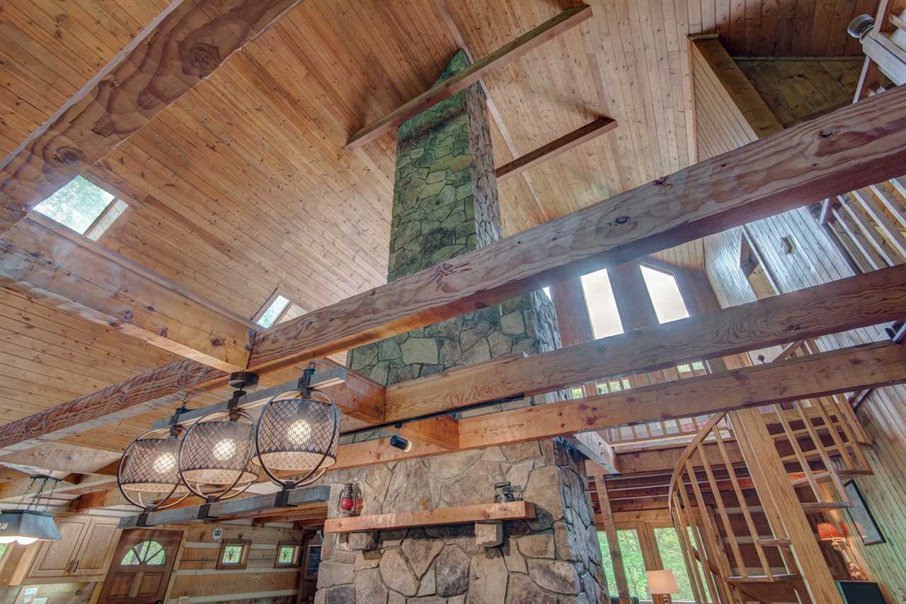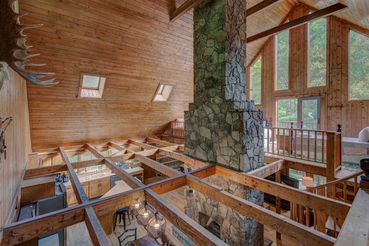 The great room is centered around a double-sided two-story stone gas log fireplace. On one side, you'll find a cozy area with a game/puzzle table and additional den seating with a TV above the fireplace. The well-stocked kitchen and dining table are on the other side of the fireplace.