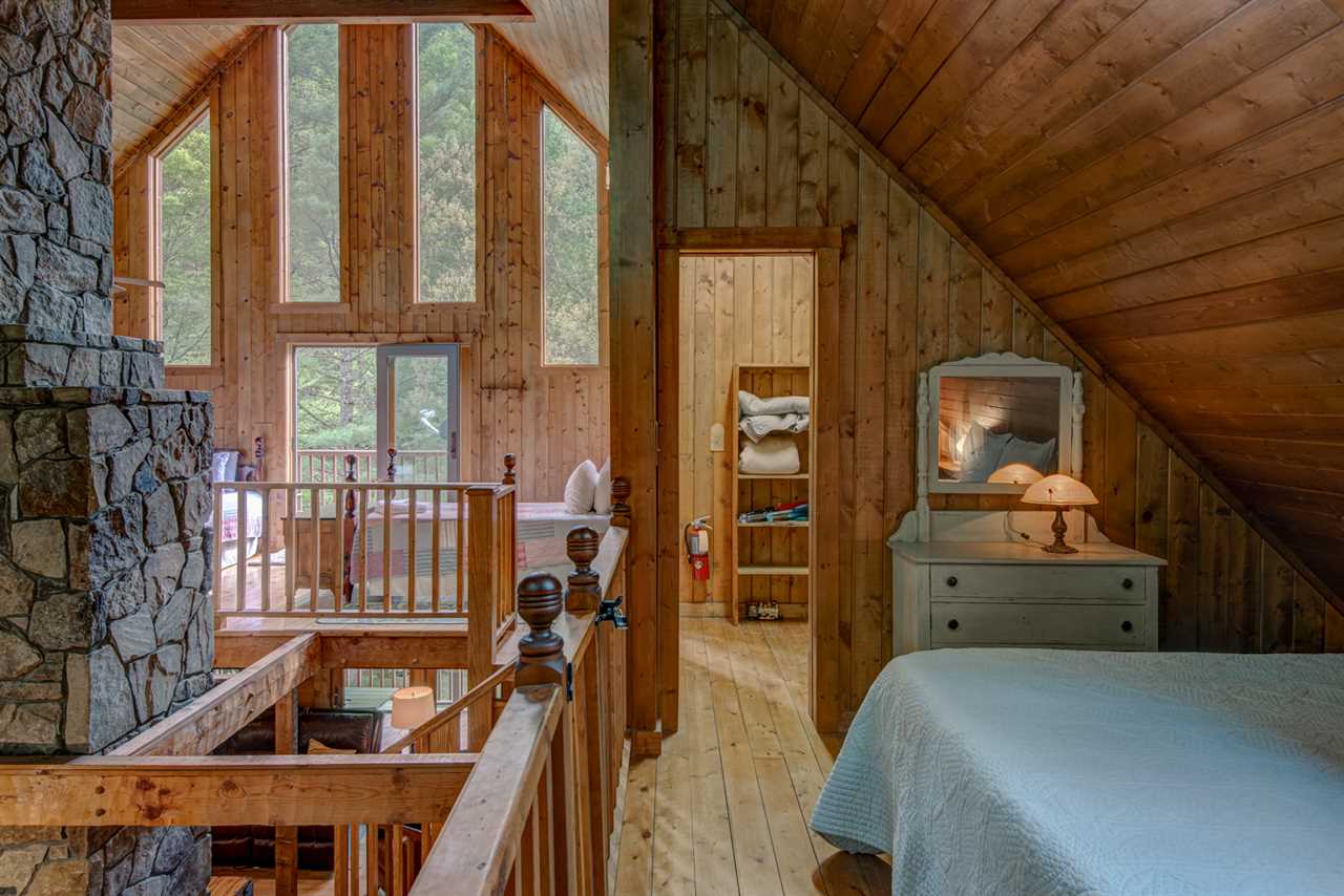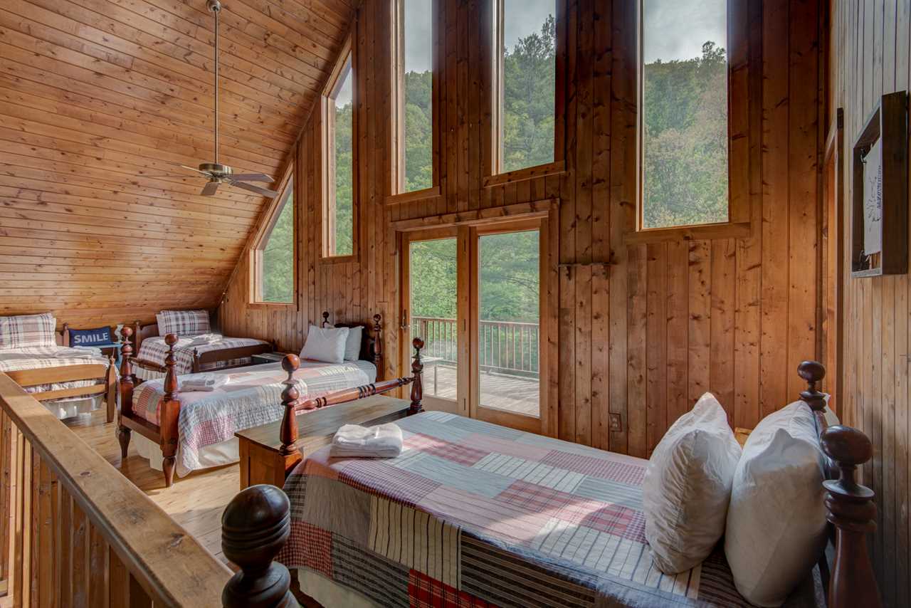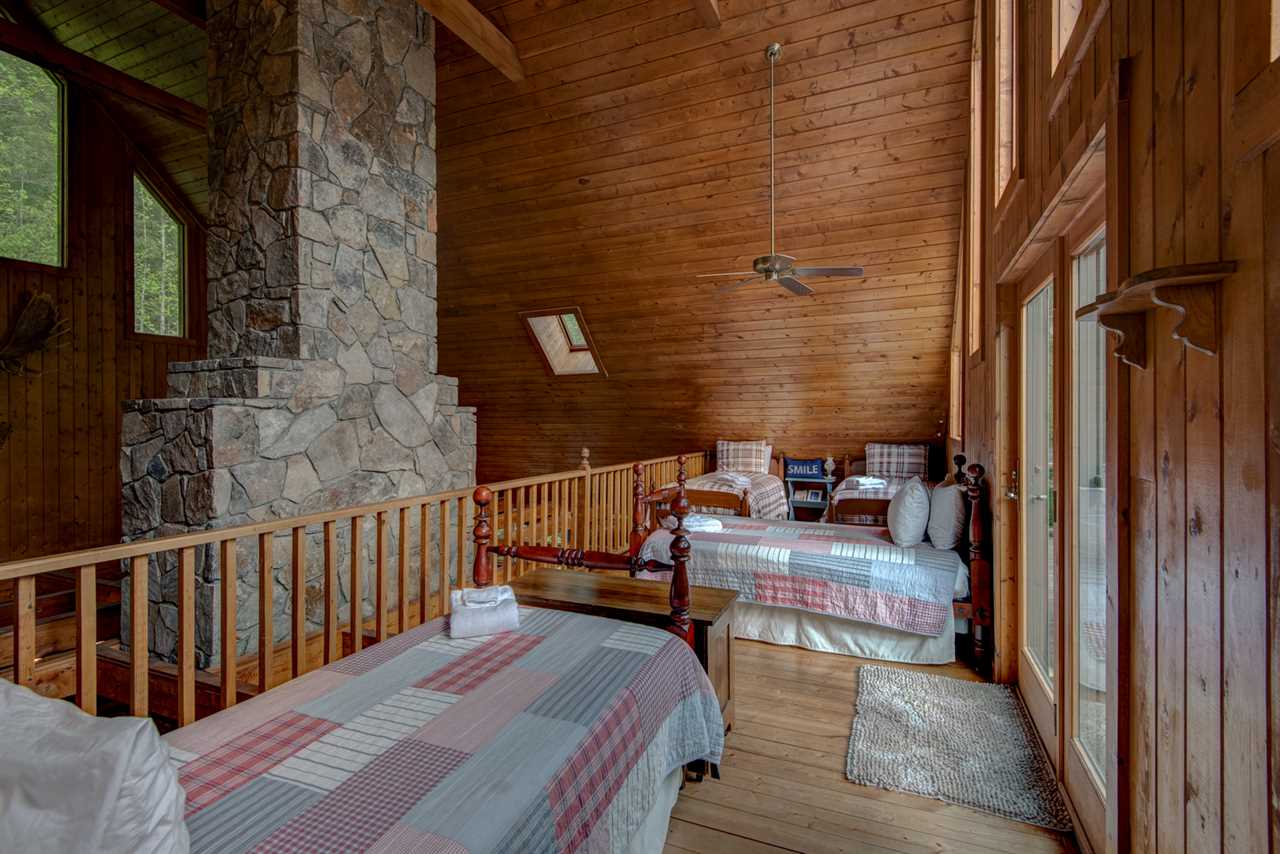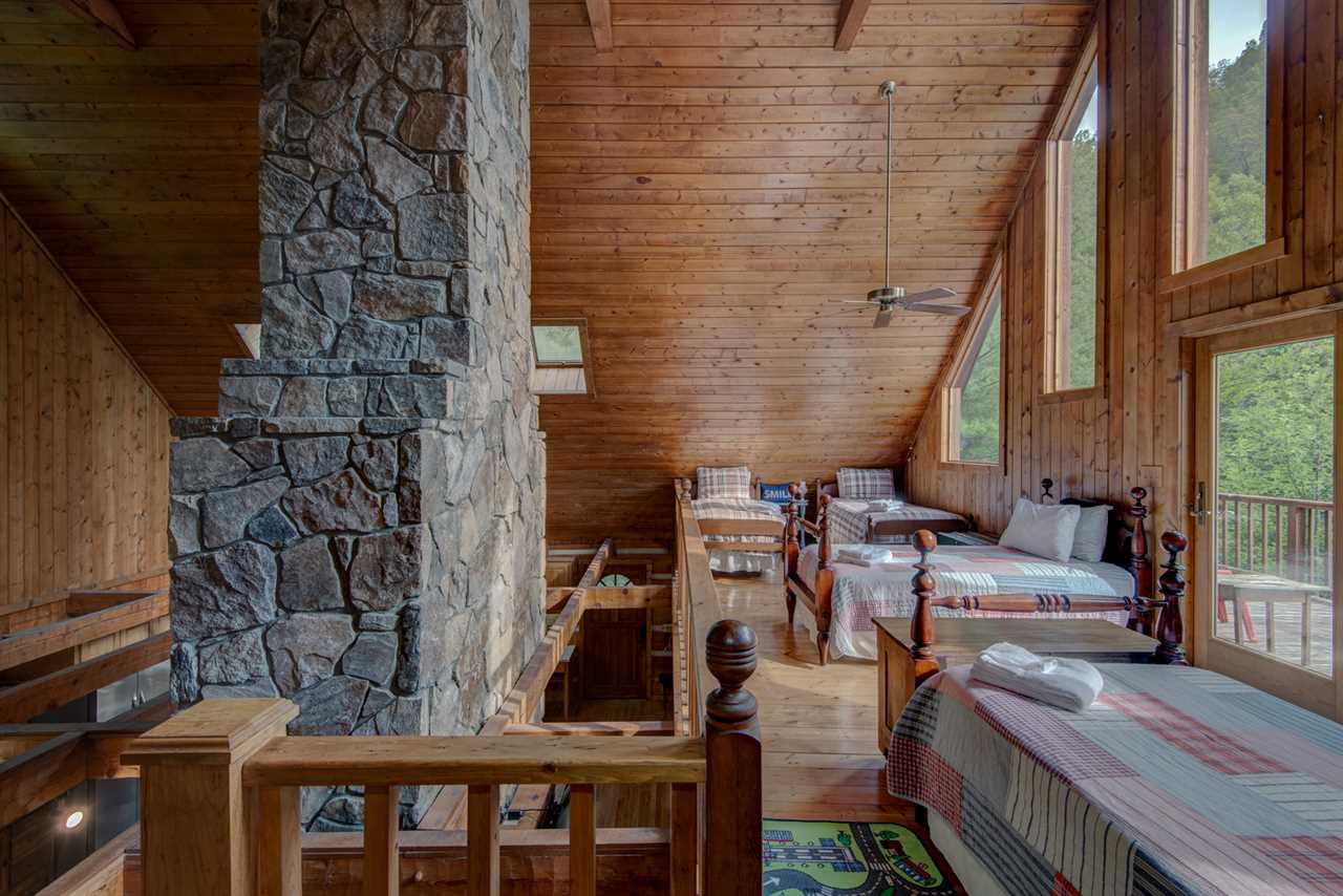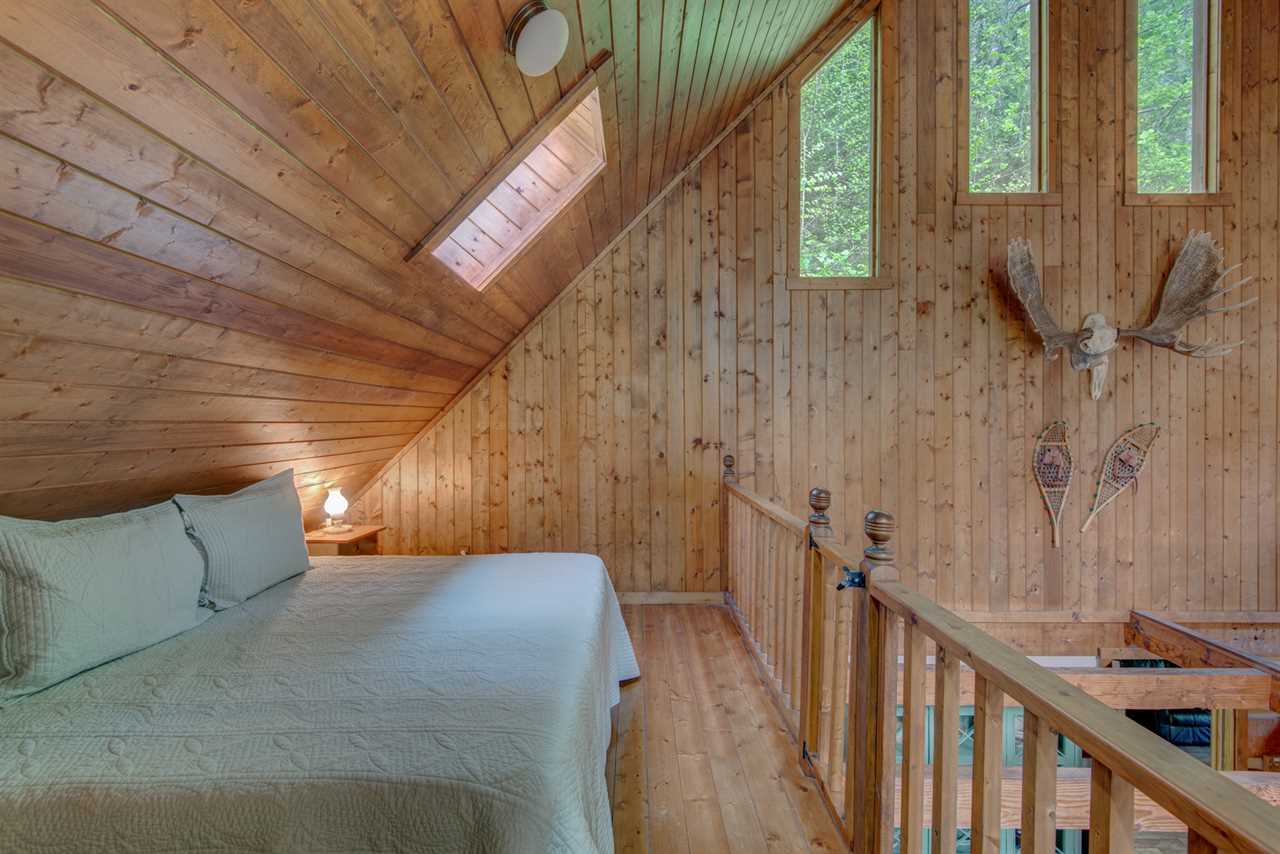 Take the spiral staircase from the living room up to the upstairs loft, where you will find a King bedroom that looks down on the main area, as well as another loft sleeping area with four twin beds. These sleeping accommodations share a full bathroom upstairs, and are all open to the main living area.