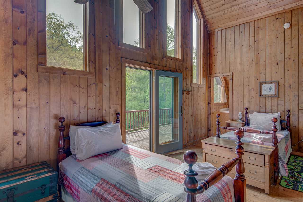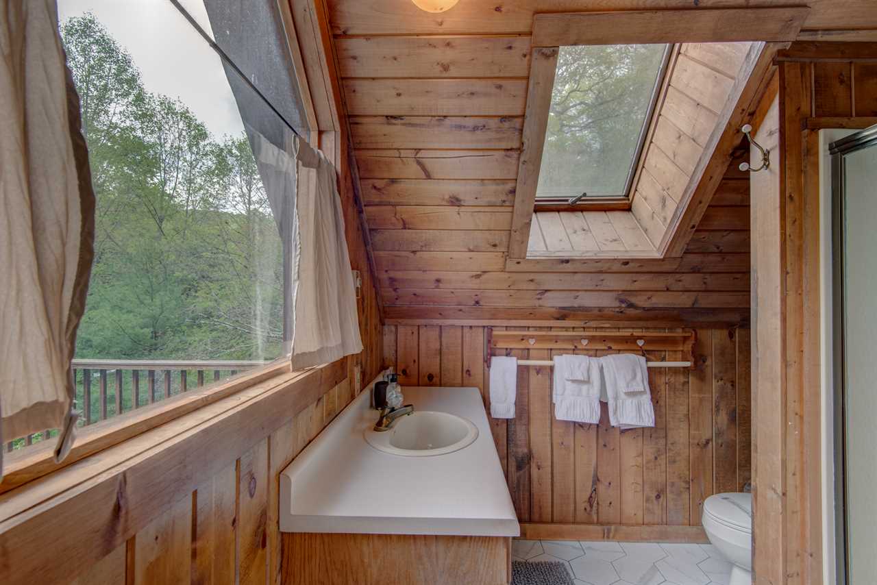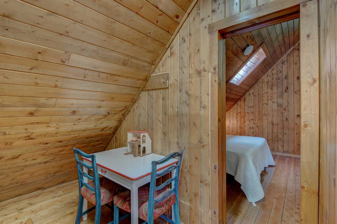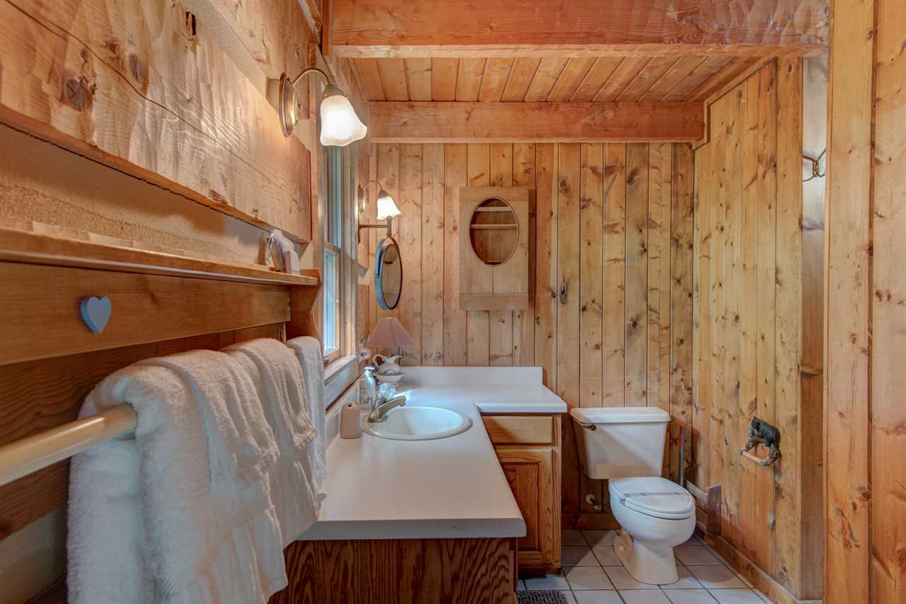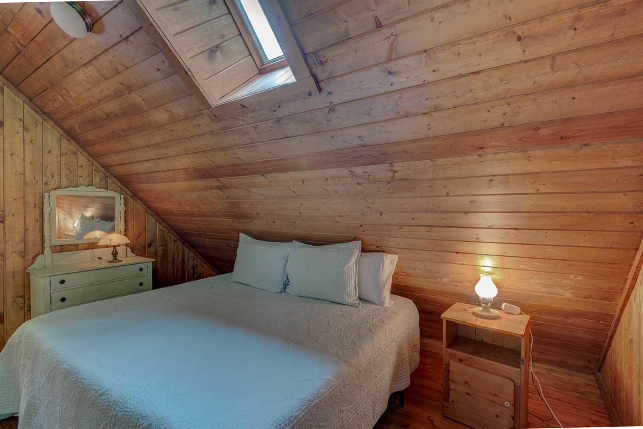 Take the spiral staircase from the living room up to the upstairs loft, where you will find a King bedroom that looks down on the main area, as well as another loft sleeping area with four twin beds. These sleeping accommodations share a full bathroom upstairs, and are all open to the main living area.