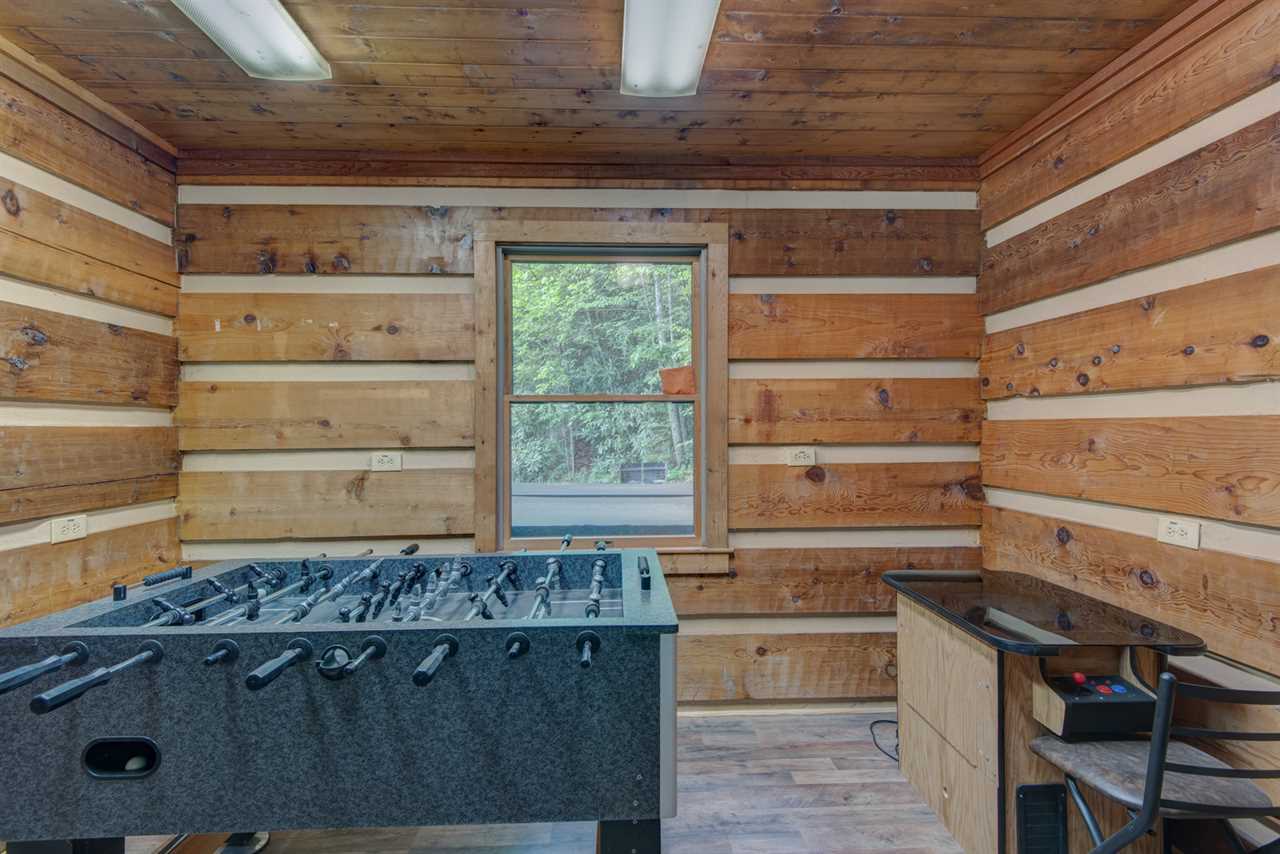 The master bedroom with a King bed is also located on the main floor, along with an attached full bathroom and a separate laundry area. Step into the recreation room right off the kitchen and have some family fun with the foosball table, Pacman game console, and additional TV.