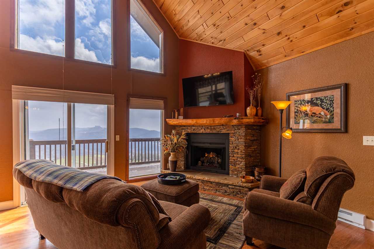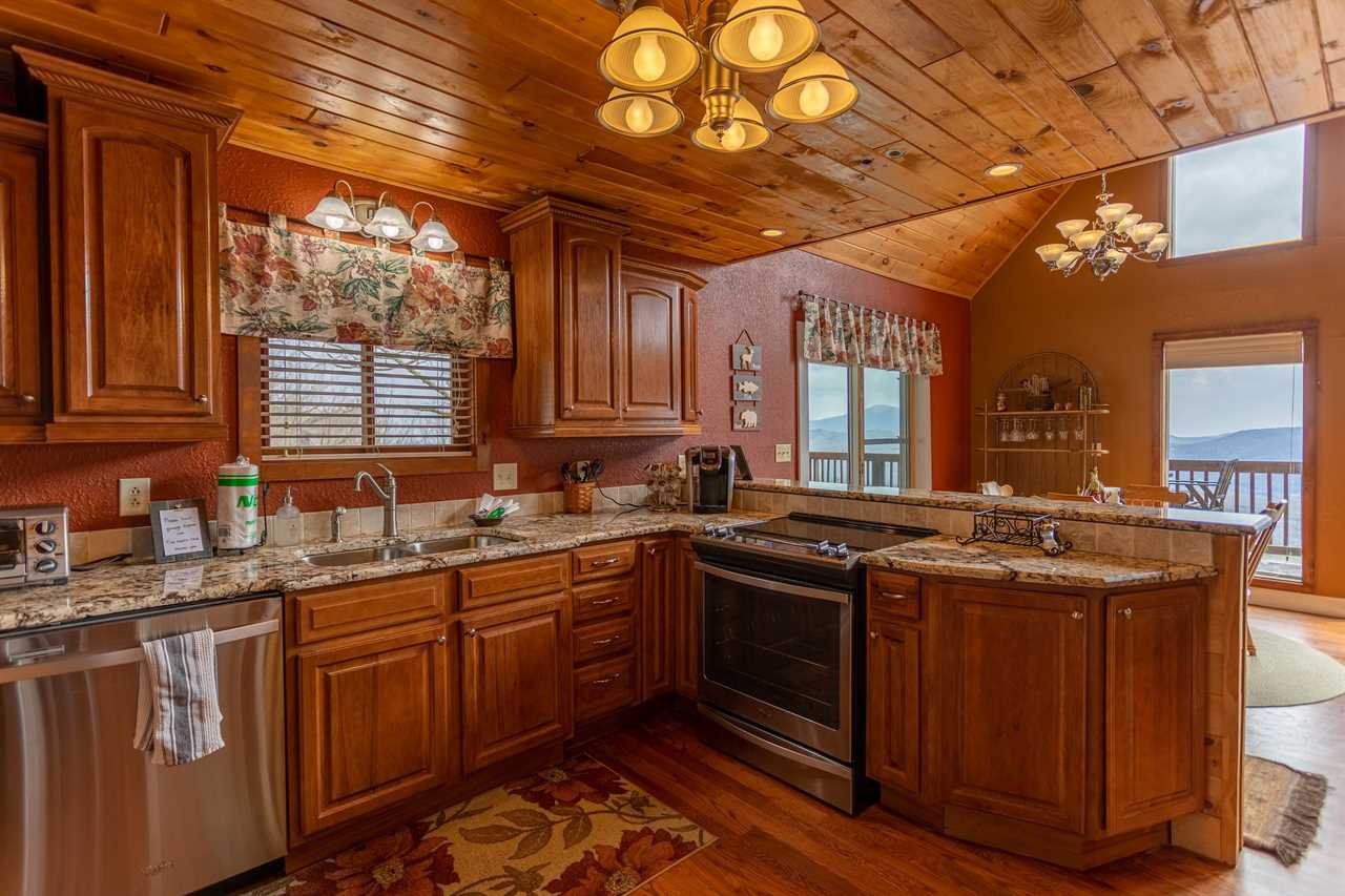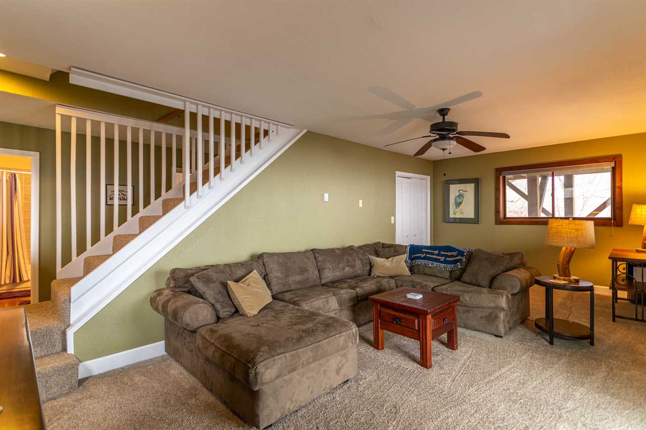 The great room, featuring a wall of windows overlooking the mountains, has a comfortable set of furnishings arranged around the fireplace and TV with a Roku stick for streaming capabilities. There's room for four at the dining table and three bar stools at the peninsula of the kitchen counter. The kitchen is well equipped with everything you'll need for meal prep, and cooking is a breeze with updated features including stainless steel appliances and the granite counters. Downstairs you'll find a second living area with a large TV, also with a Roku stick, and huge sectional sofa - a great place for movie night! Grand Panorama offers three bedrooms and bathrooms, one on each of the three levels. All three bedrooms have a Queen bed.