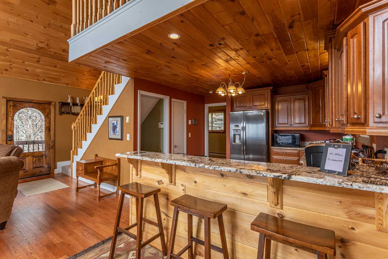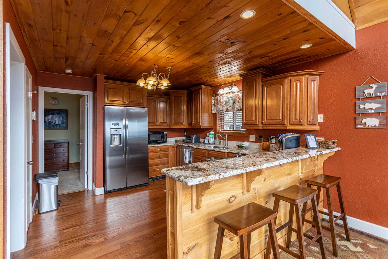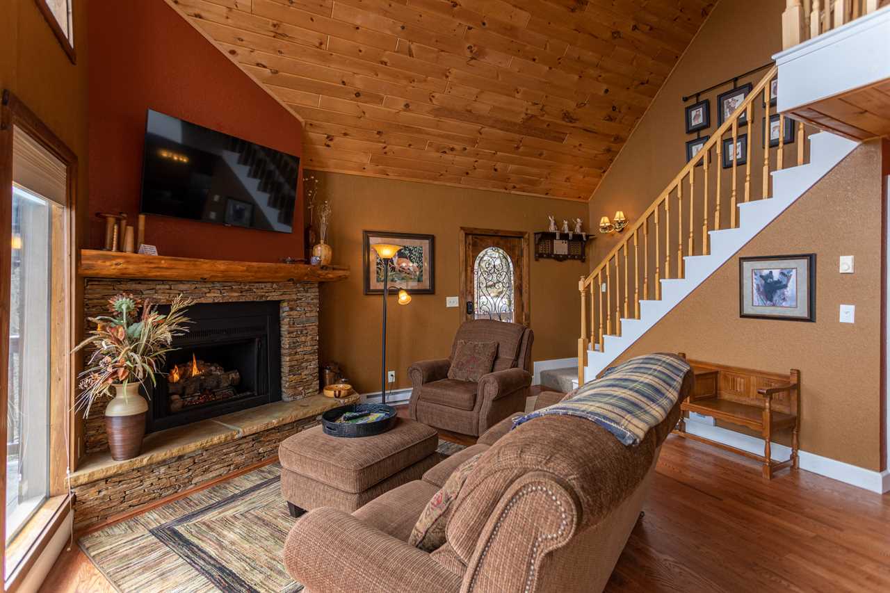 The great room, featuring a wall of windows overlooking the mountains, has a comfortable set of furnishings arranged around the fireplace and TV with a Roku stick for streaming capabilities. There's room for four at the dining table and three bar stools at the peninsula of the kitchen counter. The kitchen is well equipped with everything you'll need for meal prep, and cooking is a breeze with updated features including stainless steel appliances and the granite counters. Downstairs you'll find a second living area with a large TV, also with a Roku stick, and huge sectional sofa - a great place for movie night! Grand Panorama offers three bedrooms and bathrooms, one on each of the three levels. All three bedrooms have a Queen bed.