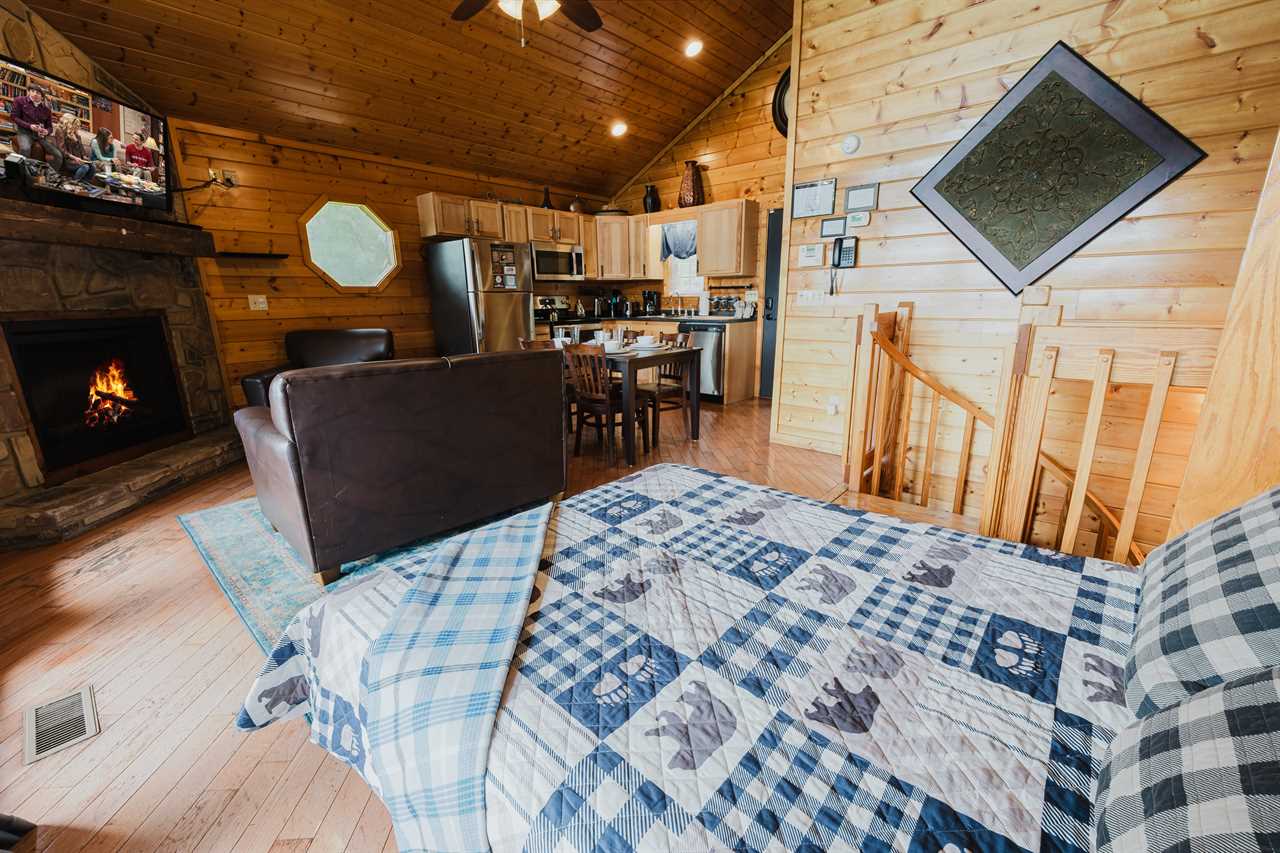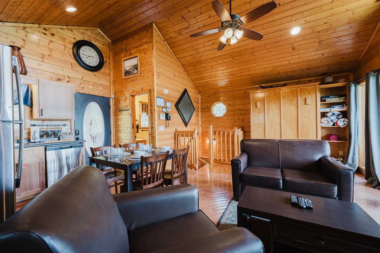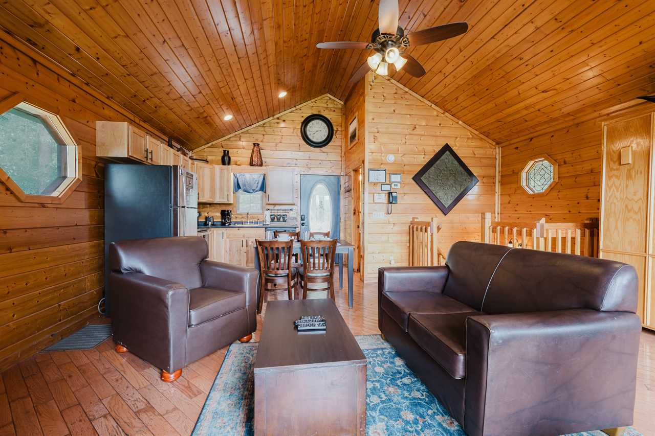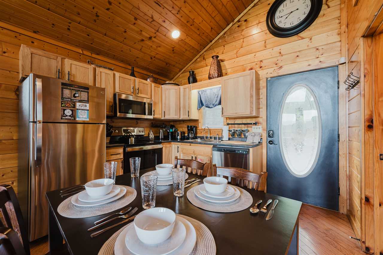 Cozy up in the inviting living room where comfort and relaxation await. Sink into the comfy armchair or loveseat by the electric fireplace and get lost in your favorite show on the flat-screen TV. When it's time to rest, the full Murphy bed effortlessly folds down from the wall, providing a convenient and spacious sleeping area for two. With its rustic charm and modern amenities, this living room is the perfect retreat after a day of exploring the great outdoors.