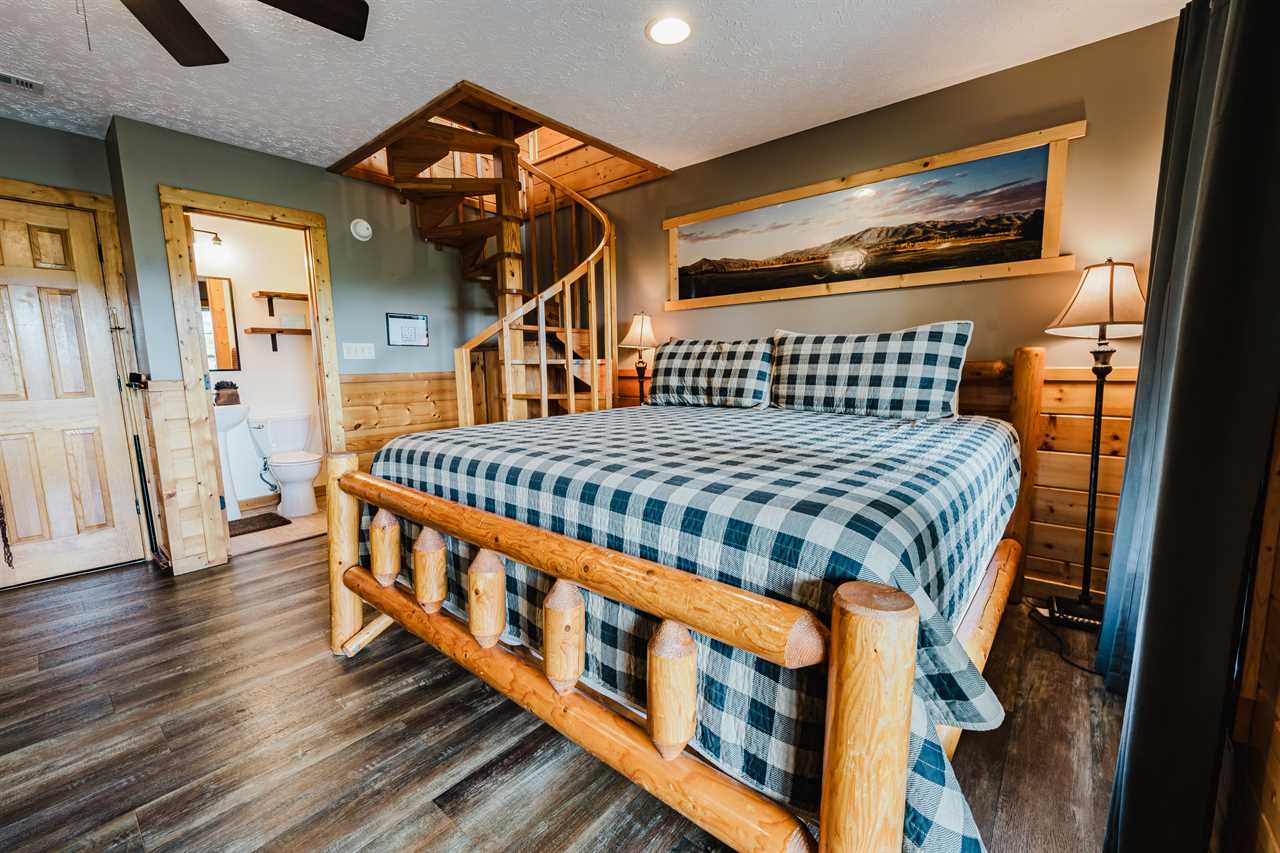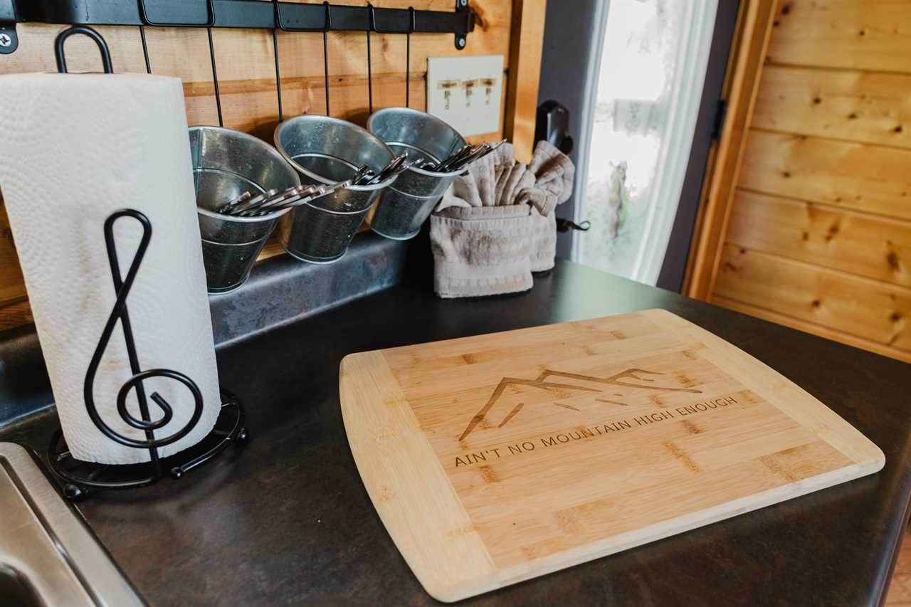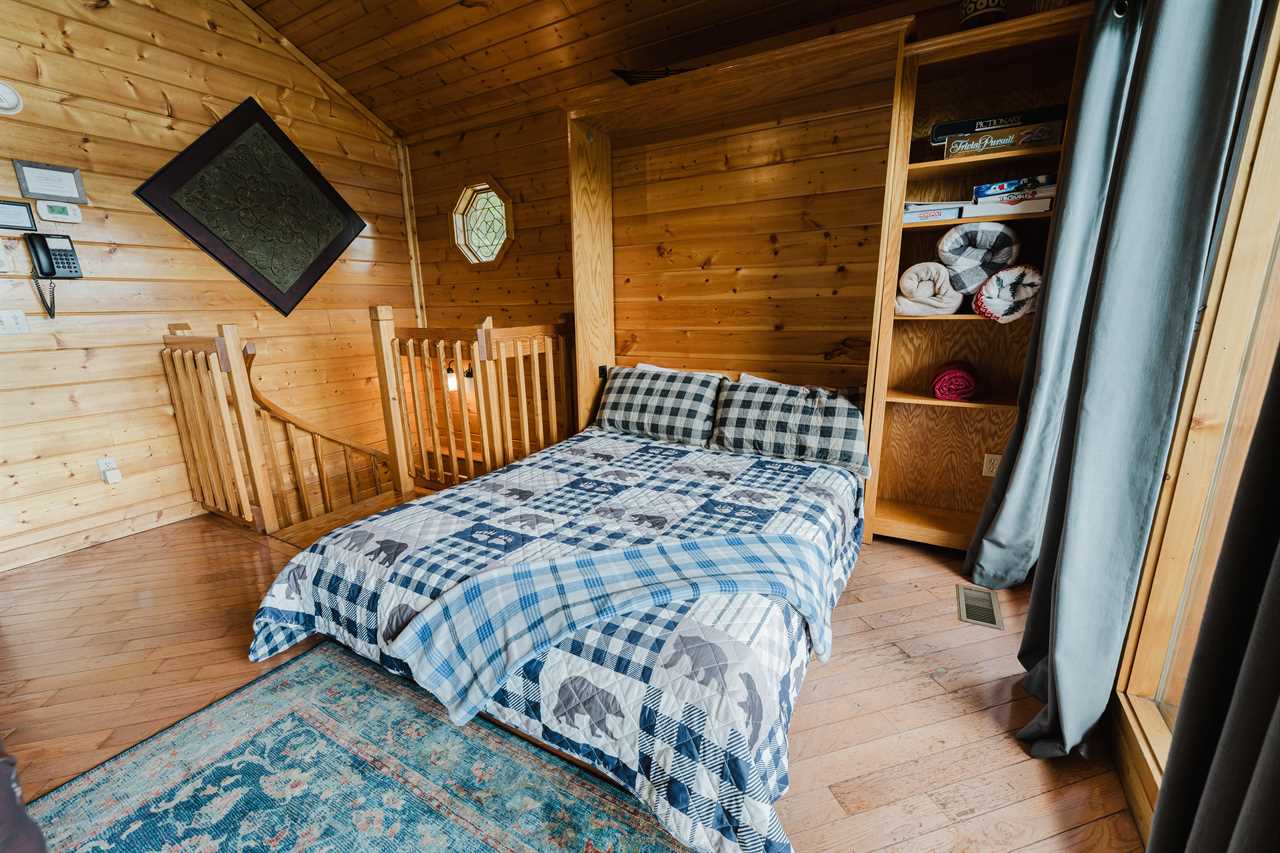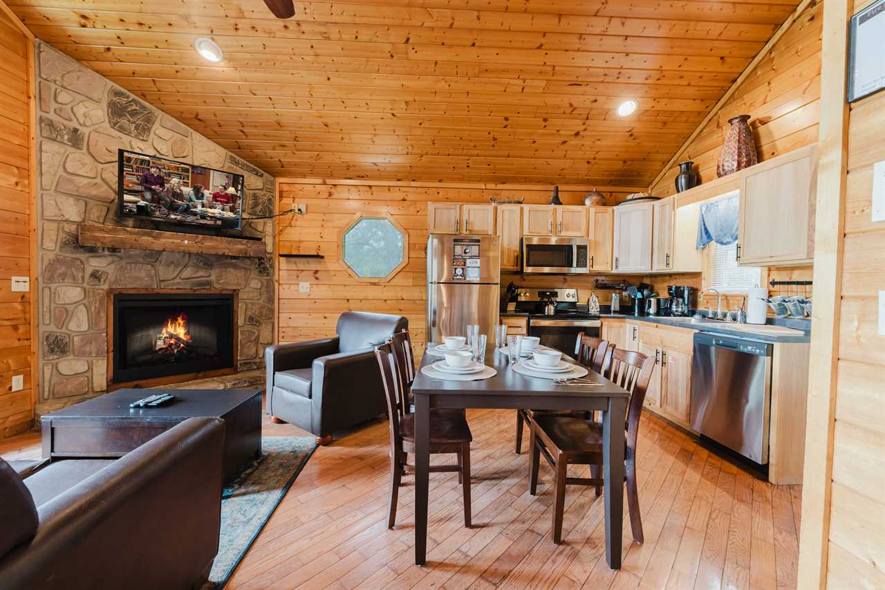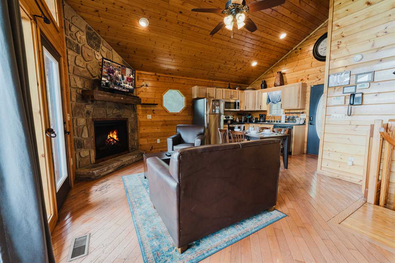 Cozy up in the inviting living room where comfort and relaxation await. Sink into the comfy armchair or loveseat by the electric fireplace and get lost in your favorite show on the flat-screen TV. When it's time to rest, the full Murphy bed effortlessly folds down from the wall, providing a convenient and spacious sleeping area for two. With its rustic charm and modern amenities, this living room is the perfect retreat after a day of exploring the great outdoors.