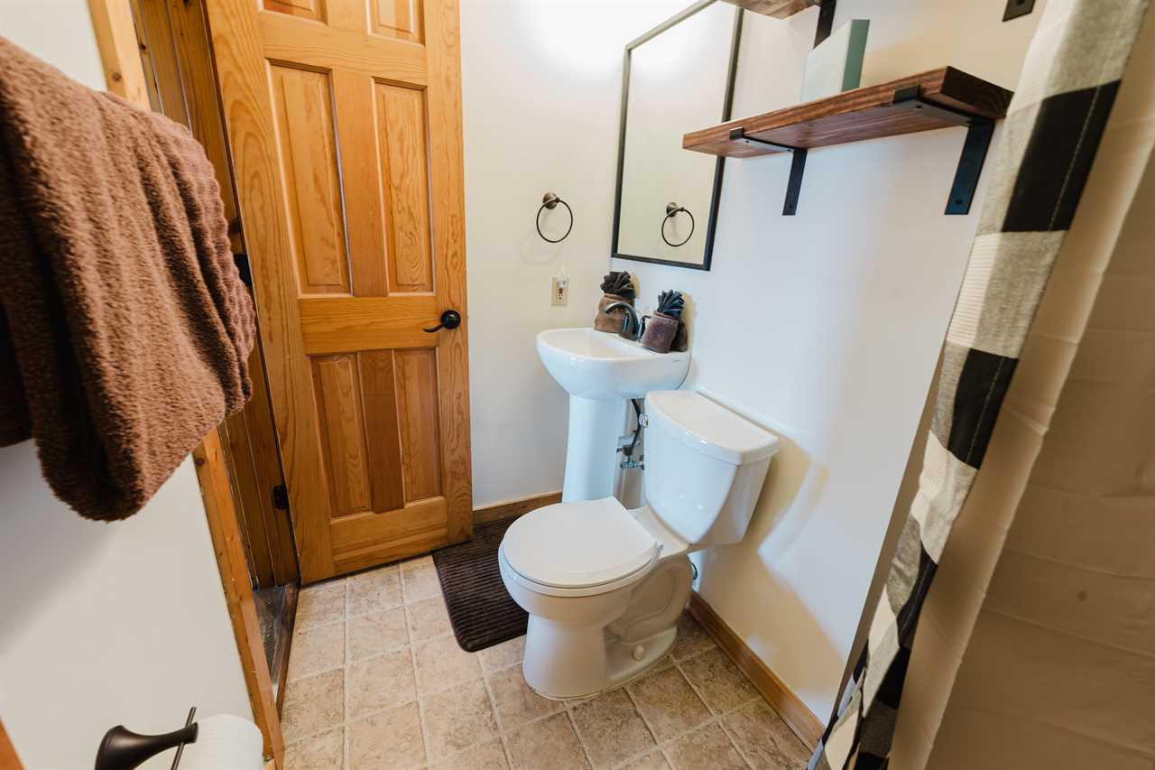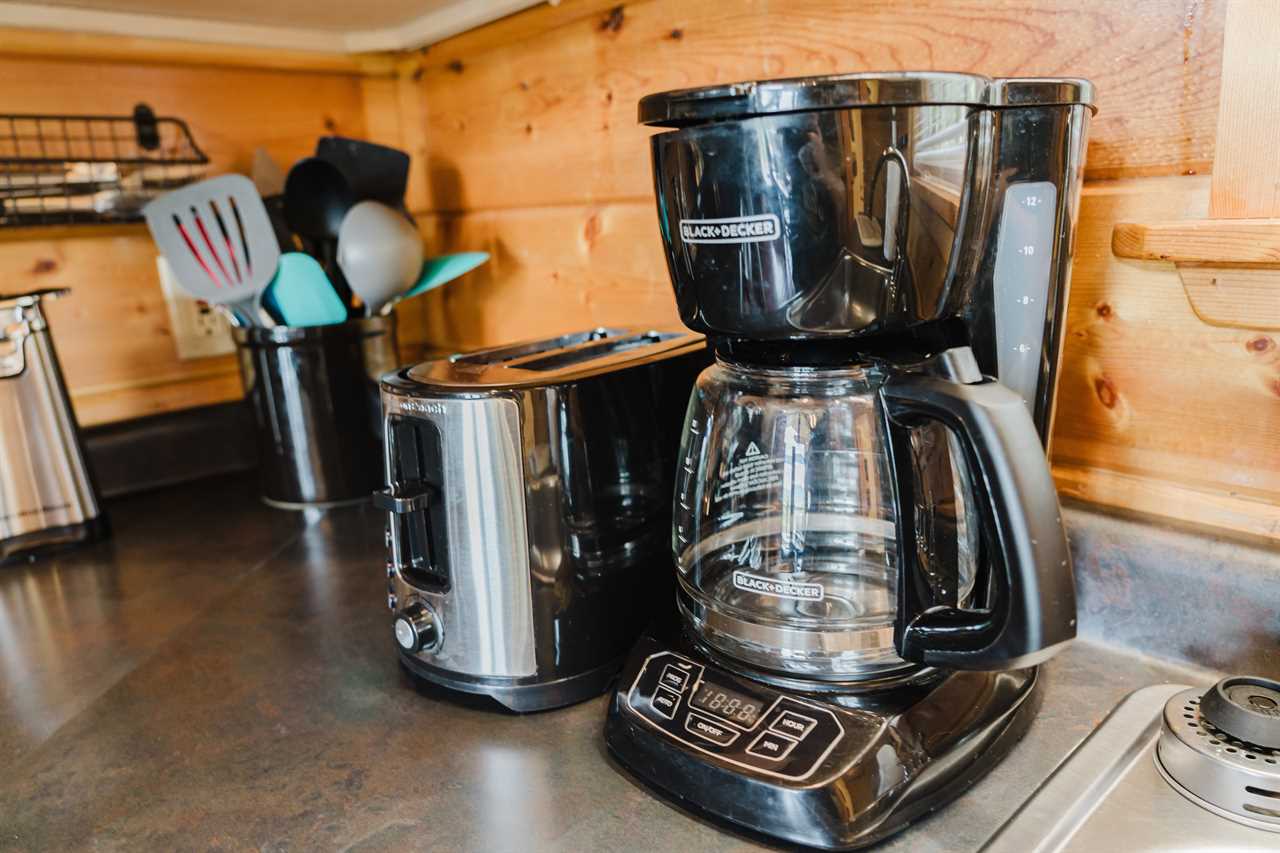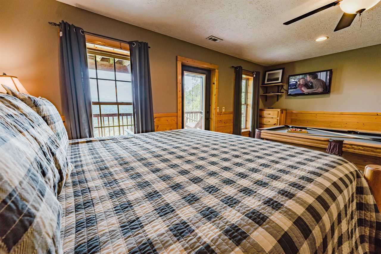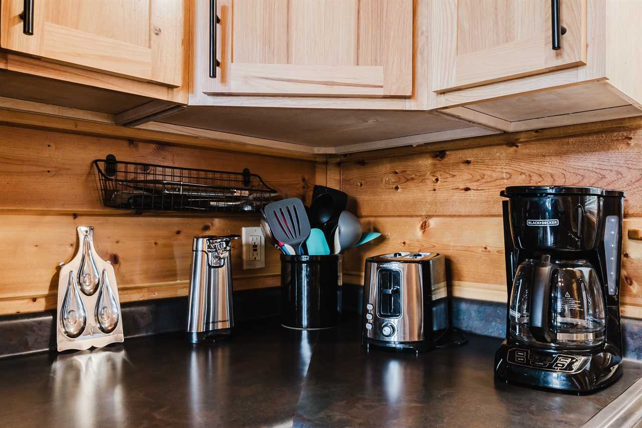 Cozy up in the inviting living room where comfort and relaxation await. Sink into the comfy armchair or loveseat by the electric fireplace and get lost in your favorite show on the flat-screen TV. When it's time to rest, the full Murphy bed effortlessly folds down from the wall, providing a convenient and spacious sleeping area for two. With its rustic charm and modern amenities, this living room is the perfect retreat after a day of exploring the great outdoors.