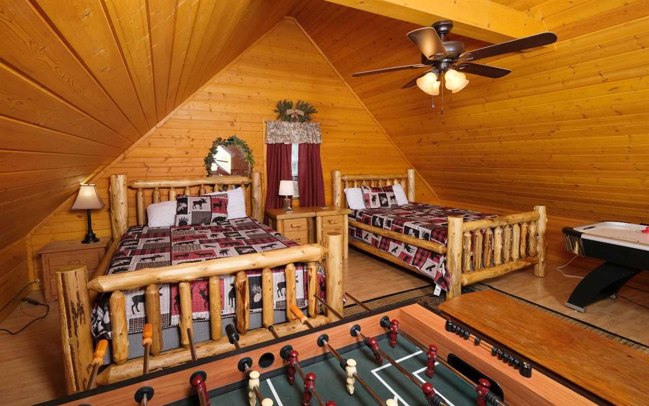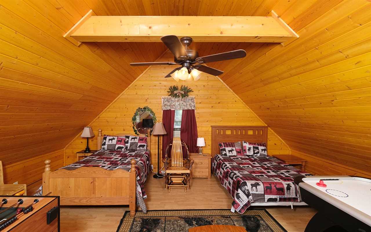 Enjoy restful nights across three cozy sleeping spaces with cabin charm.