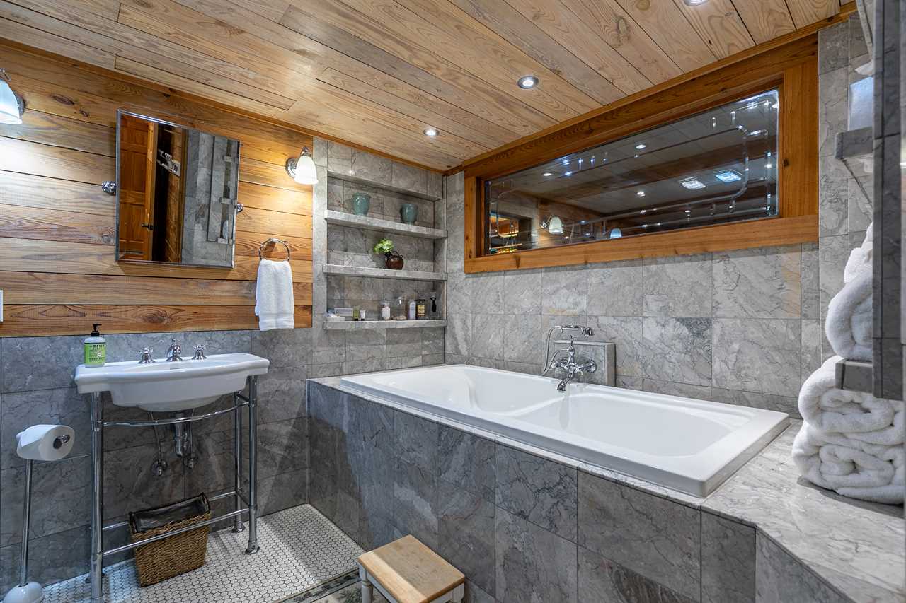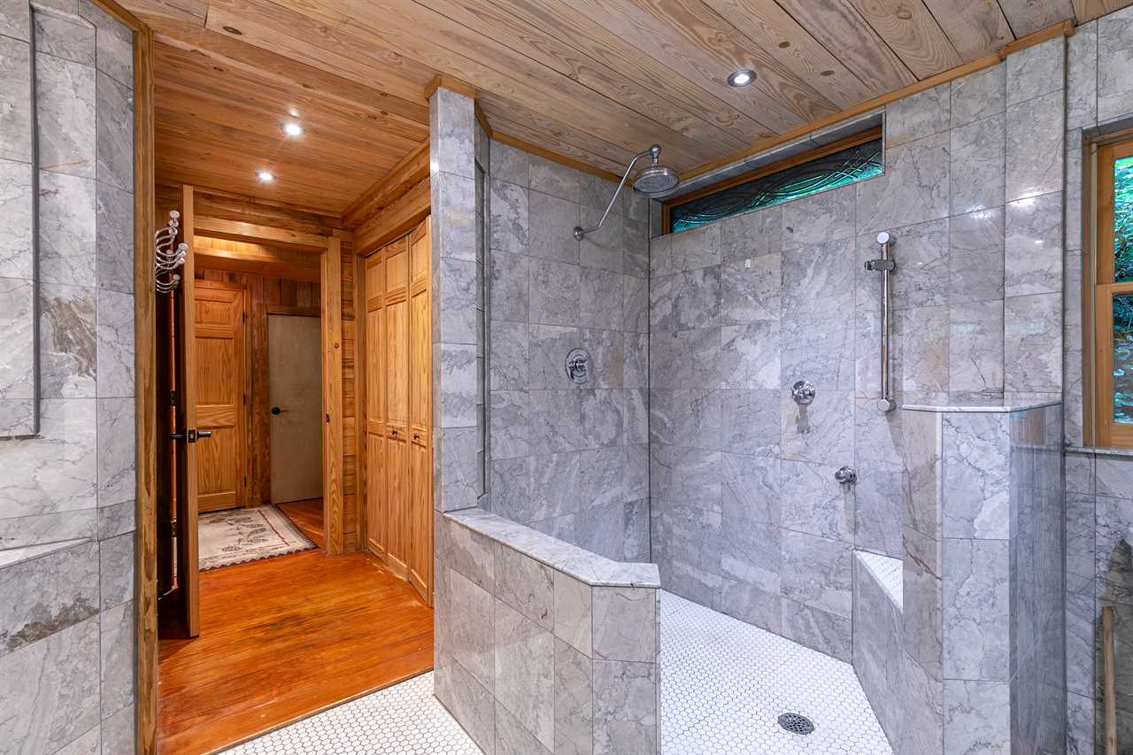 The spacious master suite on the main floor features a king bed, etched glass windows overlooking the river, and a beautiful private bathroom featuring a large tub as well as a separate shower with a rainhead. Just off the bedroom is a sunroom and access to the covered parking bay.
