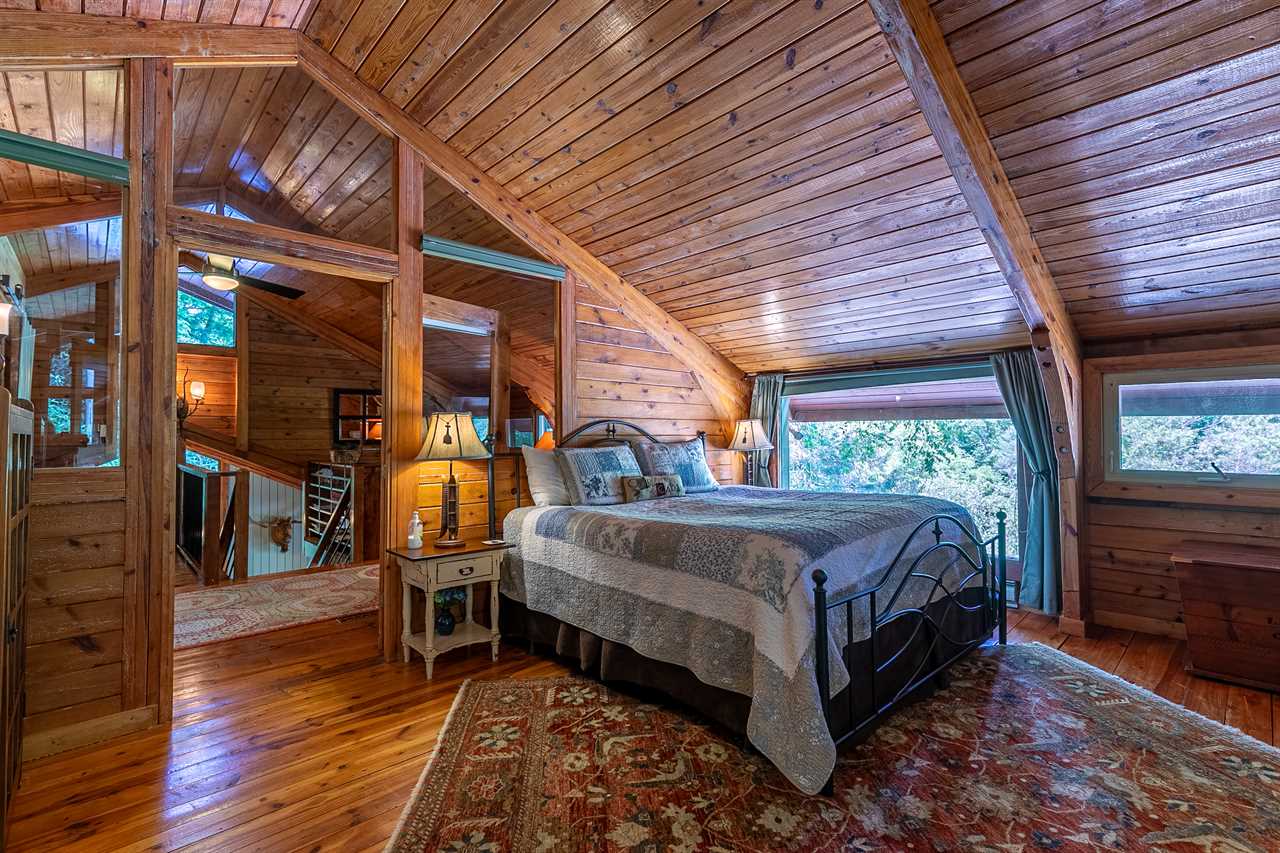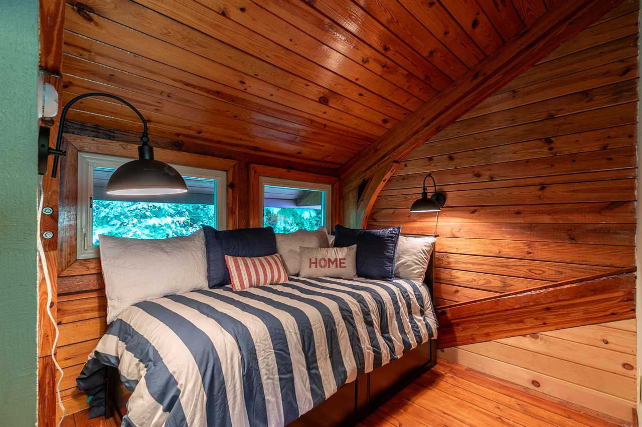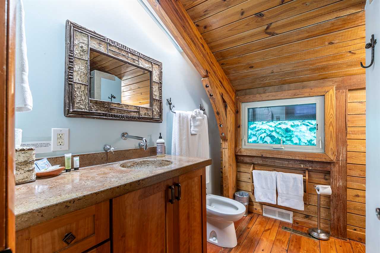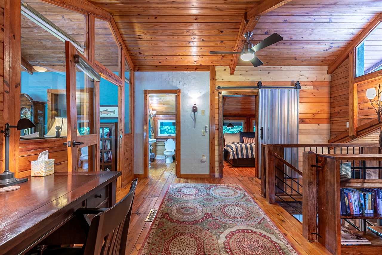 Climb the wide spiral stairs to the upper level, which contains the loft area with a desk housing the computer workstation with high speed internet and printer, two full-sized futons, and a full bath with a shower. Adjacent to the loft is another beautiful king suite with a private full bathroom with bidet. Off of the loft there is a third bedroom with twin over twin trundle bed connected to the loft with a barn door.