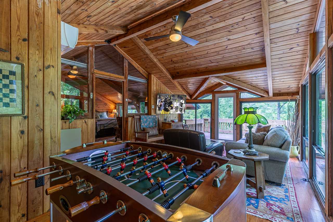 Beside the upstairs king suite is the glass-enclosed game room/sitting room, featuring a foosball table, Xbox360, TV, and comfortable chairs, perfect for entertaining the time away on a rainy day. From the game room you can walk out onto a small upper deck with a cafe table and chairs.