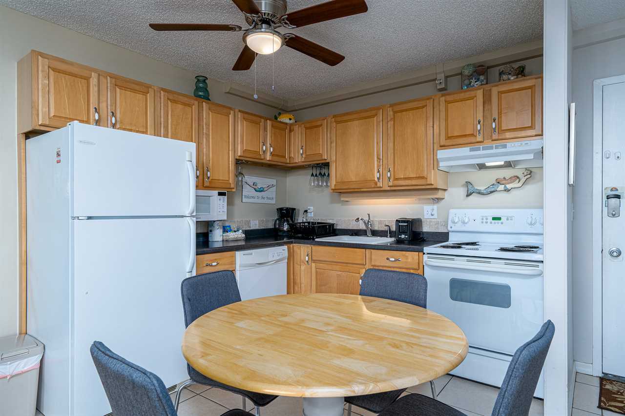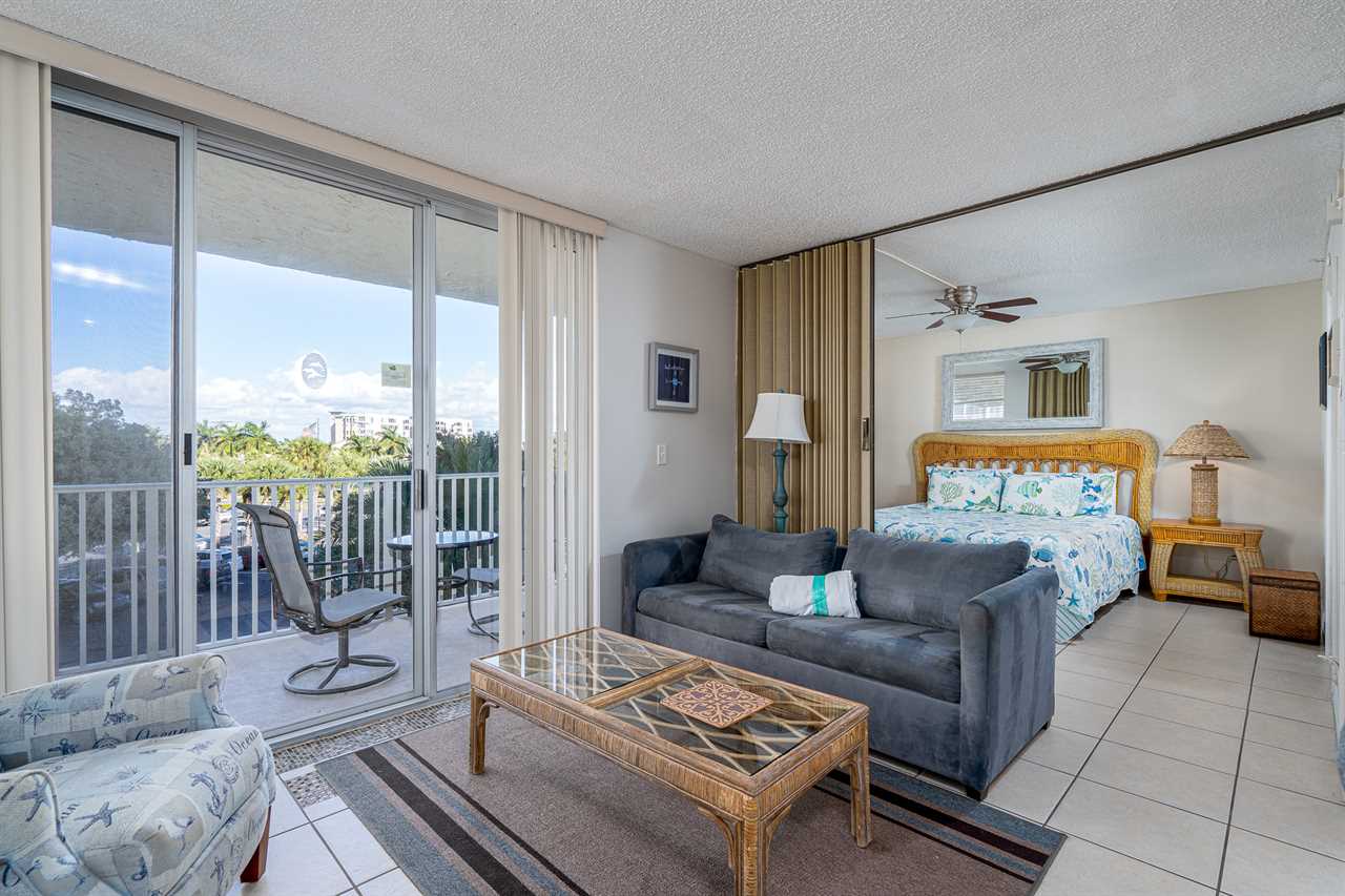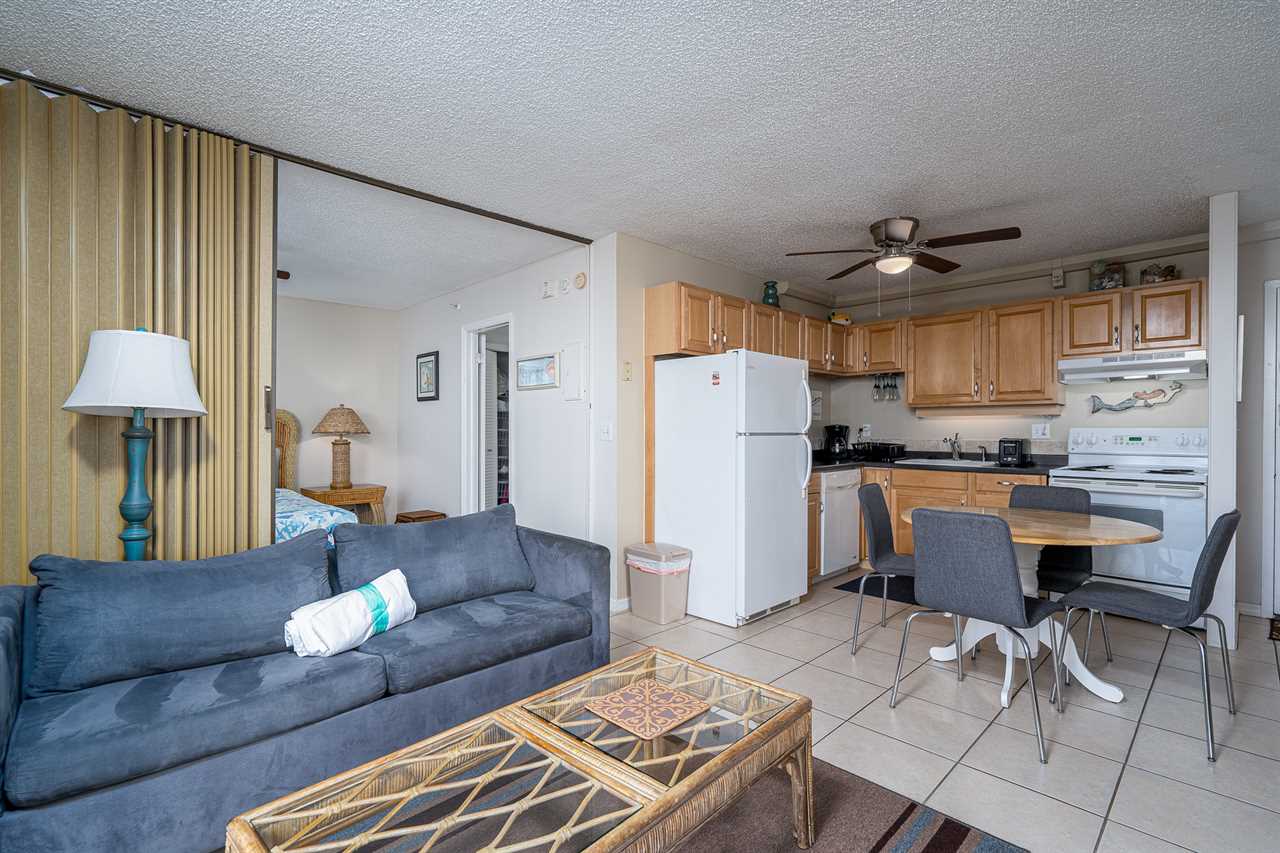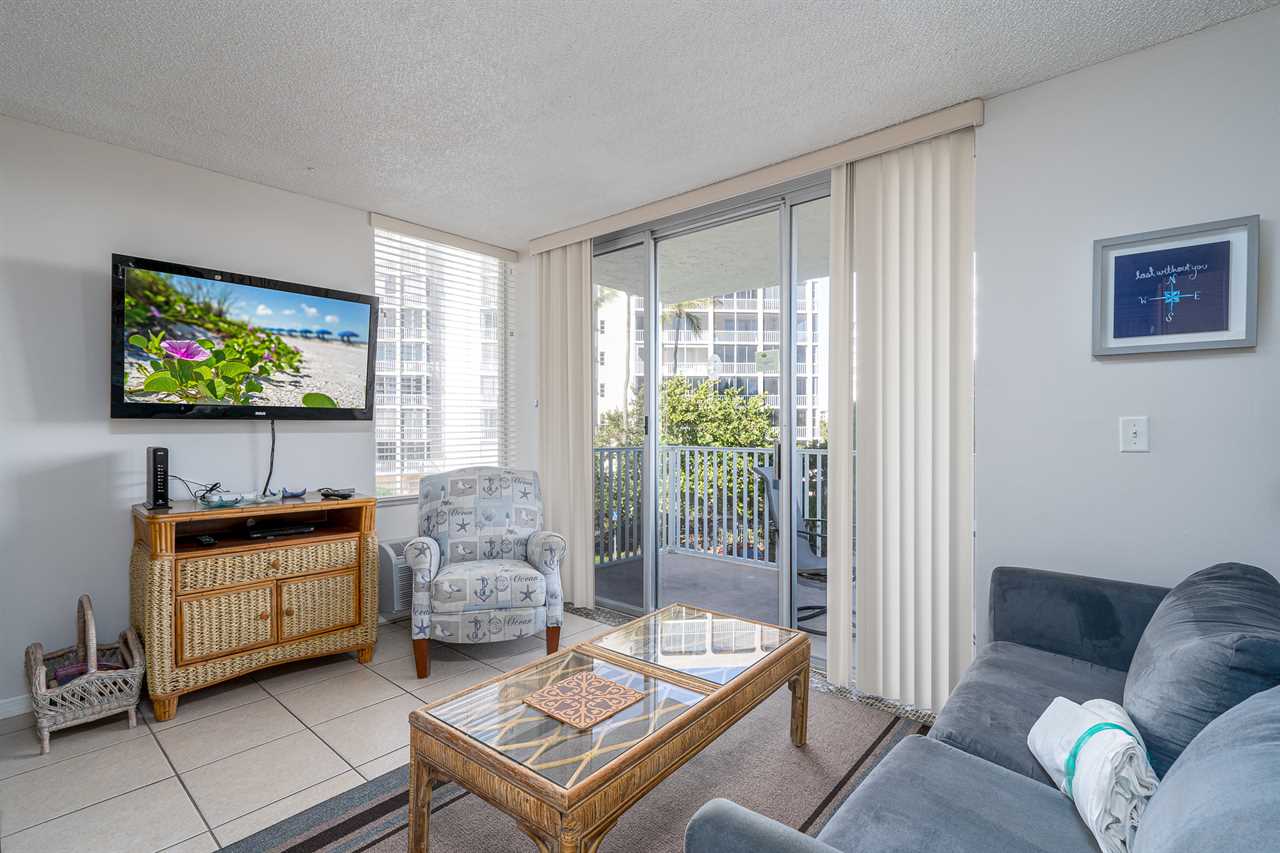 Entry is via elevator to the second floor and into the open-plan kitchen, dining, and living areas. The kitchen is equipped with everything necessary to prepare full-course meals if so desired. Appliances include a refrigerator/freezer, range with oven, dishwasher, and microwave oven. The dining table seats four. The living area has a sleeper sofa and coffee table on an area rug, opposite which is a large flat-screen TV. Sliding glass doors provide access out to the furnished balcony.