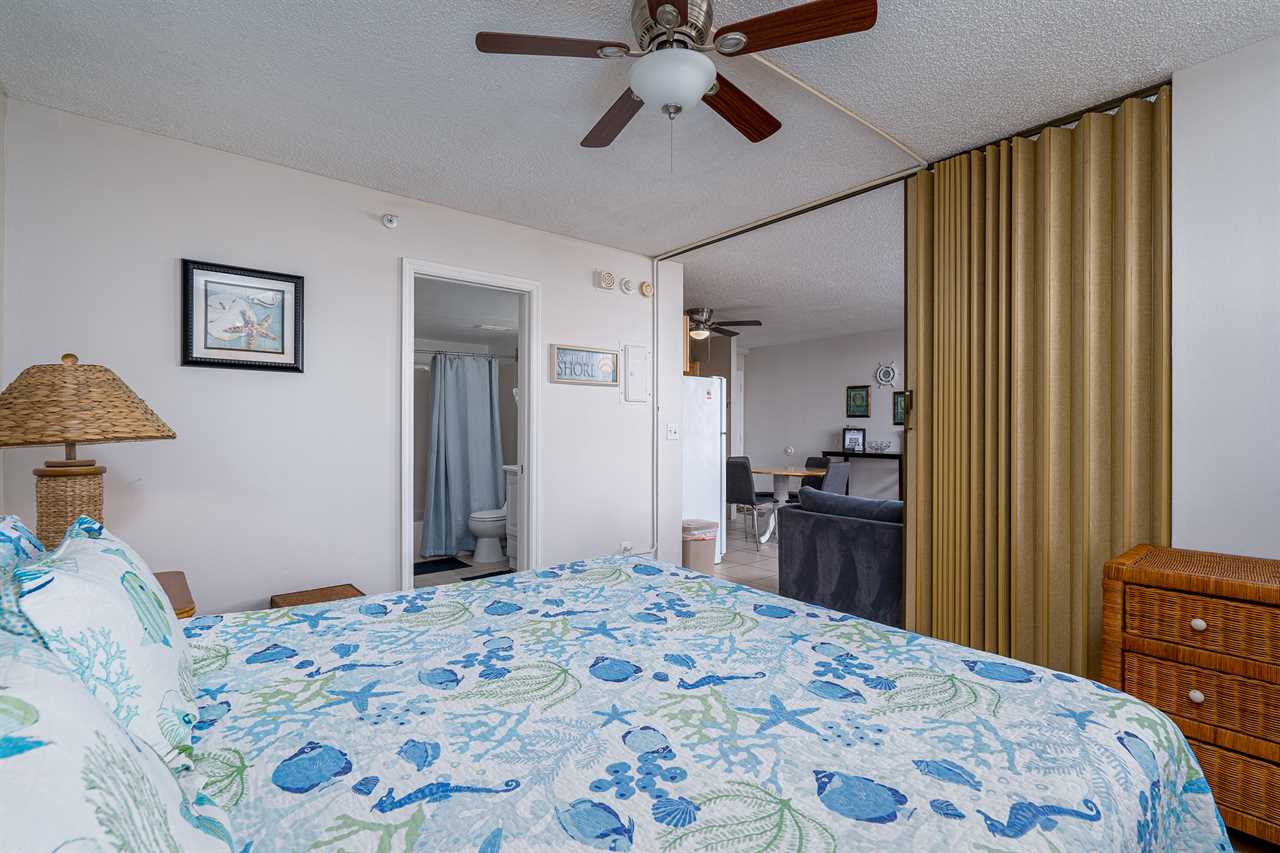 The bedroom is furnished with a king-size bed, nightstand and lamp, a three-drawer chest, and a double dresser with lamps and a mirror. A floor-to-ceiling accordion door provides privacy for the bedroom. The en suite bathroom has a vanity with a lavatory, commode, and a combination tub/shower.