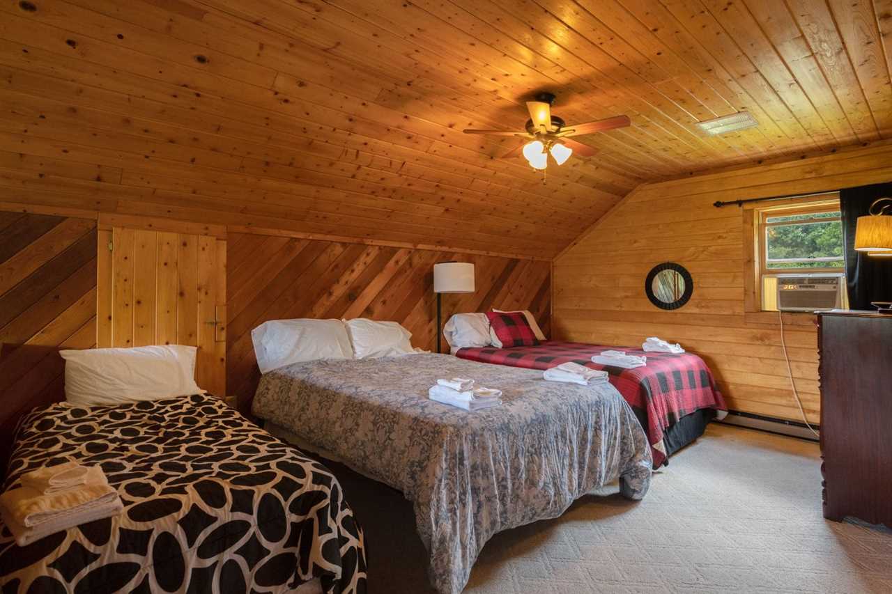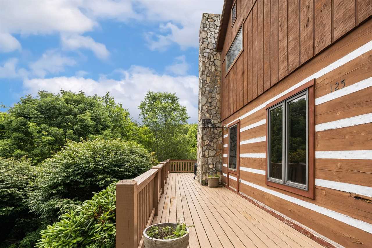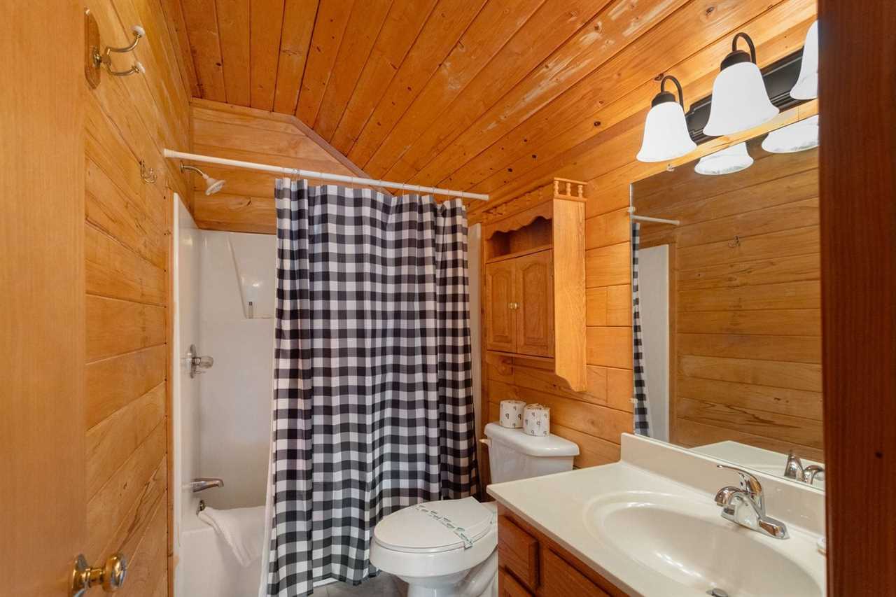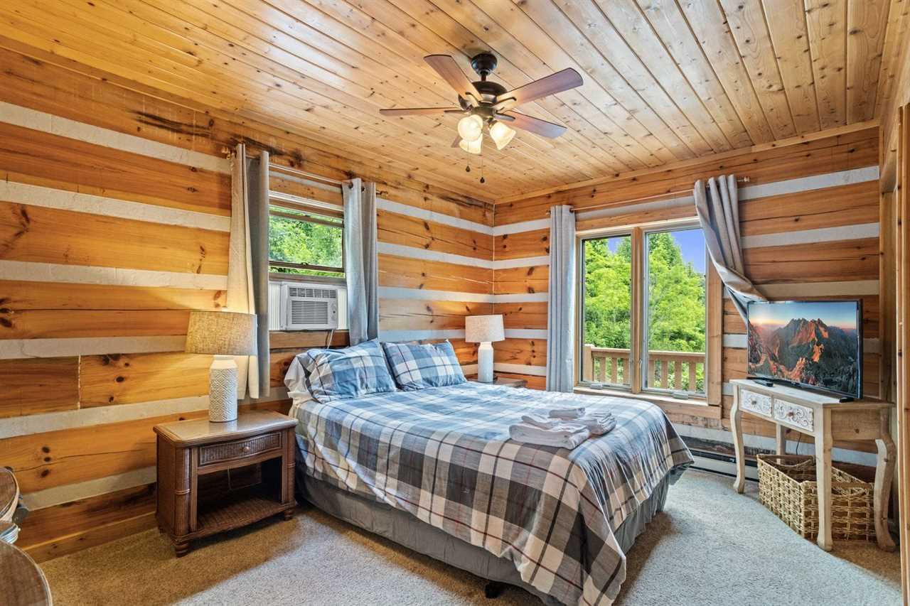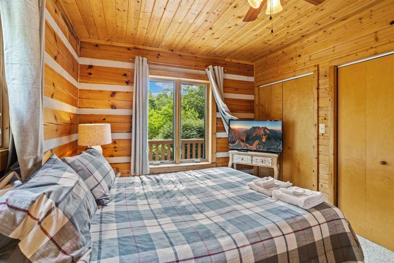 This is a two-bedroom log cabin with a loft that serves as an additional sleeping area. The loft has a full bed, a twin bed, and a full bath. On the main floor, the two bedrooms share a full bath. One room has a king bed, while the other has a queen bed. This home is in a prime location, just off Poplar Grove Road, only 5 minutes back to Highway 105 in Boone, and 8 minutes to the main intersection in Boone. You can also easily reach Blowing Rock, either going through Boone or down Popular Grove Road to Shulls Mill Road. The main floor features central heating and cooling, while the upper level has electric baseboard heat and seasonal window units for air conditioning, providing a welcome coolness on rare days in the mountains when a little cooling would be appreciated.