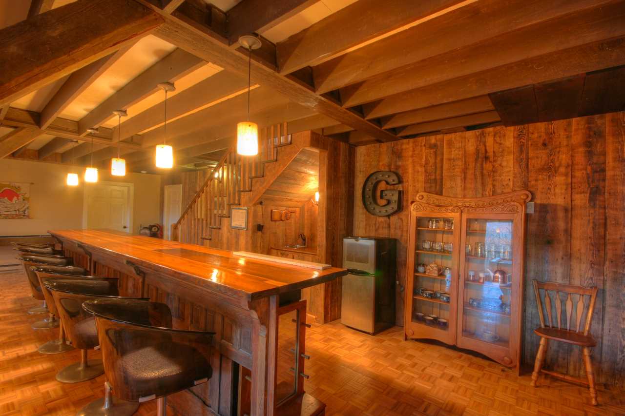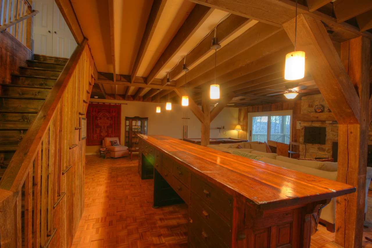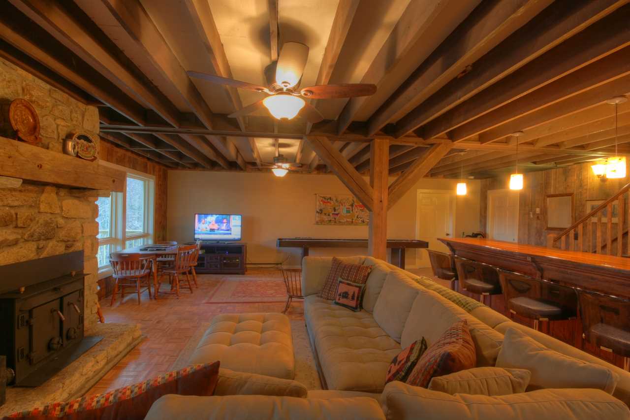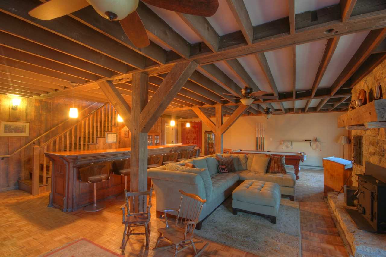 Downstairs opens to a large central den with a bar and game room. There is a comfy, central L-shaped sofa and an additional seating area with two stuffed chairs and a coffee table. Games include an 8-foot slate pool table with a ping pong topper and a foosball table. A large Smart TV with a BluRay player rounds out the entertainment equipment. The room's focal point is the solid-wood bar, nearly 200 years old and originally the ticket counter in a train station. It was saved from destruction and repurposed to serve as a beautiful bar with six bar stools. Behind this bar are a bar sink and fridge. The den has a second table and chairs for gameplay or additional dining.