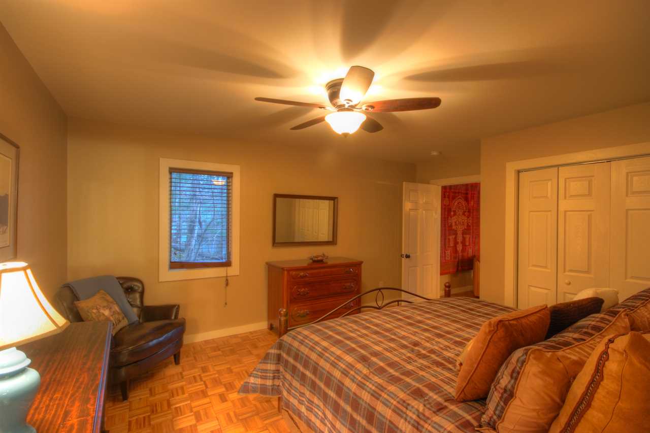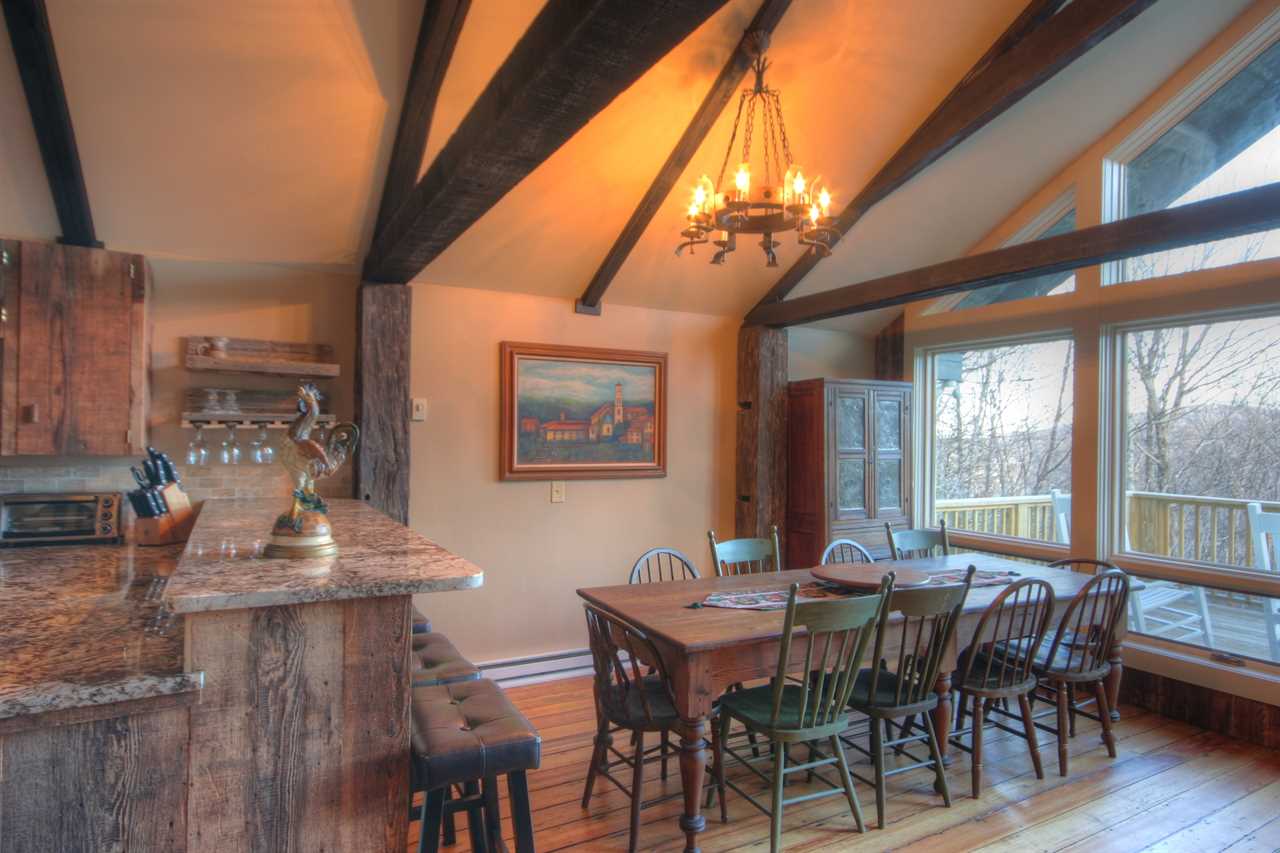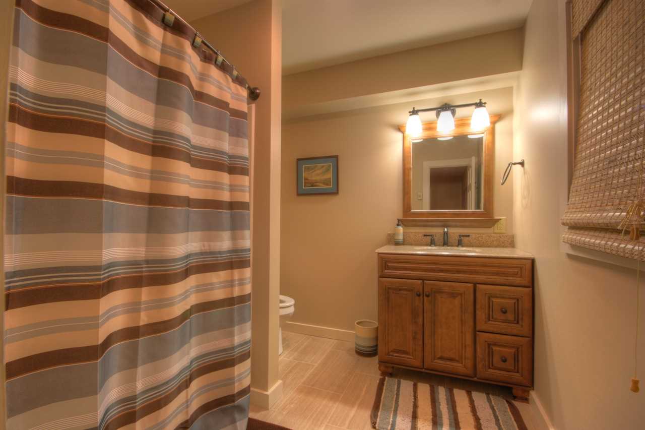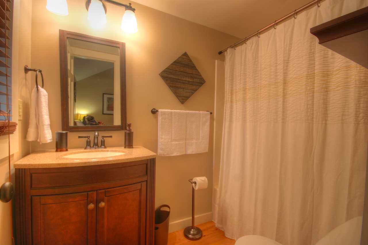 Downstairs opens to a large central den with a bar and game room. There is a comfy, central L-shaped sofa and an additional seating area with two stuffed chairs and a coffee table. Games include an 8-foot slate pool table with a ping pong topper and a foosball table. A large Smart TV with a BluRay player rounds out the entertainment equipment. The room's focal point is the solid-wood bar, nearly 200 years old and originally the ticket counter in a train station. It was saved from destruction and repurposed to serve as a beautiful bar with six bar stools. Behind this bar are a bar sink and fridge. The den has a second table and chairs for gameplay or additional dining.