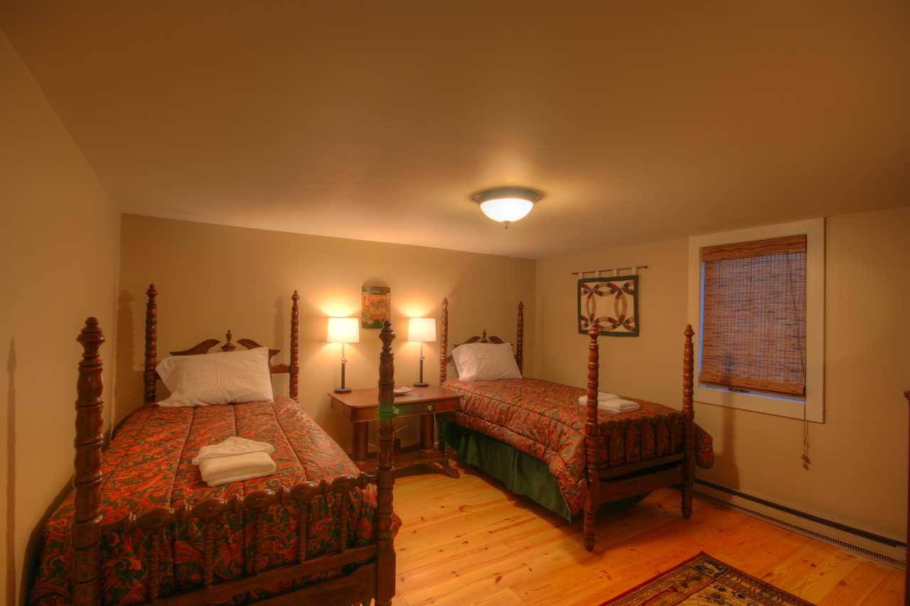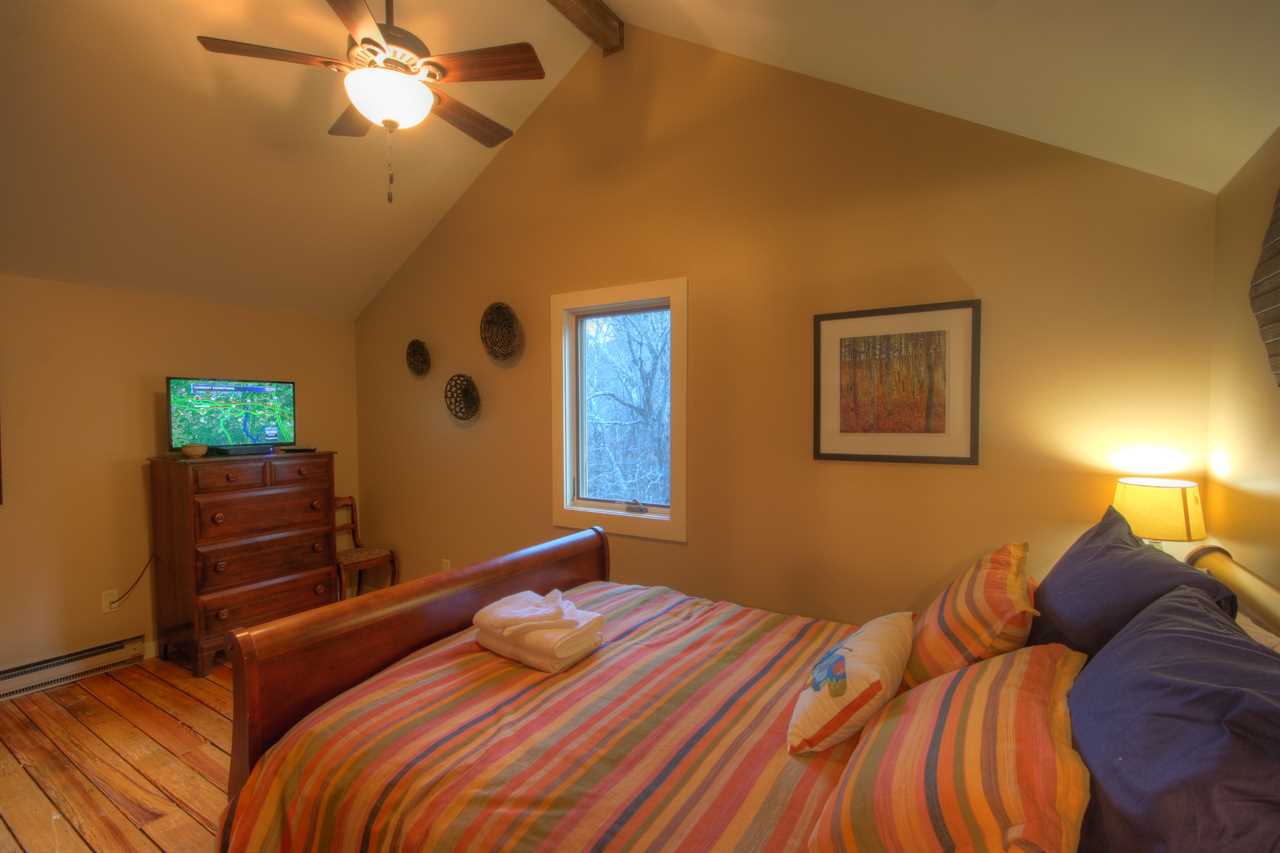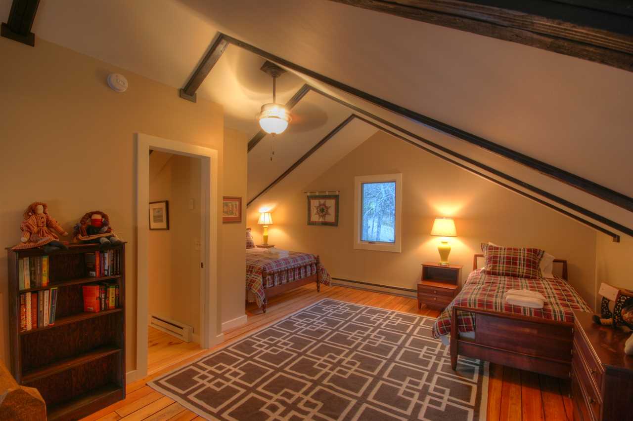 Upstairs is a spacious loft bedroom with a full bed, a twin bed, and a full bathroom with a shower.