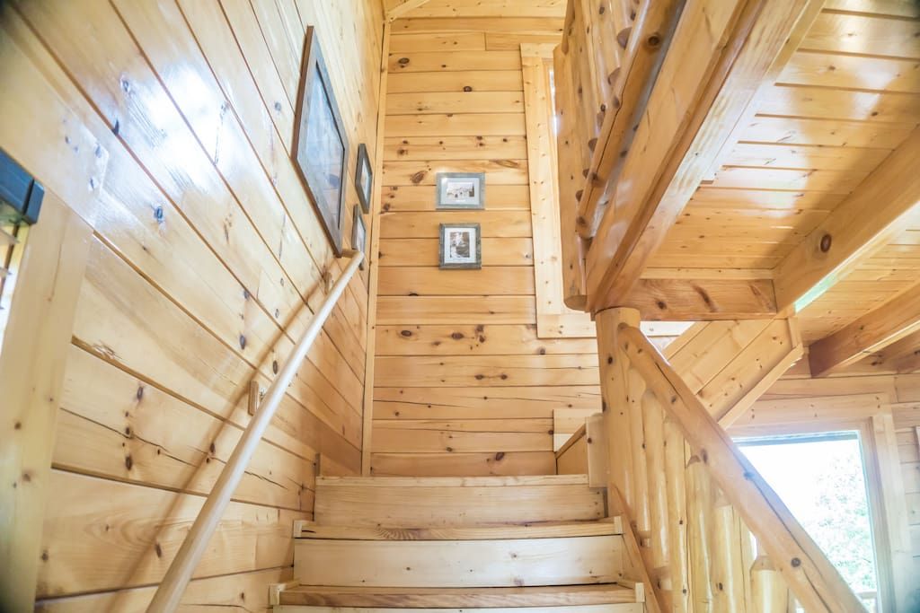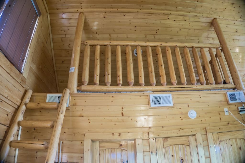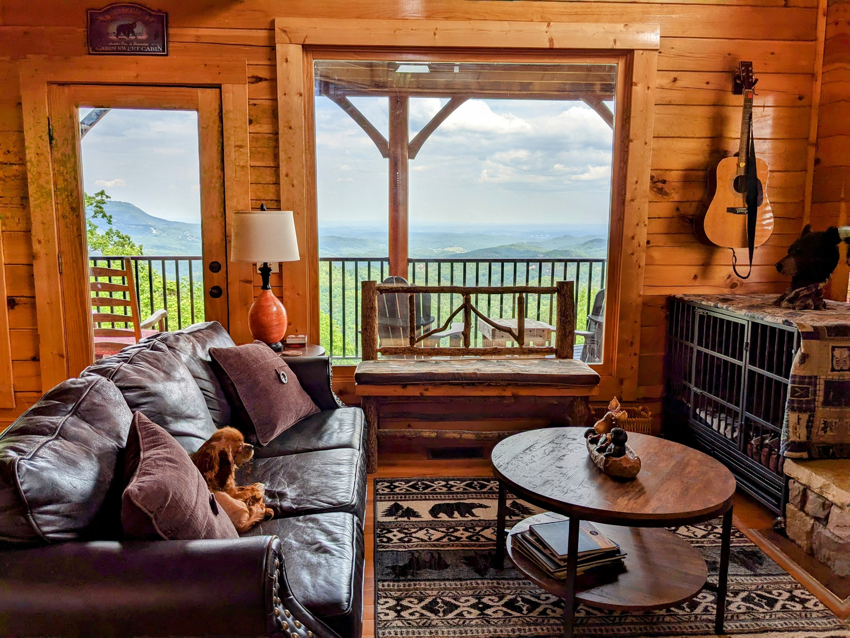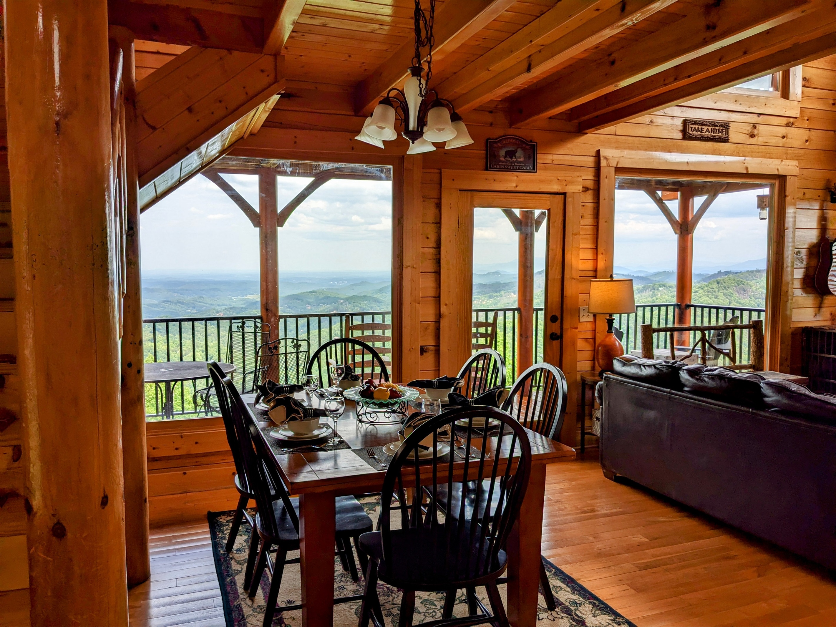 This handcrafted all‑wood cabin welcomes you with a full galley kitchen featuring stainless steel appliances and cement tile floors, opening into a charming dining area with seating for six. The main level’s open floor plan, hardwood floors, and floor‑to‑ceiling windows showcase sweeping Smoky Mountain views from nearly every angle. A king master suite with a private bath is also located on this level.