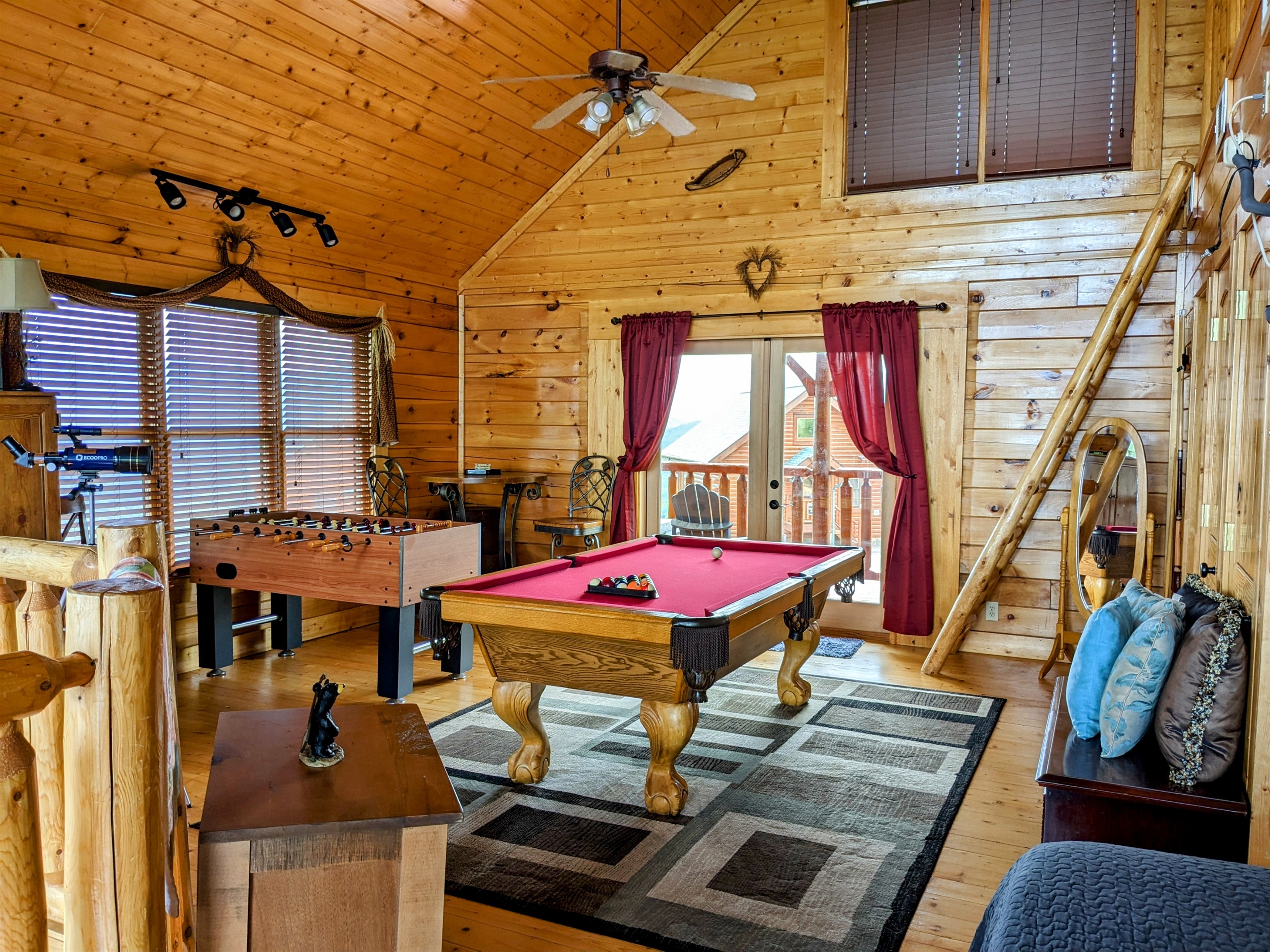 Upstairs, the large upper-level doubles as a bedroom and game room, complete with a full bath, Jacuzzi tub, pool table, and its own deck with hot tub. Kids will love the small ladder‑access loft on this level.