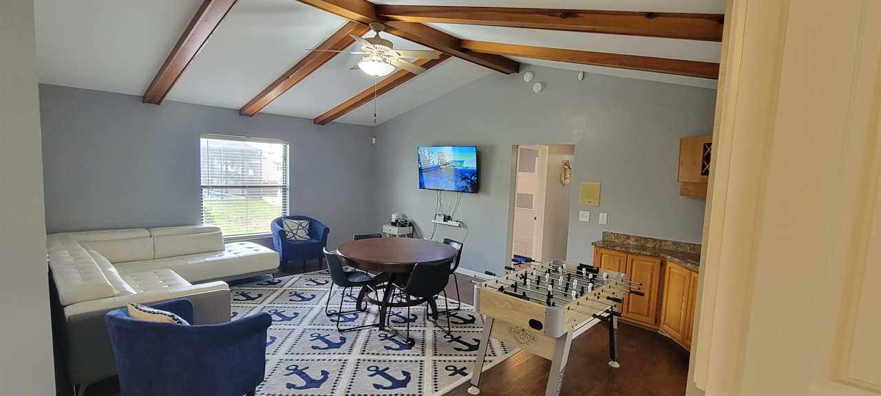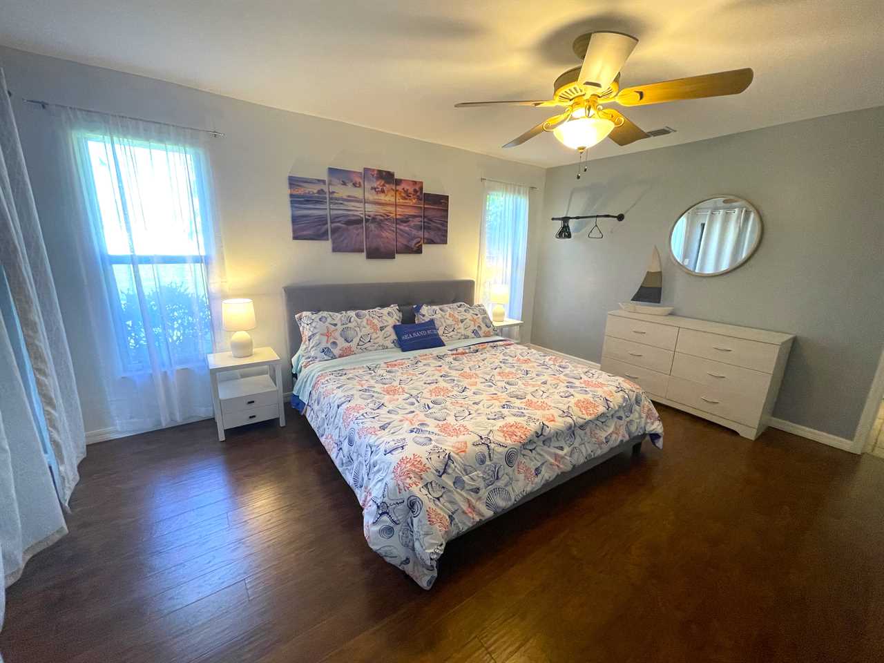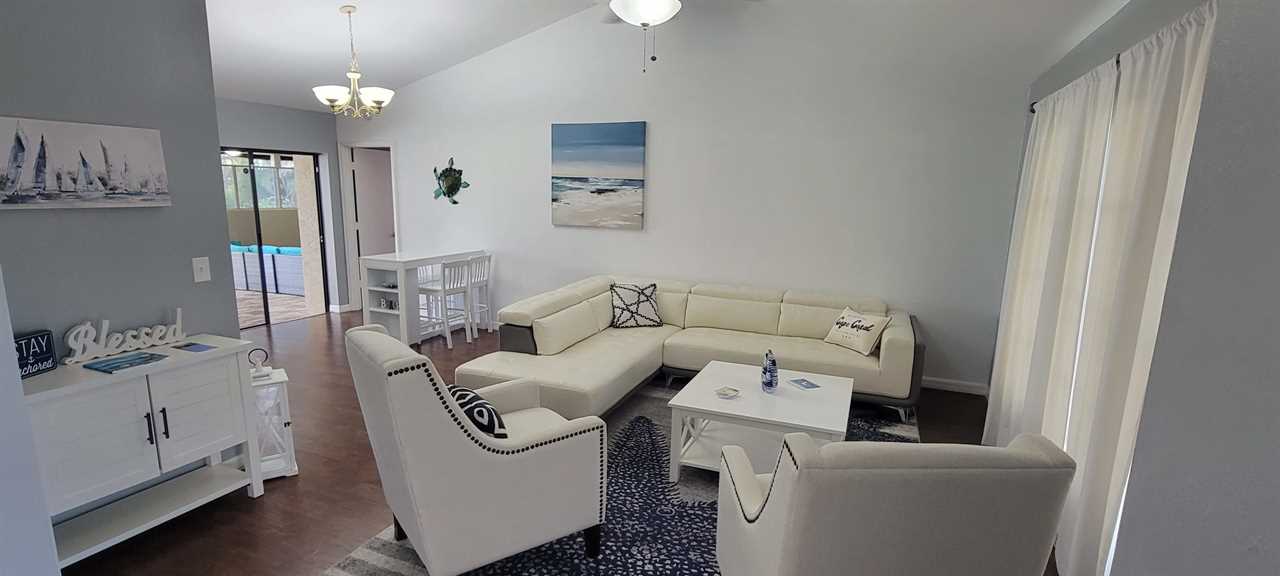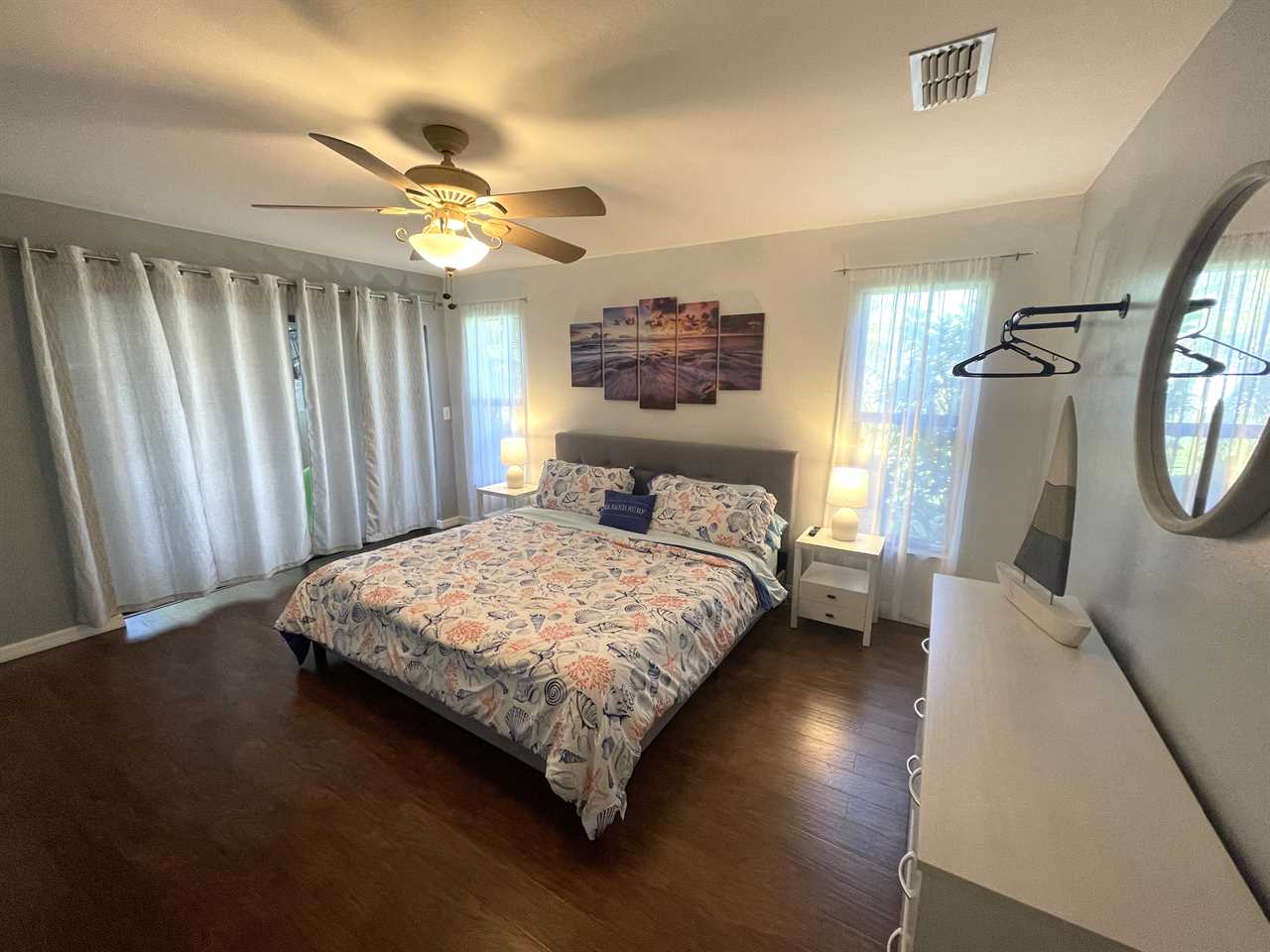 The property offers 3 bedrooms: king in master, queen in back guest room and 2 full size bunk beds in 3rd guest room, Bunk bedroom has overhead light in place of fan for added safety. Master bath features dual vanities and a roman shower. The guest bathroom has a shower/tub combo and accesses the pool area. Fully stocked kitchen allows for homecooked meals with family and friends. This home also offers a comfortable living space and spacious family room complete with foosball table and Xbox 360 consol. The flat screen TVs in living room, master bedroom and guest bedroom are Wi-Fi ready for your streaming services and offer Flex TV. High speed internet is available throughout the home. Fantastic pool area with outdoor seating, pool toys/floats and TV, perfect for a relaxing vacation, electric heated pool and accessible boat dock with gulf access views. Pool heat can be controlled and adjusted by guest. Master bedroom does not have a closet for guest use.