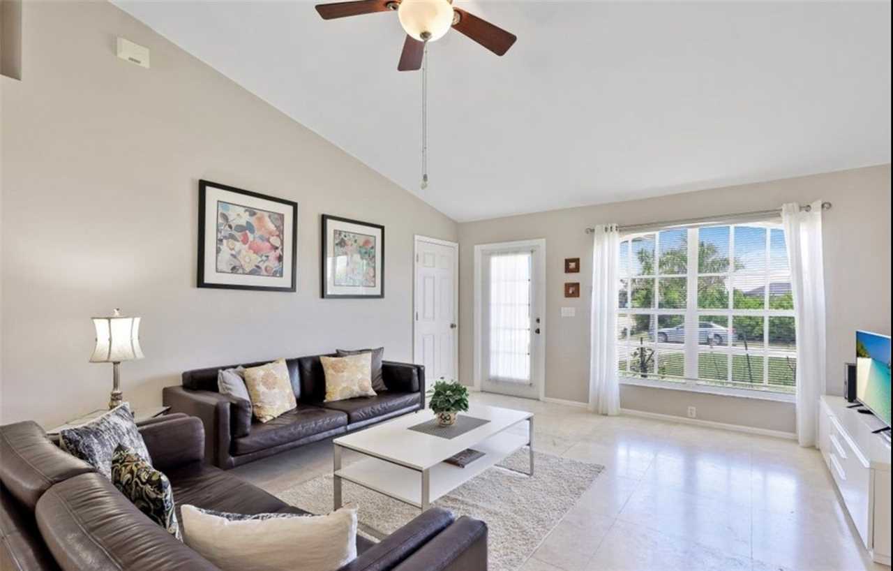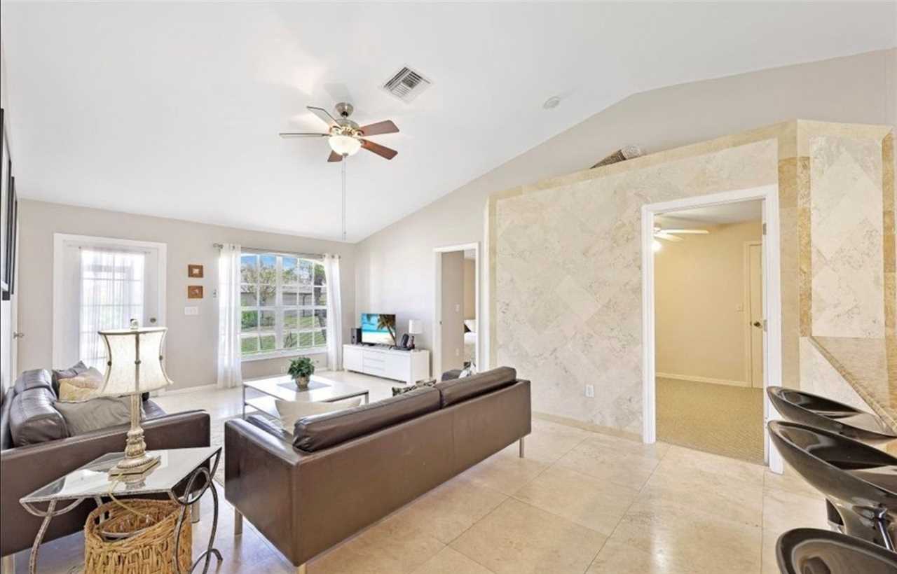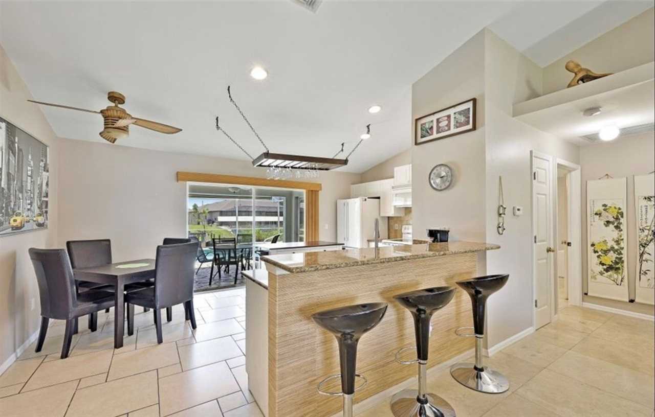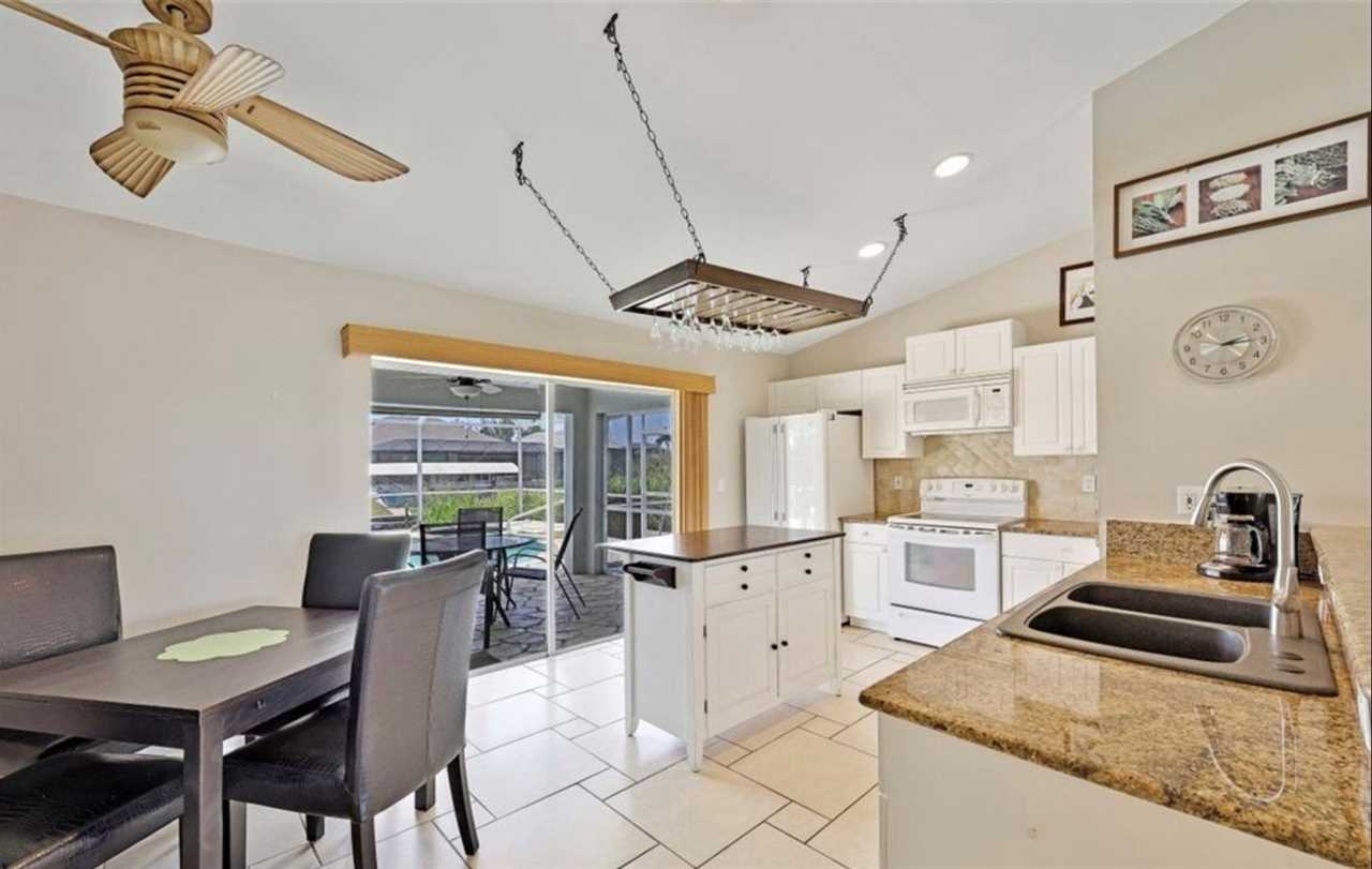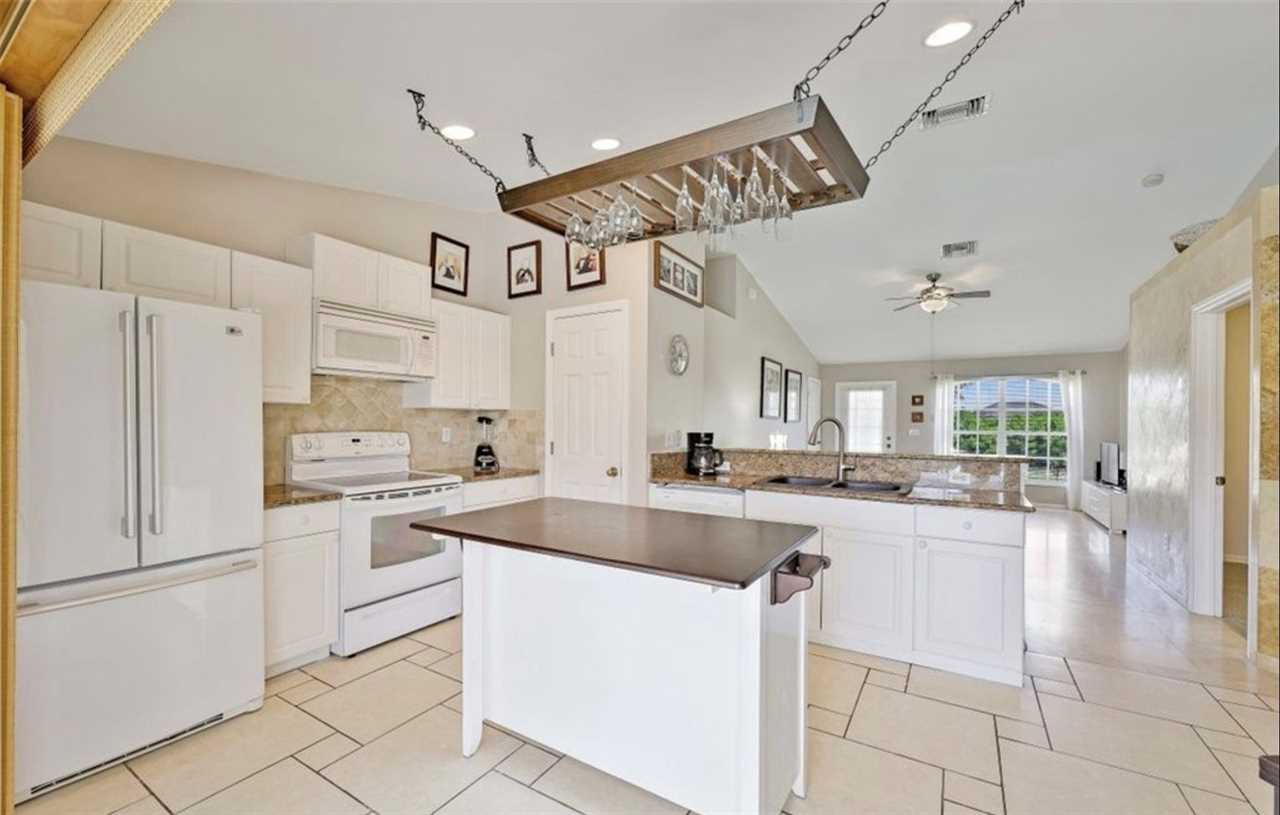 This charming vacation home features a split floor plan with 3 bedrooms, 2 full bathrooms, 2 car garage, a large open living room with plenty of sunlight, a fully equipped kitchen with access to lanai area and breakfast bar seating for three. Dining room is just off the kitchen and seats four people.