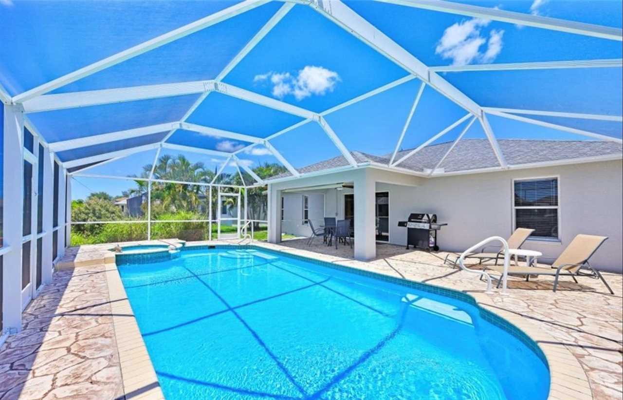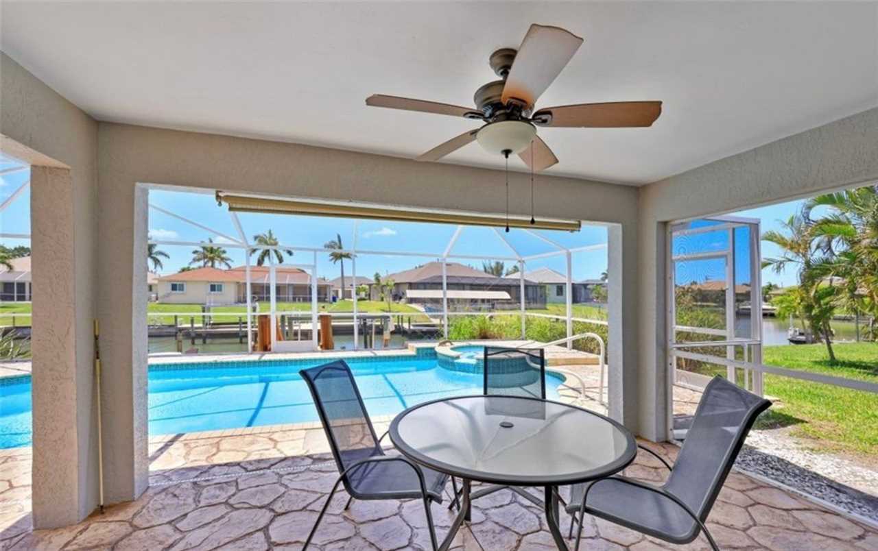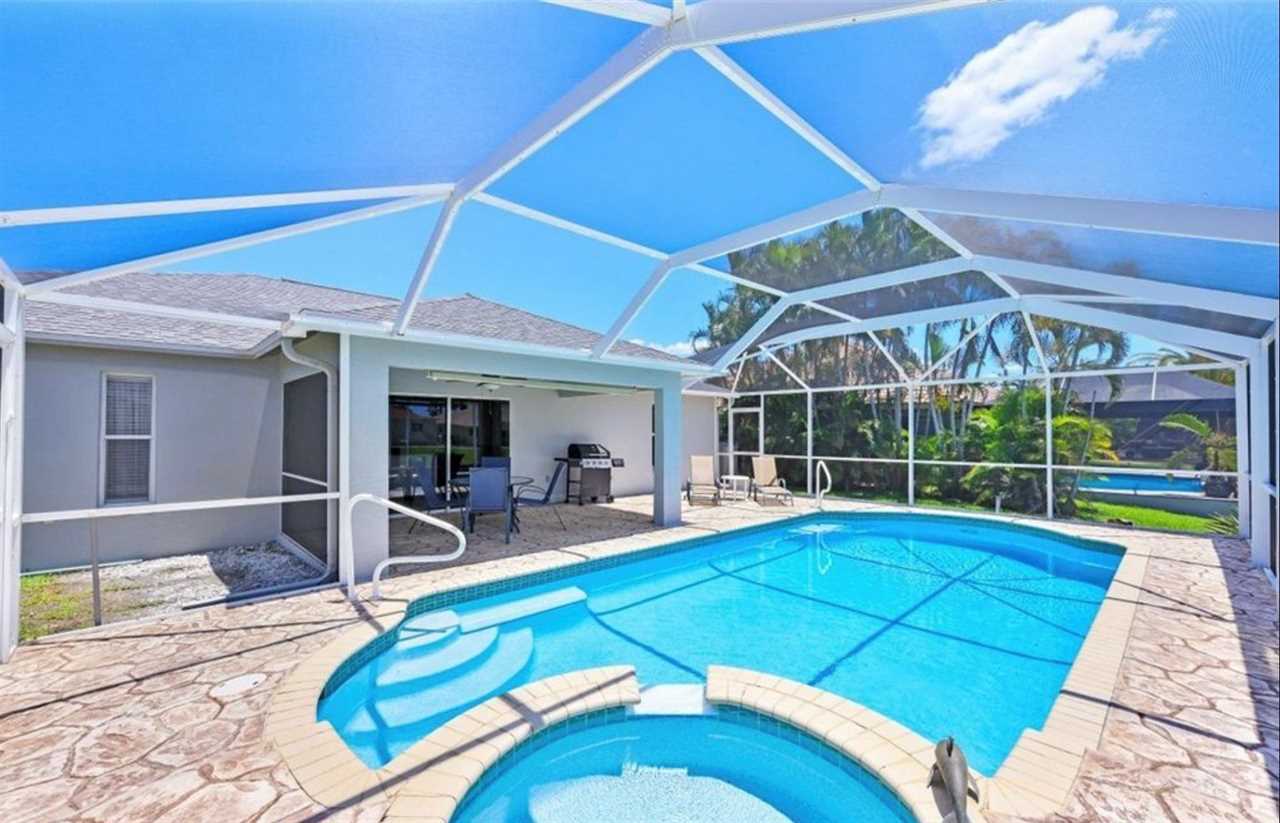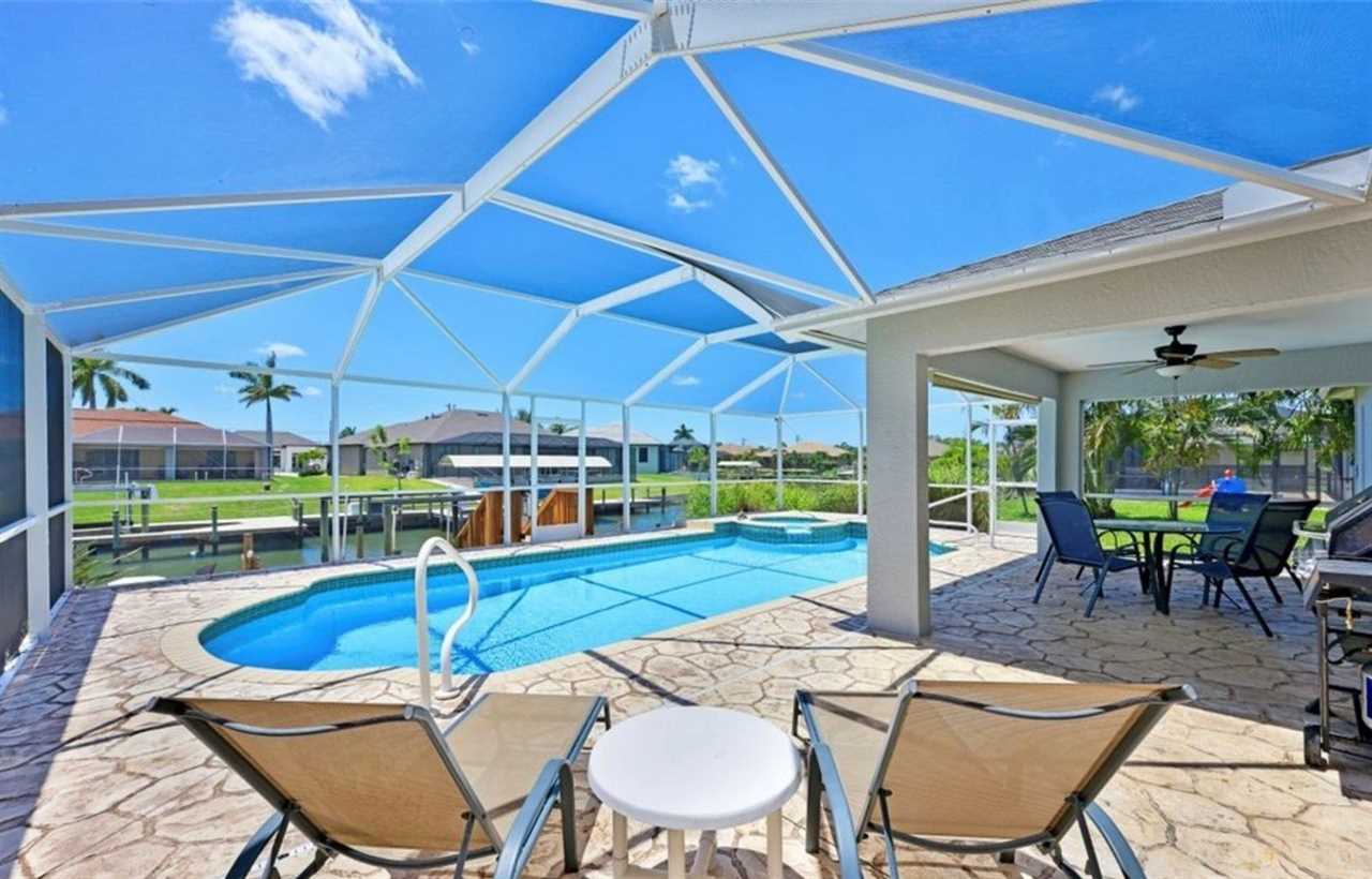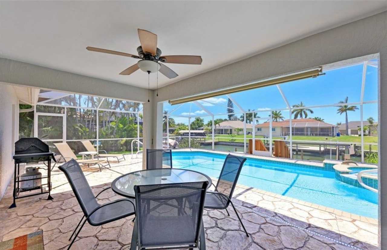 Relax in this private outdoor oasis with electric heated swimming pool, spa and view of the gulf access canal. The covered lanai is functionally designed with outdoor dining, a propane BBQ grill, and pool lounge chairs for your enjoyment. For boating enthusiasts, this canal provides access to the Gulf through Finisterre Lake and Tarpon Point. *Please note that boat dock and lift are unavailable and not included in the rental