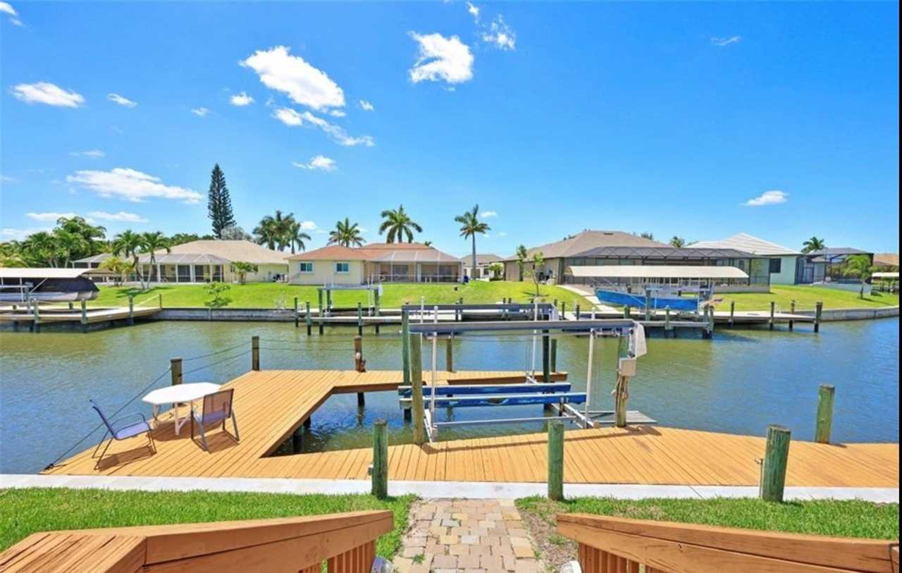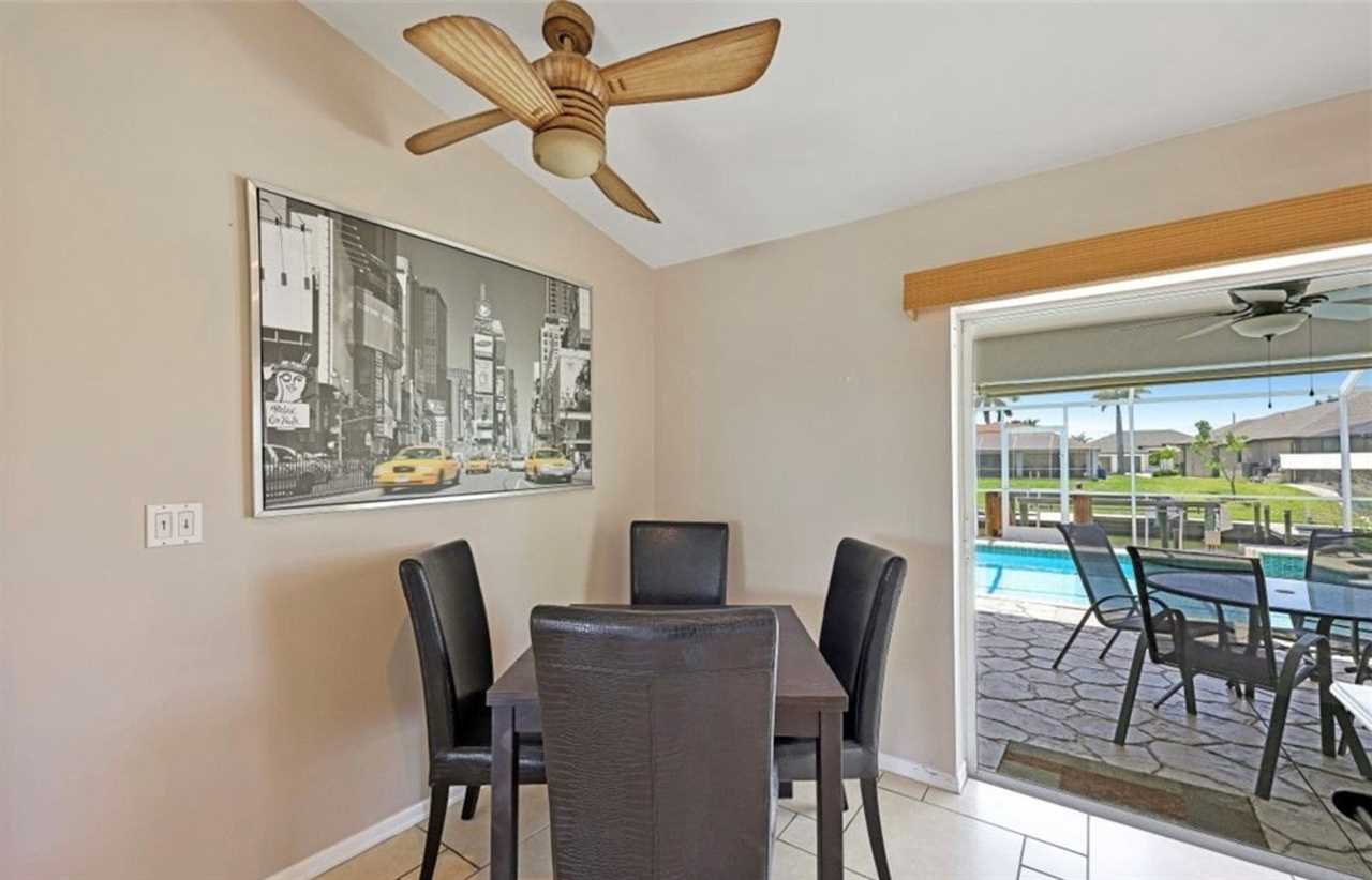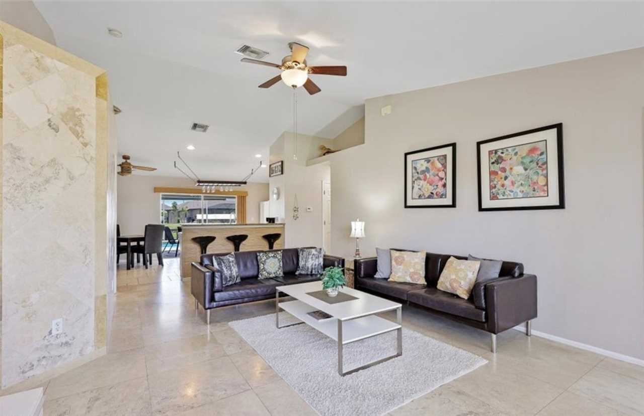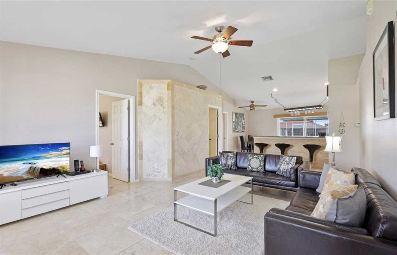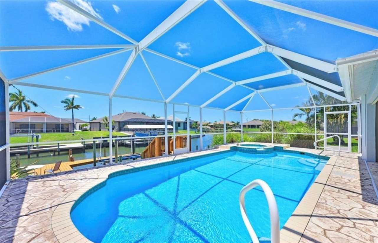 Relax in this private outdoor oasis with electric heated swimming pool, spa and view of the gulf access canal. The covered lanai is functionally designed with outdoor dining, a propane BBQ grill, and pool lounge chairs for your enjoyment. For boating enthusiasts, this canal provides access to the Gulf through Finisterre Lake and Tarpon Point. *Please note that boat dock and lift are unavailable and not included in the rental
