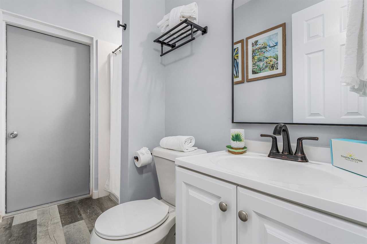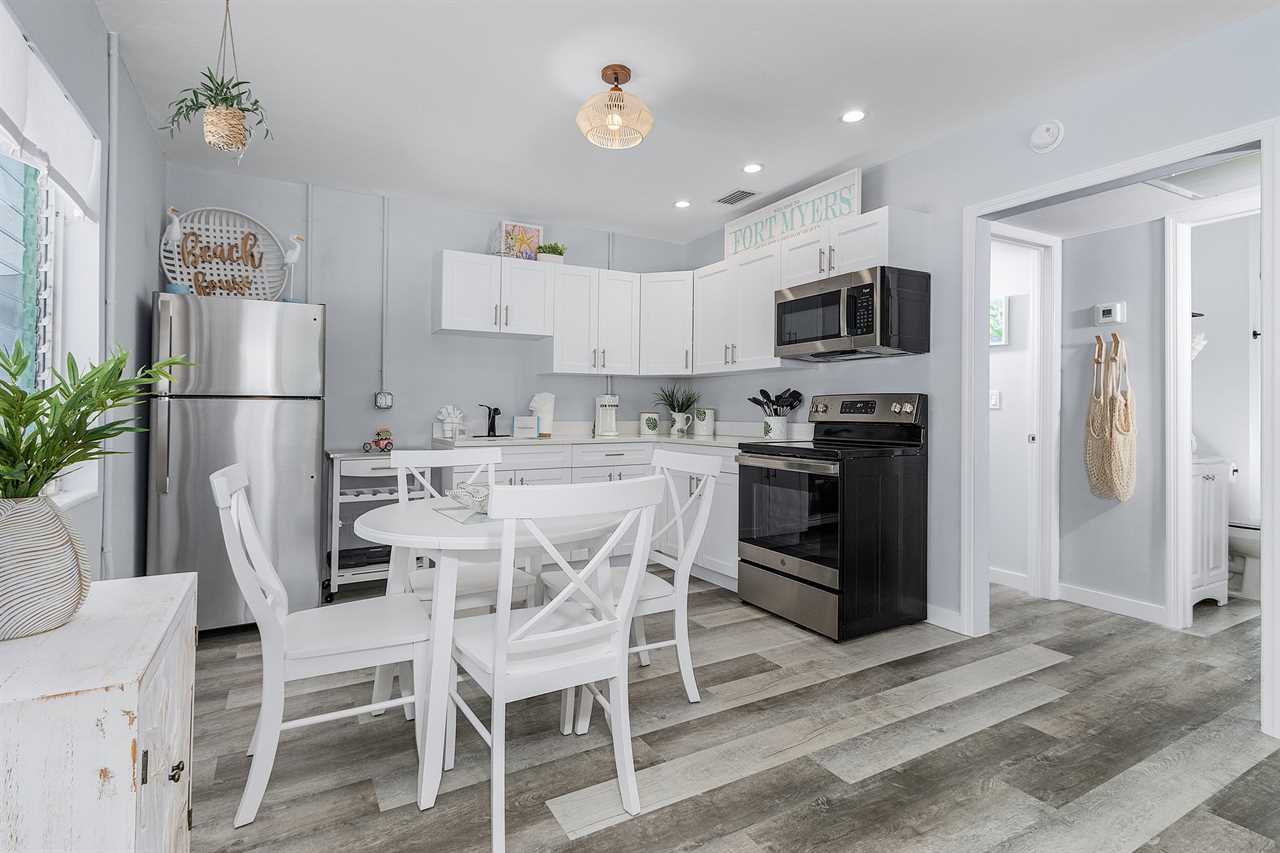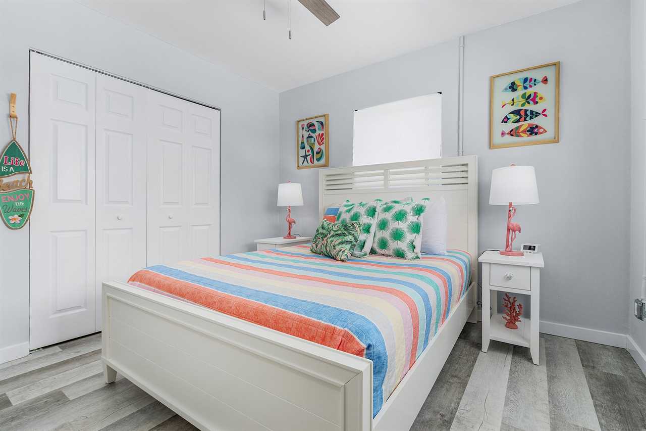 Upon arrival, there is ample off-street parking. Enter through the furnished screened-in front porch and into the open-plan kitchen, dining, and living areas. There is beautiful wood flooring throughout, and décor is a beachy motif. The kitchen has a quartz counter space, a stainless-steel sink, and well-stocked cabinets with everything necessary to cook full-course meals if desired. Appliances include a refrigerator/freezer, a 5-burner glass top range with a self-cleaning oven, a microwave oven, and a Keurig coffee maker. The dining area adjacent to the kitchen has a table seating four. This flows into the living area furnished with a queen-size sleeper sofa and area rug, as well as a corner accent table and lamp. Opposite the sofa are two matching side chairs and a wall-mounted large flat-screen TV.
