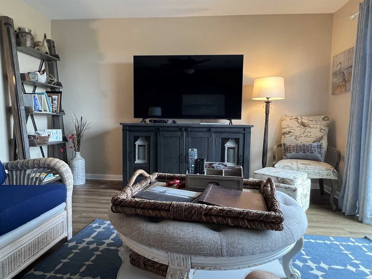 The living room was remodeled in 2021 and has a new 65” LG 4k Smart TV. The queen size sleep sofa has a new comfy memory foam mattress and sleeper mechanism. USB charging stations can be found throughout.