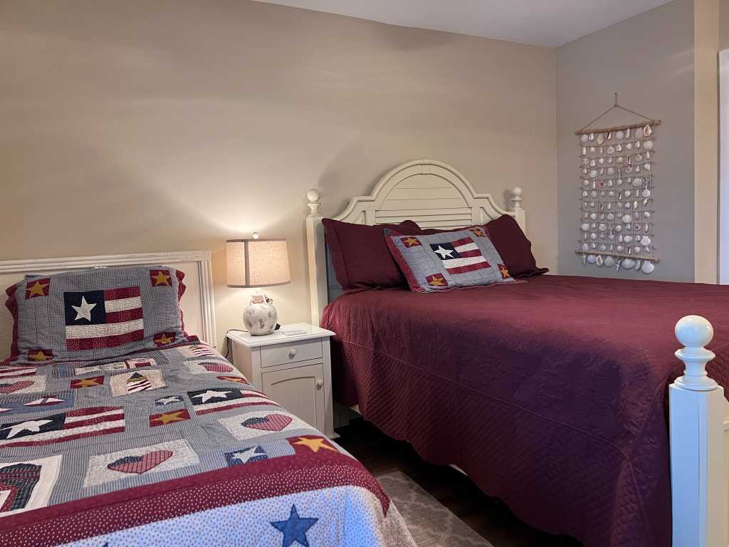 The front bedroom boasts a new Queen-sized bed (2022) and bedding as well as a twin-sized bed.