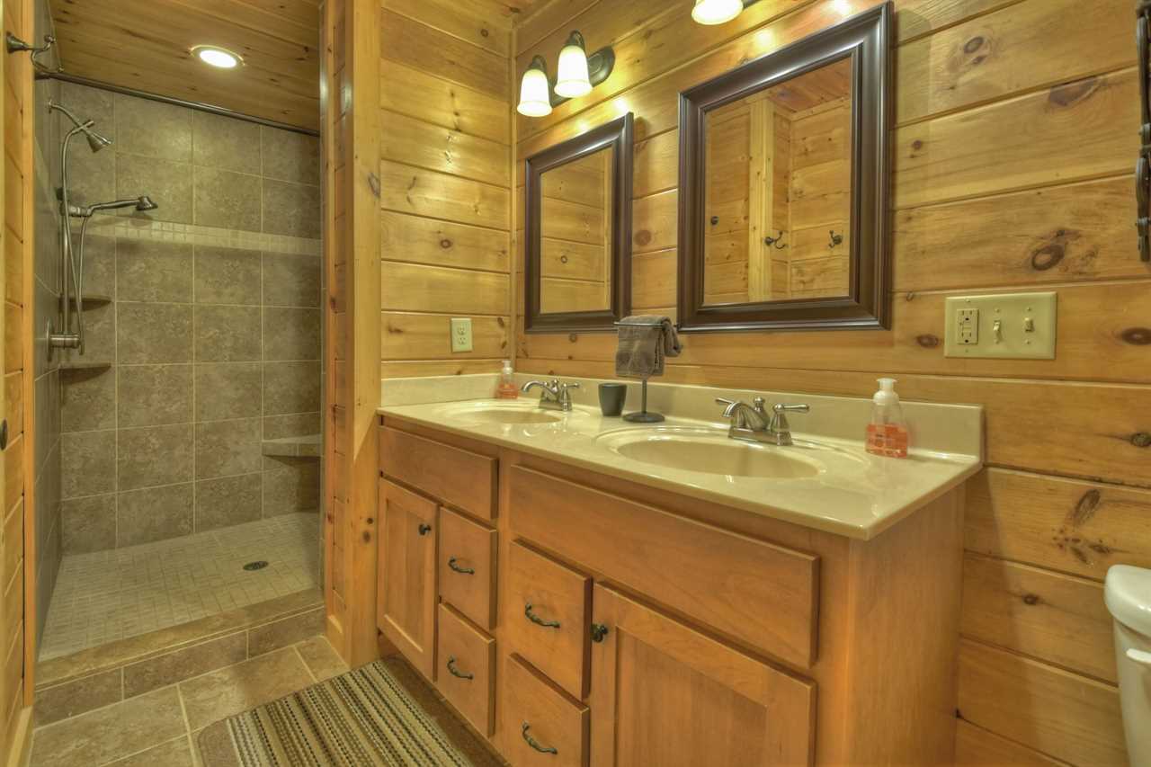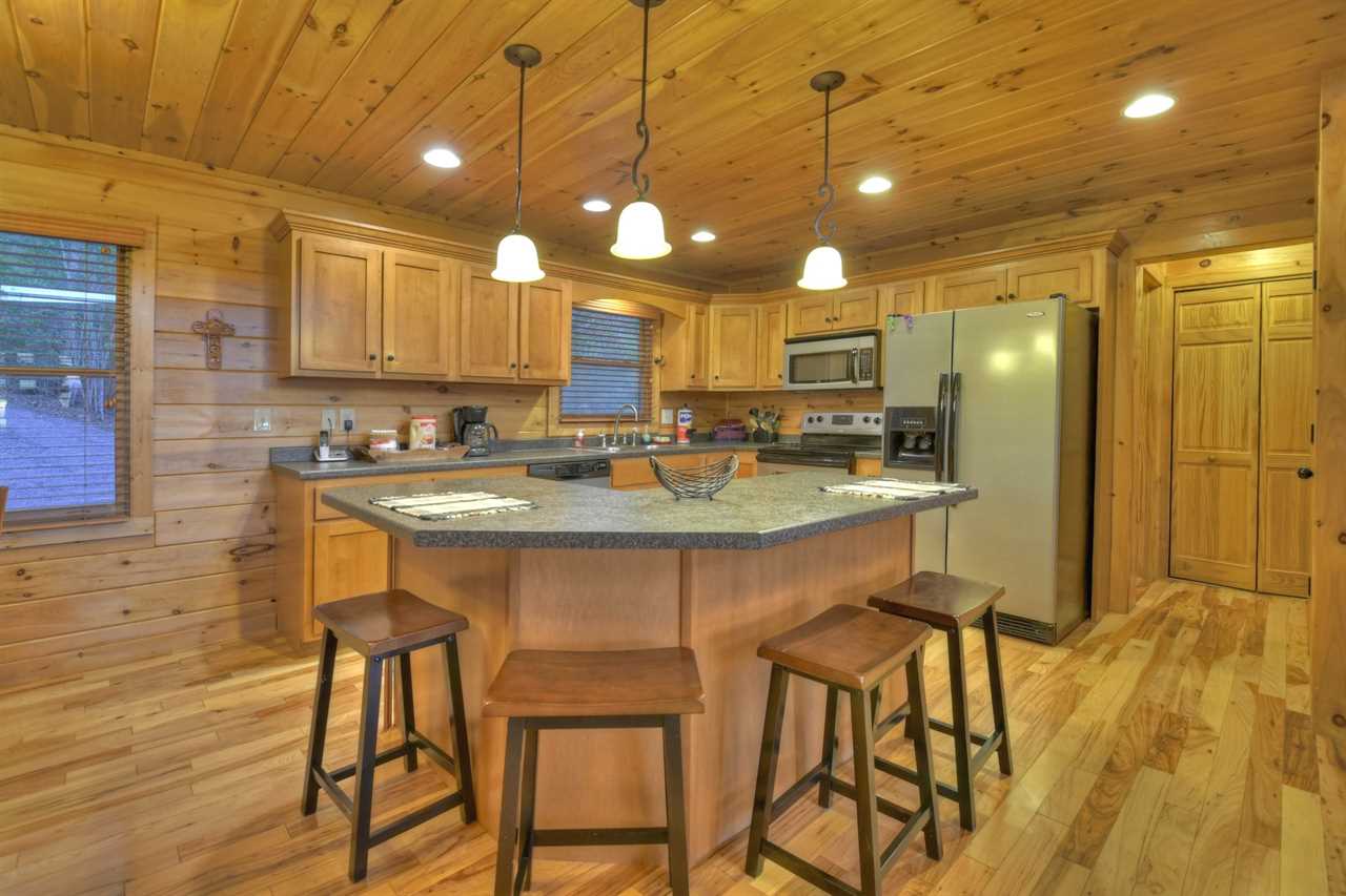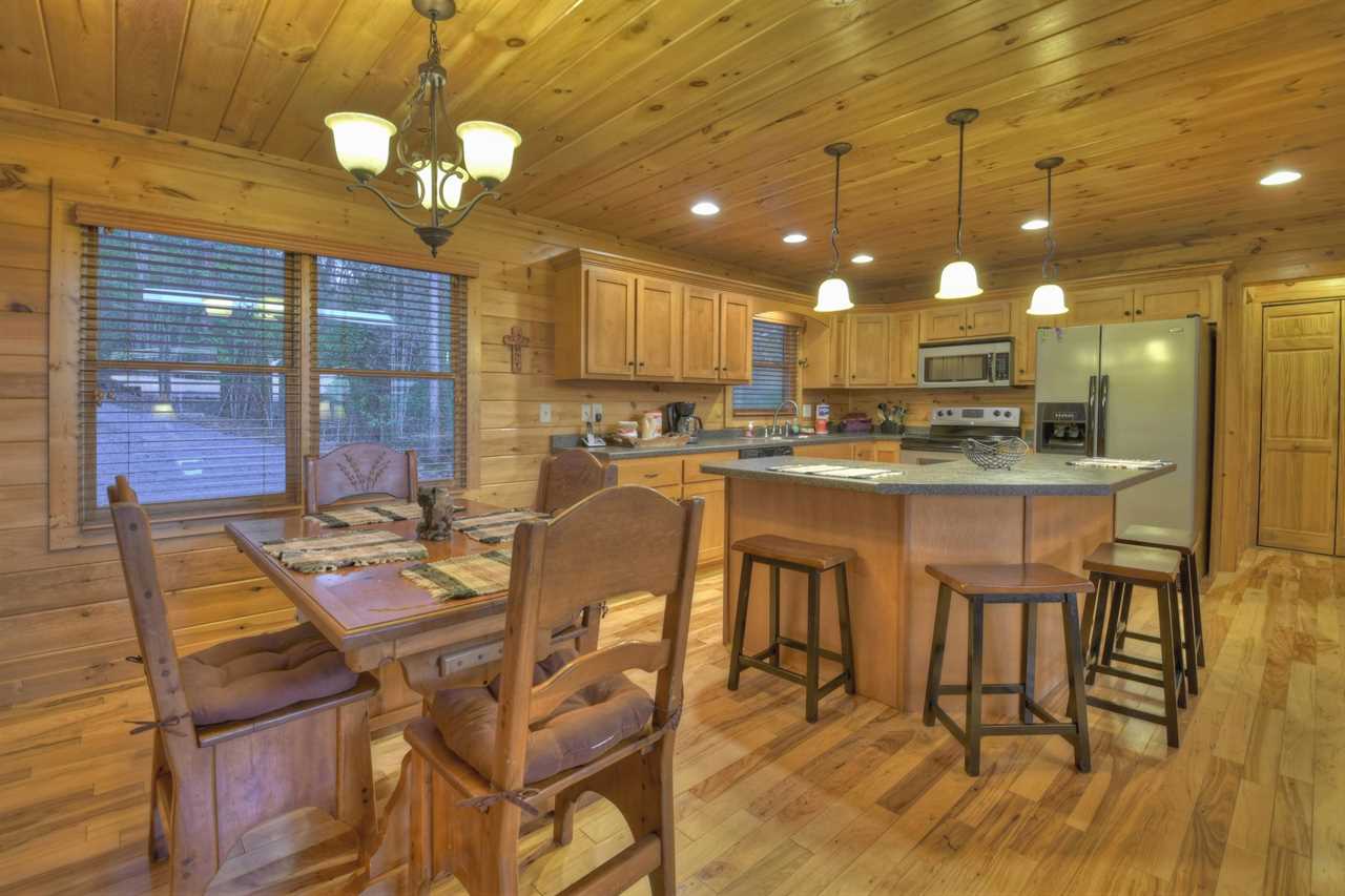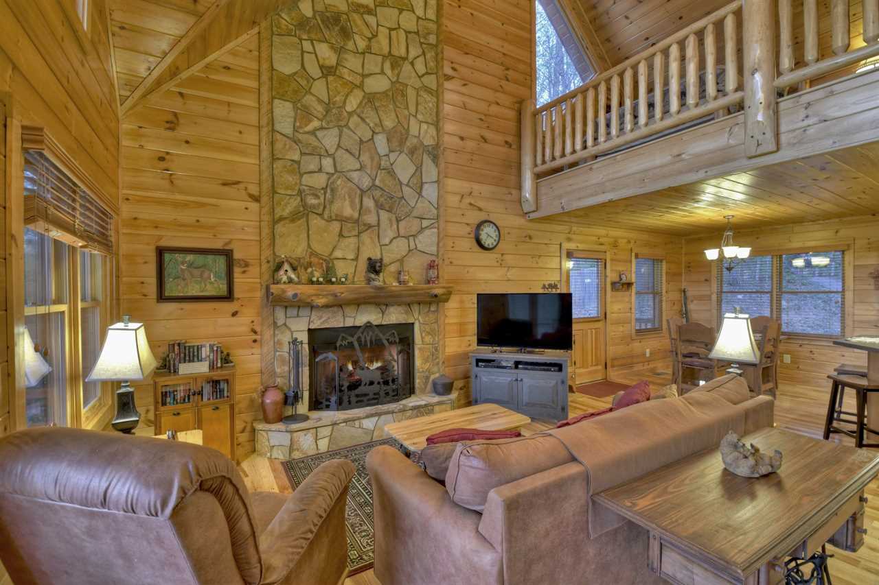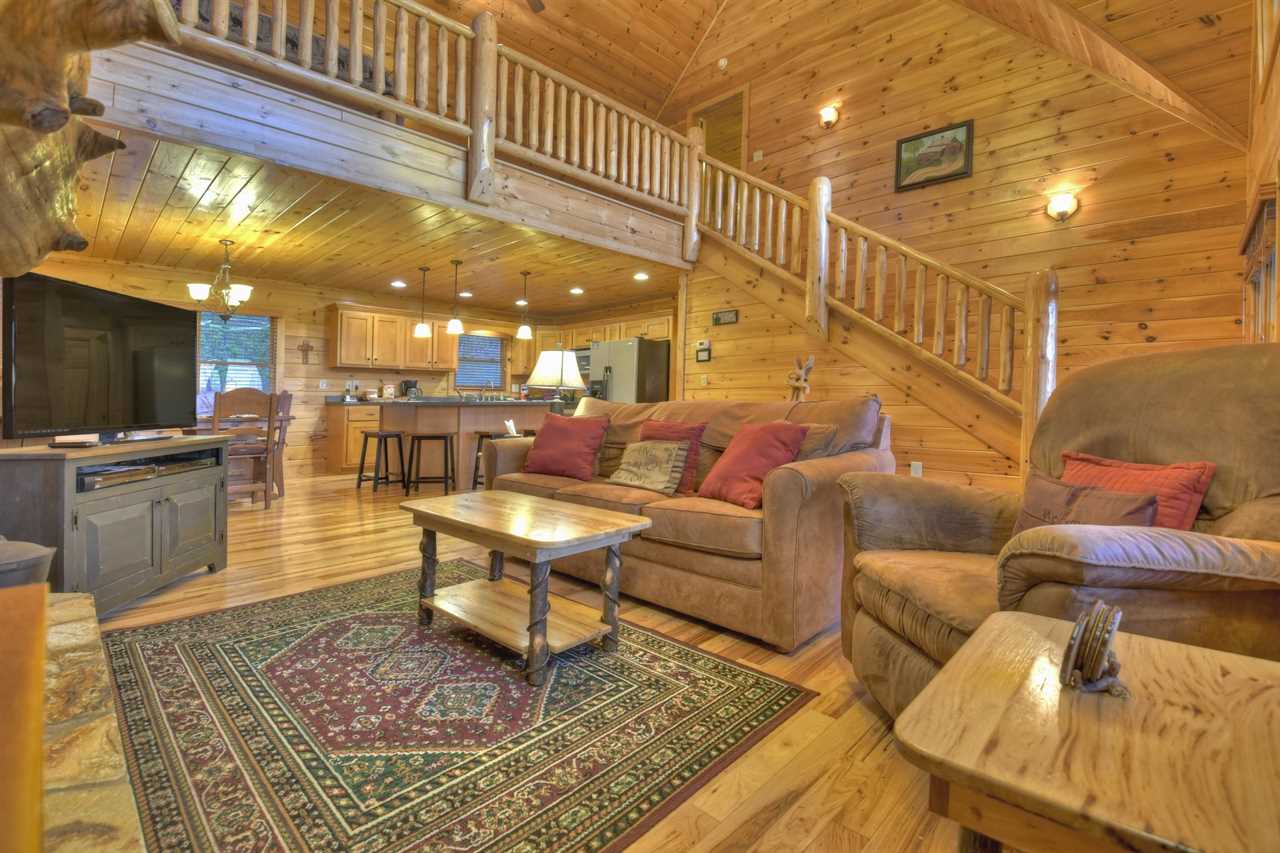 The outdoor amenities at Sweet Seclusion will pull you in, with sprawling decks where you can relax, rocking chairs, a picnic table and grill for outdoor meals, and a nice yard where you can throw around a ball and play. At night, gather around the firepit to chat with friends. The interiors are equally welcoming, with a great living room with leather seating, a floor-to-ceiling fireplace, a flatscreen TV, and an open floorplan.