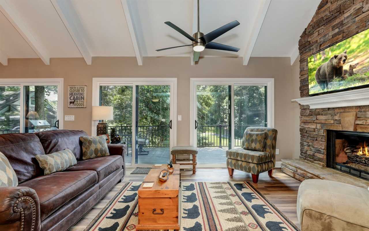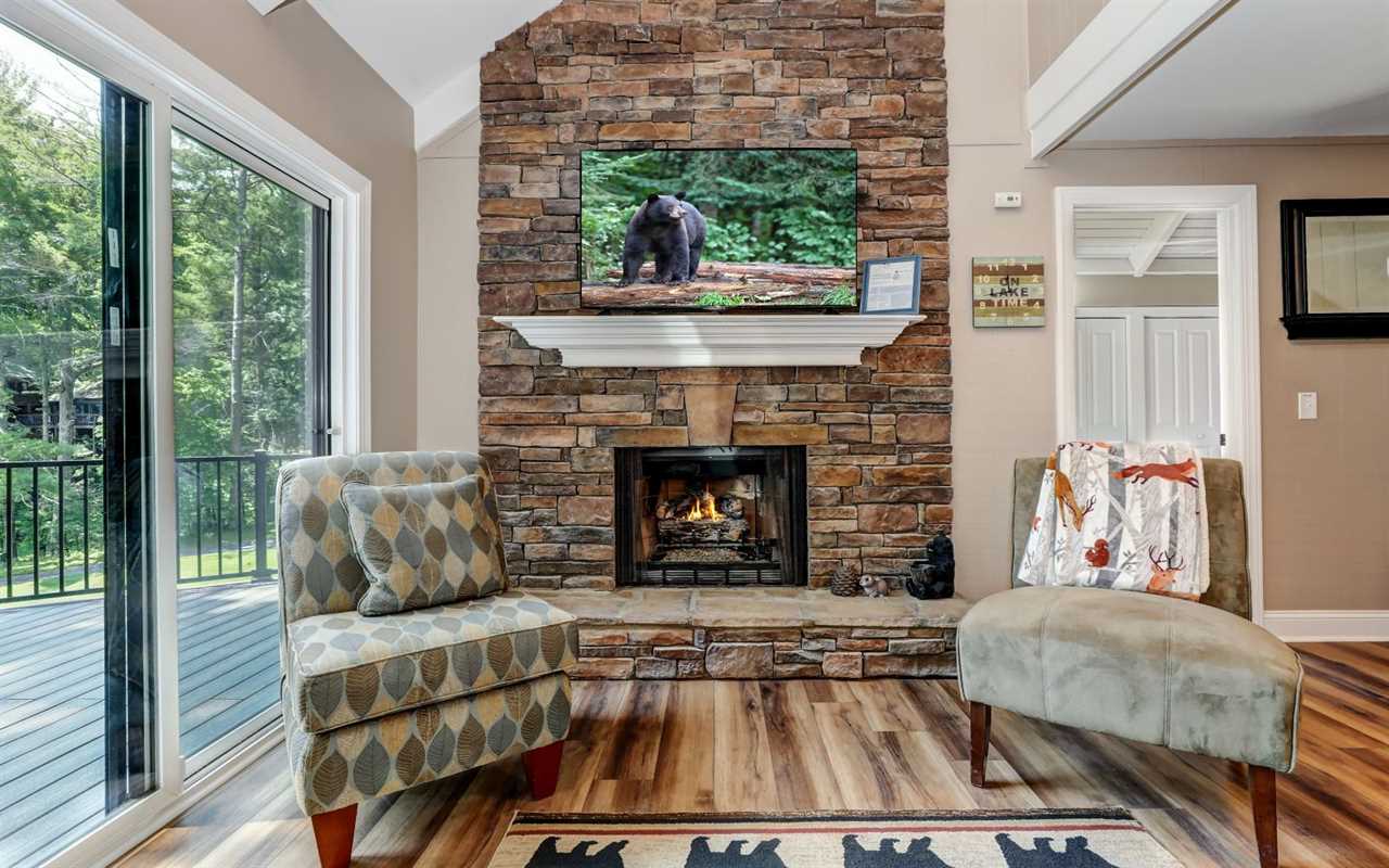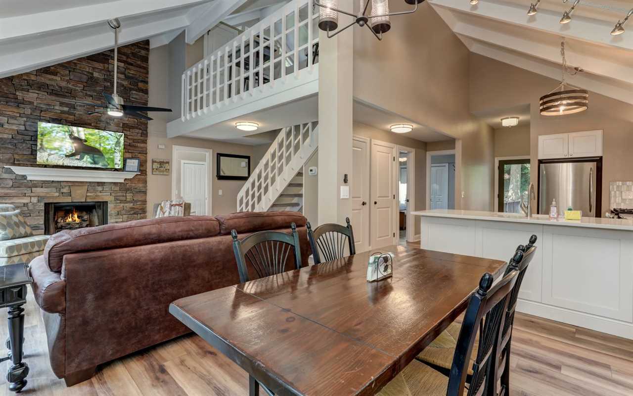View the championship golf course from your open decks, where you can sip morning coffee or fire up the gas grill and dine at the outdoor table. On cool evenings, light a fire in the stone (gas) fireplace to pair with wine, dessert, a good book, or a DVD film on the big screen TV in the living room. You can set up board games at the table between mealtimes, with snacks and drinks prepared in the fully equipped kitchen at your Big Canoe rental.