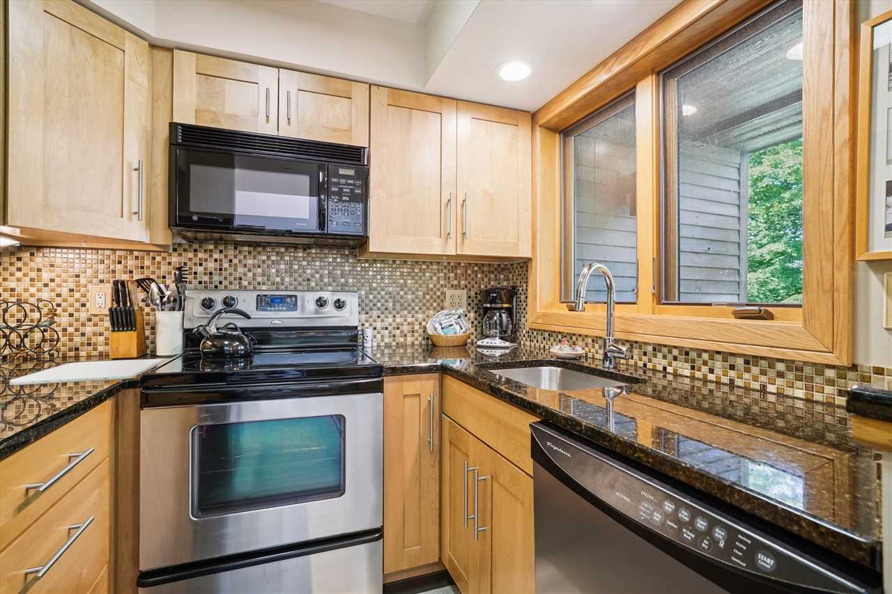 The inviting living room features a cozy wood-burning fireplace, a flat-screen TV, and a Queen sleeper sofa, creating a warm space to relax after a day of adventure. The dining area, with seating for 6, is perfect for enjoying meals together. The fully equipped kitchen boasts a flat-top electric range, microwave, dishwasher, 4-slice toaster, toaster oven, and a 12-cup coffee maker, ensuring you have everything you need for meal preparation.