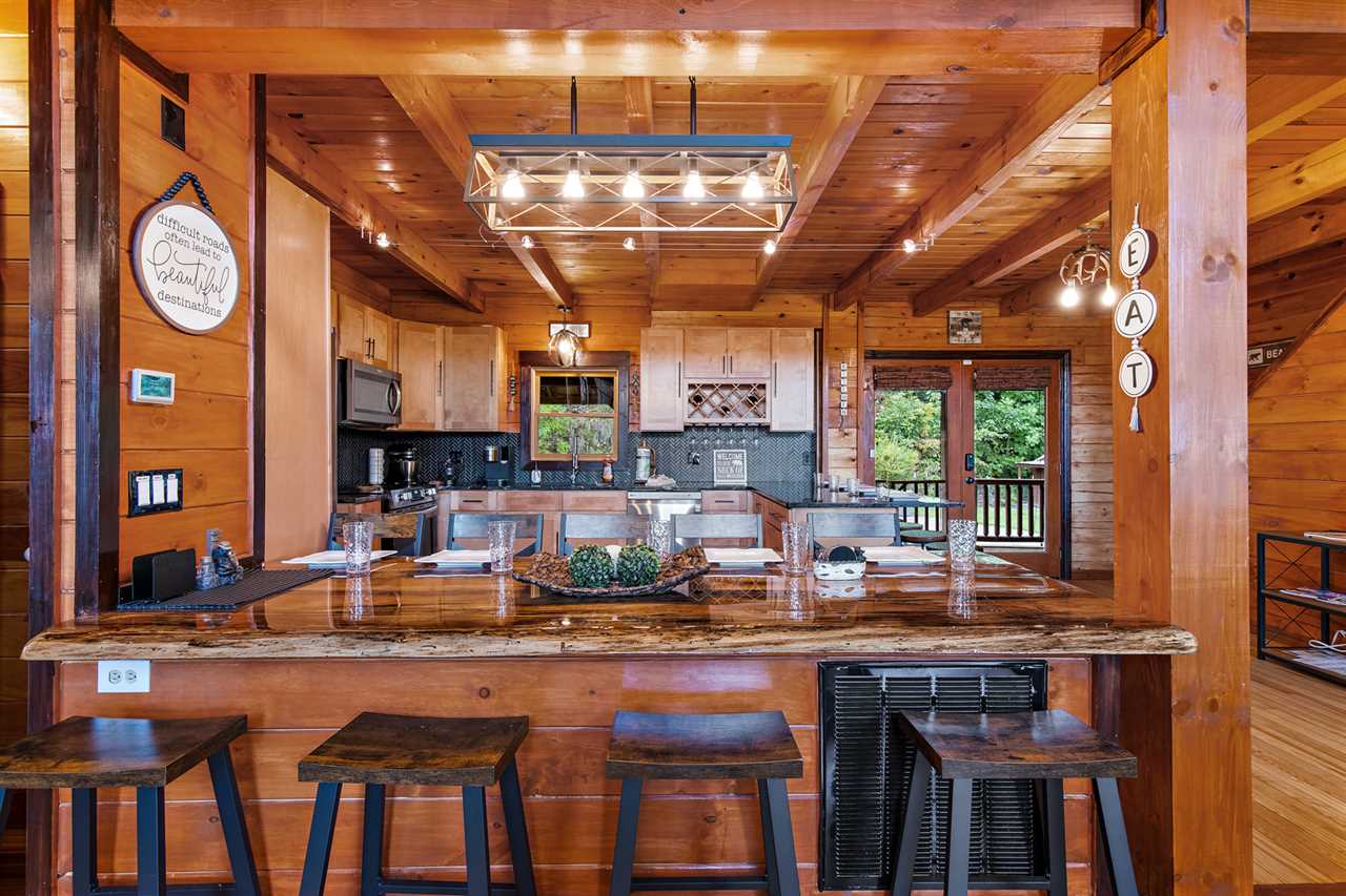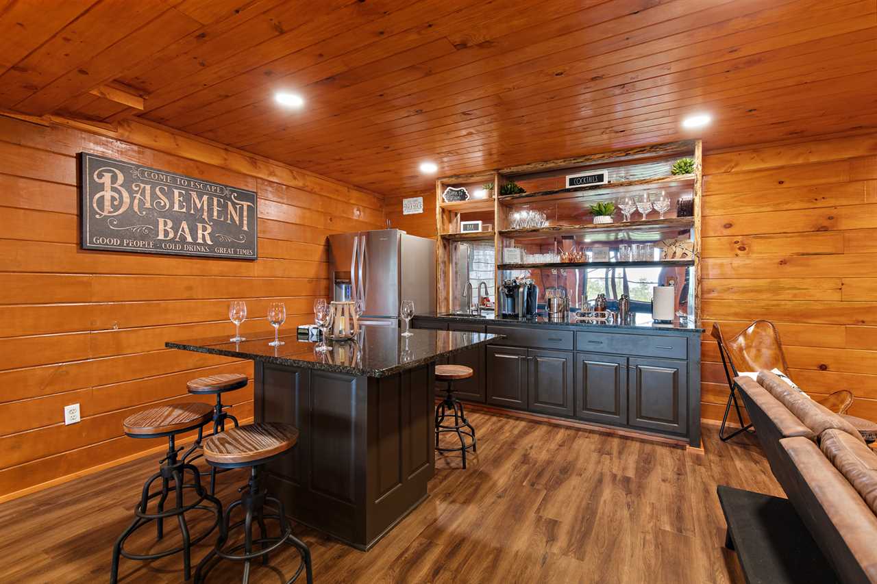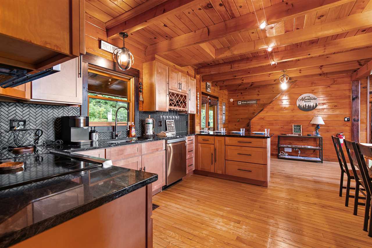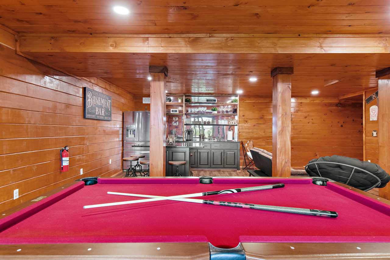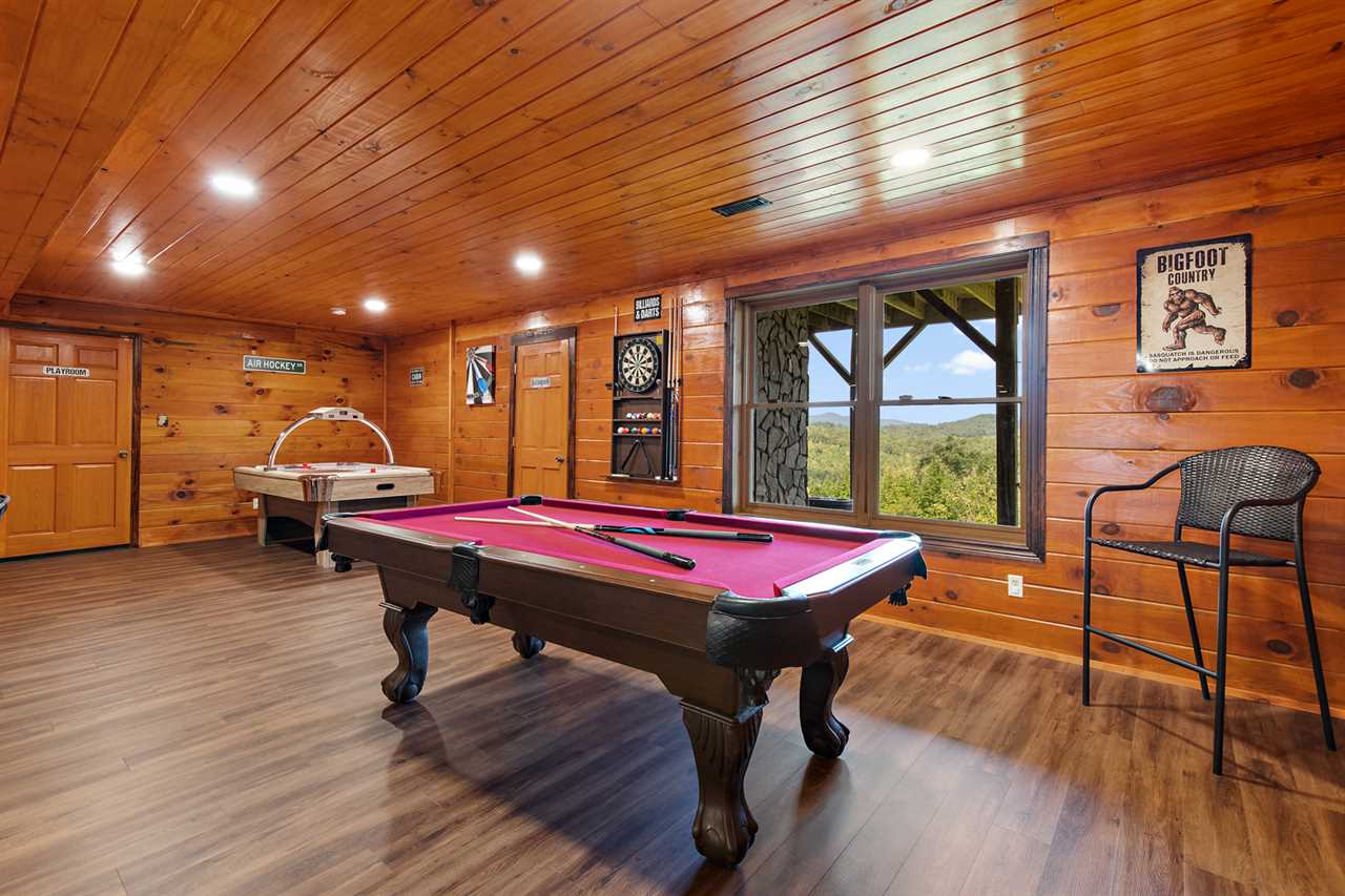 The main level features an open-concept living space with comfy leather seating around a gas fireplace and large flat-screen TV. Beyond the living room is the well-equipped kitchen with countertop dining overlooking the kitchen and living area. The living room opens to the partially covered wrap-around deck with an outdoor dining table, gas grill, and hot tub. A second living area on the lower level includes another large flat-screen TV, a pool table, an air hockey table, a dart game, and a bar. The lower level also features a secondary game room with a foosball table, a basketball game, and a kid's ball pit and toys.